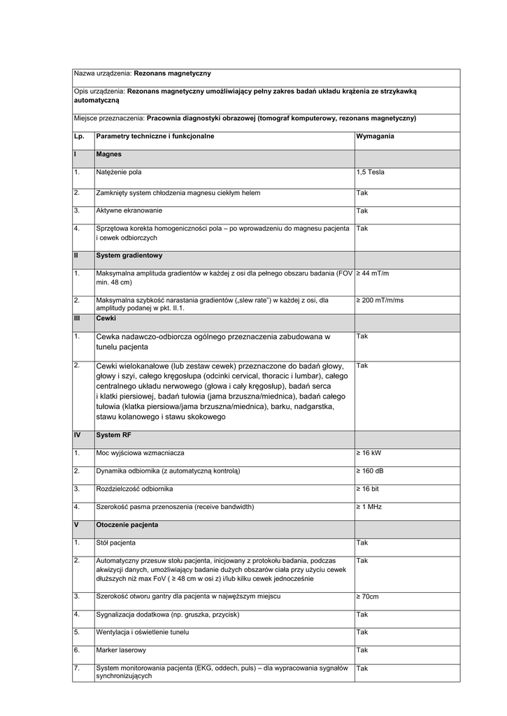 Nazwa urządzenia: Rezonans magnetyczny Opis urządzenia: Rezonans magnetyczny umożliwiający pełny zakres badań układu krążenia ze strzykawką automatyczną Miejsce przeznaczenia: Pracownia diagnostyki obrazowej (tomograf komputerowy, rezonans magnetyczny) Lp. Parametry techniczne i funkcjonalne I Magnes 1. Natężenie pola 1,5 Tesla 2. Zamknięty system chłodzenia magnesu ciekłym helem Tak 3. Aktywne ekranowanie Tak 4. Sprzętowa korekta homogeniczności pola – po wprowadzeniu do magnesu pacjenta i cewek odbiorczych Tak II System gradientowy 1. Maksymalna amplituda gradientów w każdej z osi dla pełnego obszaru badania (FOV ≥ 44 mT/m min. 48 cm) 2. Maksymalna szybkość narastania gradientów („slew rate”) w każdej z osi, dla amplitudy podanej w pkt. II.1. Cewki ≥ 200 mT/m/ms 1. Cewka nadawczo-odbiorcza ogólnego przeznaczenia zabudowana w tunelu pacjenta Tak 2. Cewki wielokanałowe (lub zestaw cewek) przeznaczone do badań głowy, głowy i szyi, całego kręgosłupa (odcinki cervical, thoracic i lumbar), całego centralnego układu nerwowego (głowa i cały kręgosłup), badań serca i klatki piersiowej, badań tułowia (jama brzuszna/miednica), badań całego tułowia (klatka piersiowa/jama brzuszna/miednica), barku, nadgarstka, stawu kolanowego i stawu skokowego Tak IV System RF 1. Moc wyjściowa wzmacniacza ≥ 16 kW 2. Dynamika odbiornika (z automatyczną kontrolą) ≥ 160 dB 3. Rozdzielczość odbiornika ≥ 16 bit 4. Szerokość pasma przenoszenia (receive bandwidth) ≥ 1 MHz V Otoczenie pacjenta 1. Stół pacjenta Tak 2. Automatyczny przesuw stołu pacjenta, inicjowany z protokołu badania, podczas akwizycji danych, umożliwiający badanie dużych obszarów ciała przy użyciu cewek dłuższych niż max FoV ( ≥ 48 cm w osi z) i/lub kilku cewek jednocześnie Tak 3. Szerokość otworu gantry dla pacjenta w najwęższym miejscu ≥ 70cm 4. Sygnalizacja dodatkowa (np. gruszka, przycisk) Tak 5. Wentylacja i oświetlenie tunelu Tak 6. Marker laserowy Tak 7. System monitorowania pacjenta (EKG, oddech, puls) – dla wypracowania sygnałów synchronizujących Tak III Wymagania 8. Dwukierunkowy interkom do komunikacji z pacjentem Tak 9. Kamera TV do obserwacji pacjenta w tunelu z monitorem w pomieszczeniu operatorskim Tak 10. Słuchawki tłumiące hałas dla pacjenta z możliwością podłączenia odsłuchu np. muzyki i komunikacji z pacjentem Tak 11. Wyświetlacz zintegrowany z obudową magnesu umożliwiający kontrolę funkcji aparatu MR Tak VI Aplikacje kliniczne 1. Badania neurologiczne i naczyniowe Tak 2. Rutynowe badania neurologiczne Tak 3. Badania przepływu płynu mózgowo-rdzeniowego wraz z oceną ilościową Tak 4. Obrazowanie dyfuzji (DWI) Tak 5. Obrazowanie perfuzji (PWI) Tak 6. Obrazowanie podatności magnetycznej (SWI) Tak 7. Obrazowanie naczyń - angiografia (MRA) i wenografia Tak 8. Techniki bezkontrastowe (non ce-MRA) Tak 9. Bezkontrastowa technika typu Time-of-Flight (ToF) 2D i 3D przeznaczona do obrazowania tętniczych i żylnych naczyń neuro Tak 10. Bezkontrastowa technika typu Phase Contrast MRA (PC) 2D i 3D przeznaczona do obrazowania dużych naczyń abdominalnych, tętniczych i żylnych Tak 11. Techniki kontrastowe (ce-MRA) Tak 12. Dynamiczna technika ce-MRA 3D Tak 13. Dynamiczne technika Ce-MRA 4D (3D dynamiczne w czasie) Tak 14. Automatyczne śledzenie napływu środka kontrastowego Tak 15. Badania kardiologiczne (CMR) – pełny zakres Tak 16. Obrazowanie morfologii serca w badaniach CMR Tak 17. Badania CMR z tłumieniem sygnału krwi (Dark Blood Imaging) Tak 18. Obrazowanie funkcji serca w badaniach CMR z opcją dynamiczną i prezentacją w formie CINE Tak 19. Badania z kodowaniem sylwetki mięśnia sercowego w przekroju 2D wzorem geometrycznym (technika taggingowa) Tak 20. Obrazowanie przepływów w sercu i naczyniach wraz z pomiarami ilościowymi Tak 21. Obrazowanie perfuzji pierwszego przejścia środka cieniującego w badaniach CMR (First Pass Perfusion Imaging) Tak 22. Obrazowanie późnego kontrastowania po przejściu środka cieniującego (Late Enhancement Imaging) – segmented oraz single-shot Tak 23. Koronarografia MR Tak 24. Badania przepływu krwi wraz z oceną ilościową Tak 25. Badania w obszarze abdominalnym Tak 26. Pakiet do dynamicznych badań wątroby Tak 27. Pankreocholangiografia MR Tak 28. Badania ortopedyczne Tak 29. Podstawowe i zaawansowane protokoły i sekwencje pomiarowe Tak 30. Badania barku Tak 31. Badania stawu kolanowego Tak 32. Badania stawu skokowego Tak 33. Badania nadgarstka Tak 34. Obrazowanie równoległe Tak 35. Techniki spektralnej saturacji Tak 36. Częstotliwościowo selektywna saturacja tłuszczu Tak 37. Częstotliwościowo selektywna saturacja wody Tak VII Sekwencje 1. Spin Echo (SE) Tak 2. Inversion Recovery (IR) Tak 3. Gradient Echo (GRE) Tak 4. 2D i 3D SPGR, FLASH, T1-FFE lub odpowiednik Tak 5. 2D i 3D GRASS, FISP, FFE lub odpowiednik Tak 6. 2D i 3D Fast GRE z impulsami preparacyjnymi (TurboFLASH, MPGRASS, TFE lub odpowiednik) Tak 7. 2D i 3D GRE z full transverse rephasing (TrueFISP, Balanced FFE, FIESTA lub odpowiednik) Tak 8. 2D i 3D GRE z RF-rephasing (PSIF, SSFP, T2-FFE lub odpowiednik) Tak 9. Turbo Spin Echo, Fast Spin Echo (TSE, FSE) Tak 10. Multi-Shot Tak 11. Single-Shot Tak VIII Parametry akwizycyjne 1. Maks. FoV Tak 2. Maks. FoV w płaszczyźnie poprzecznej (x, y) ≥ 50 cm 3. Maks. FoV w osi podłużnej (z) – statyczny ≥ 45 cm 4. Matryca akwizycyjna 1024 x 1024, bez interpolacji Tak 5. Min. Grubość warstwy (skany 2D) ≤ 0,5 mm 6. Min. Grubość warstwy (skany 3D) ≤ 0,1 mm 7. Parametry sekwencji Tak 8. EPI: min TR dla matrycy 256 x 256 ≤ 10 ms 9. EPI: min TE dla matrycy 256 x 256 ≤ 2,7 ms 10. 3D Gradient Echo (3D GRE): min TR dla matrycy 256 x 256 ≤ 1,2 ms ≤ 0,5 ms 11. 3D Gradient Echo (3D GRE): min TE dla matrycy 256 x 256 12. Maks. Współczynnik przyspieszenia dla sekwencji Turbo Spin Echo / Fast Spin Echo ≥ 512 (TSE / FSE) 13. Maks. Współczynnik Echo Plana