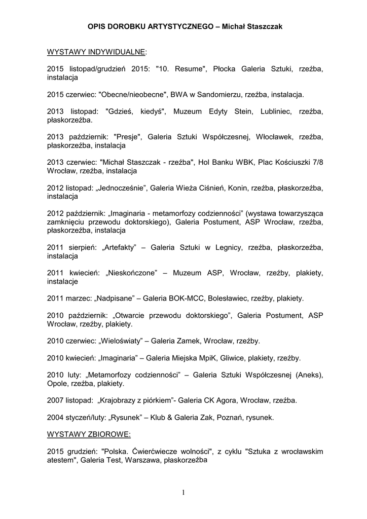 OPIS DOROBKU ARTYSTYCZNEGO – Michał Staszczak WYSTAWY INDYWIDUALNE: 2015 listopad/grudzień 2015: "10. Resume", Płocka Galeria Sztuki, rzeźba, instalacja 2015 czerwiec: "Obecne/nieobecne", BWA w Sandomierzu, rzeźba, instalacja. 2013 listopad: "Gdzieś, kiedyś", Muzeum Edyty Stein, Lubliniec, rzeźba, płaskorzeźba. 2013 październik: "Presje", Galeria Sztuki Współczesnej, Włocławek, rzeźba, płaskorzeźba, instalacja 2013 czerwiec: "Michał Staszczak - rzeźba", Hol Banku WBK, Plac Kościuszki 7/8 Wrocław, rzeźba, instalacja 2012 listopad: „Jednocześnie”, Galeria Wieża Ciśnień, Konin, rzeźba, płaskorzeźba, instalacja 2012 październik: „Imaginaria - metamorfozy codzienności” (wystawa towarzysząca zamknięciu przewodu doktorskiego), Galeria Postument, ASP Wrocław, rzeźba, płaskorzeźba, instalacja 2011 sierpień: „Artefakty” – Galeria Sztuki w Legnicy, rzeźba, płaskorzeźba, instalacja 2011 kwiecień: „Nieskończone” – Muzeum ASP, Wrocław, rzeźby, plakiety, instalacje 2011 marzec: „Nadpisane” – Galeria BOK-MCC, Bolesławiec, rzeźby, plakiety. 2010 październik: „Otwarcie przewodu doktorskiego”, Galeria Postument, ASP Wrocław, rzeźby, plakiety. 2010 czerwiec: „Wieloświaty” – Galeria Zamek, Wrocław, rzeźby. 2010 kwiecień: „Imaginaria” – Galeria Miejska MpiK, Gliwice, plakiety, rzeźby. 2010 luty: „Metamorfozy codzienności” – Galeria Sztuki Współczesnej (Aneks), Opole, rzeźba, plakiety. 2007 listopad: „Krajobrazy z piórkiem”- Galeria CK Agora, Wrocław, rzeźba. 2004 styczeń/luty: „Rysunek” – Klub & Galeria Zak, Poznań, rysunek. WYSTAWY ZBIOROWE: 2015 grudzień: "Polska. Ćwierćwiecze wolności", z cyklu "Sztuka z wrocławskim atestem", Galeria Test, Warszawa, płaskorzeźba 1 2015 luty: "5!" , Dom Koncepcji, Warszawa, rzeźba, płaskorzeźba. 2014 czerwiec: "Flagi sztuki", wystawa na statku Goplana w ramach Podwodnego Wrocławia, plakat 2014 czerwiec: "Do siedmiu razy sztuka", Browar Mieszczański, Wrocław 2014 kwiecień: Mutazioni in Alluminio, Spacio Comel, Latina, Włochy, płaskorzeźba 2013 czerwiec: "Impromptu Śląskie", Klub Pracowników Politechniki Śląskiej, Gliwice, rzeźba. 2013 luty: "Trzy wymiary rzeźby", Centrum Rzeźby Polskiej w Orońsku, instalacja. 2012 październik: "Wolna przestrzeń", Rezydencja Piasek, Wrocław, instalacja. 2012 kwiecień: OD DUNAJA, VLTAVY A VISLY Medailéri a ich diela / X. jubilejná výstava , Muzeum Monet i Medali w Kremnicy, Słowacja. 2012 marzec: „NOWE OTWARCIE”, Galeria Związku Polskich Artystów Plastyków Okręgu Warszawskiego 2012 luty: Mezi Dunajem Vltavou a Wislou, Galeria Słowackiego Muzeum, Uherske Hradiste, Czechy 2011 listopad: Znad Dunaju Wełtawy i Wisły – medalierzy i ich dzieła, Pałac Królewski, Wrocław 2011 wrzesień: „Sztuka kluczem do natury” – wystawa towarzysząca Dolnośląskiemu Festiwalowi Nauki, Muzeum ASP we Wrocławiu, rzeźba, instalacja. 2011 wrzesień: „Wdowom Katyńskim” – wystawa pokonkursowa, Warszawa, medal. 2011 maj: „Po setce – wystawa jubileuszowa ZPAP”, Arsenał, Wrocław, rzeźba. 2011 luty: „Nagrody roku 2010 ZPAP – wystawa”, Galeria „Na Solnym”, Wrocław, rzeźba. 2010 listopad: „Wrocław nie do Poznania”, wystawa dydaktyków ASP Wrocław, Galeria Słodownia, Poznań, (instalacja rzeźbiarska – Aluminacja) 2010 wrzesień: „Industrial Art”, towarzysząca wystawie COP dla przyszłości, Stalowa Wola. 2010 wrzesień: „Odlitky pro radost, krásu, potěšení i užitek”, Alucast, Tupesy, Czechy. 2010 lipiec: "PO-WIETRZE rzeźba i żywioł”, Galeria Sztuki, Legnica. 2010 czerwiec : Rzeźba dla Zaułków, Jatki, Wrocław. 2010 maj: Znad Dunaju, Wełtawy i Wisły. Medalierzy i ich dzieła. Muzeum Miejskie Wrocławia, Stary Ratusz. 2 2010 kwiecień: Struktura rzeczy. Struktura emocji. Struktura., BWA Bydgoszcz. 2010 styczeń: Kaloryfer Inaczej – wystawa prac powstałych podczas 3 Festiwalu Wysokich Temperatur, Galeria EMDES, Wrocław. 2009 sierpień – październik: Wystawa prac powstałych na 10 Międzynarodowym Sympozjum Medali, Plakiet i Małych Form Rzeźbiarskich w Uherskem Hradiste, Slovacke Muzeum, Czechy. 2009 marzec: Wroclavsky bronz – Slovacke Museum – Uherske Hradiste. 2008 lipiec: Wrocławska ASP prezentuje MALARSTWO – GRAFIKĘ – RZEŹBĘ, Pałac Sztuki, Kraków. 2008 marzec: DWA WYMIARY RZEŹBY wystawa prac pedagogów ASP Wrocław i ASP Gdańsk we Wrocławiu. 2007 sierpień – październik: Wystawa prac powstałych na 9 Międzynarodowym Sympozjum Medali, Plakiet i Małych Form Rzeźbiarskich w Uherskem Hradiste, Slovacke Muzeum, Czechy. 2006 marzec: „Pro figura V” – Rostock, Niemcy, rzeźba. 2005 lipiec: wystawa dyplomowa – Galeria BWA we Wrocławiu, rzeźba. 2005 lipiec: wystawa „My z Wrocławia”- Galeria POSK, LONDYN, rysunek i rzeźba. 2005 luty: „Wahadło” wystawa zbiorowa studentów 5 roku rzeźby, aula ASP. 2004 luty/marzec: „...Już Rok...”- Klub & Galeria Zak, Poznań, rysunek. 2004 październik: „Powietrze i jego brak”– Galeria – Kolegium Europy Wschodniej we Wrocławiu, (wystawa poplenerowa ceramiki). 2004 marzec: „Wystawa Prac Ceramicznych Koła Naukowego Forma”- Galeria OKO, Oława, ceramika. 2004 marzec: „Wystawa Prac Powstałych na Plenerze Odlewniczym w Gdańsku” – Ekspozycja przed rektoratem ASP Wrocław, rzeźba. 2004 styczeń: „Wystawa Prac Ceramicznych Koła Naukowego Forma”– Galeria Miejsce dla Sztuki, Wrocław, ceramika. 2003 lipiec: „Wystawa Studentów ASP Wrocław w Lipsku”, Lipsk, rysunek. 2003 marzec: „Moje Miasto”- Galeria pod Plafonem, Wrocław, rysunek. 2002 listopad: „Pędzlem i Ołówkiem” – Galeria Miejsce dla Sztuki, Wrocław, rysunek. 2002 maj: „hasART” – Galeria Miejska, Wrocław, instalacja. 3 WYRÓŻNIENIA I STYPENDIA: 2014 kwiecień: laureat międzynarodowego konkursu Premio Comel 'Vanna Migliorin', Mutazioni in Alluminio, Latin