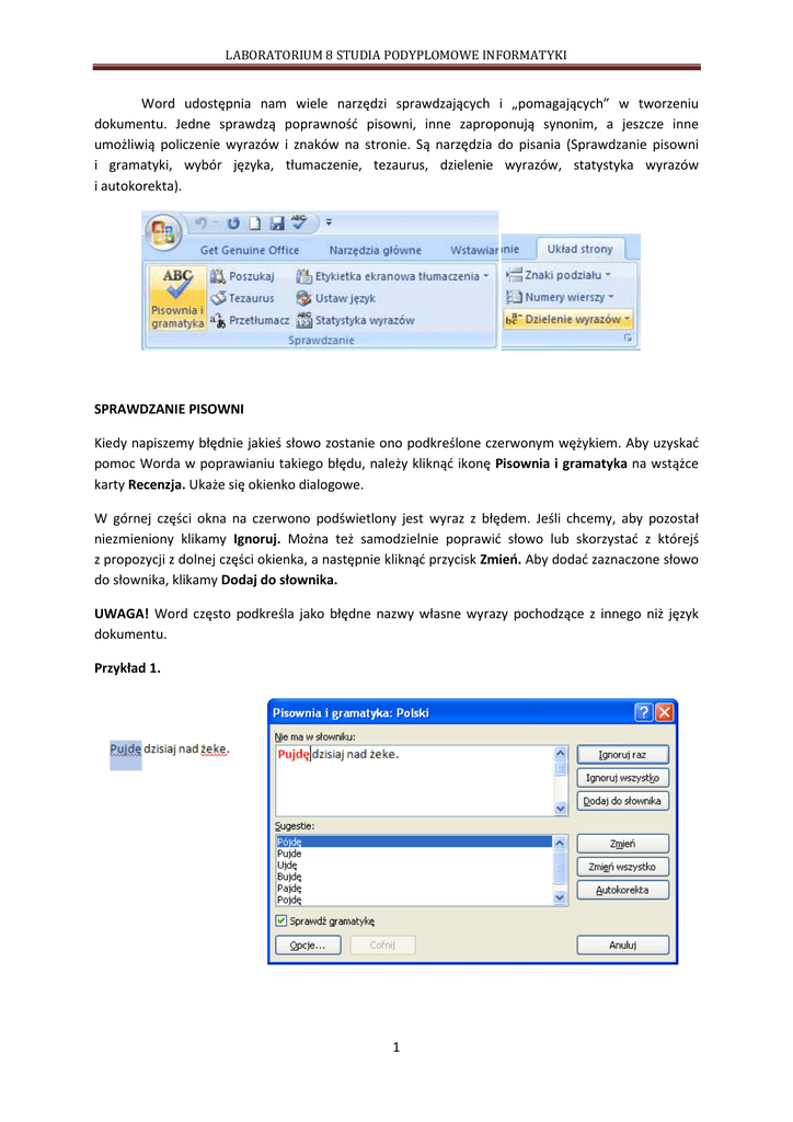 LABORATORIUM 8 STUDIA PODYPLOMOWE INFORMATYKI Word udostępnia nam wiele narzędzi sprawdzających i „pomagających” w tworzeniu dokumentu. Jedne sprawdzą poprawność pisowni, inne zaproponują synonim, a jeszcze inne umożliwią policzenie wyrazów i znaków na stronie. Są narzędzia do pisania (Sprawdzanie pisowni i gramatyki, wybór języka, tłumaczenie, tezaurus, dzielenie wyrazów, statystyka wyrazów i autokorekta). SPRAWDZANIE PISOWNI Kiedy napiszemy błędnie jakieś słowo zostanie ono podkreślone czerwonym wężykiem. Aby uzyskać pomoc Worda w poprawianiu takiego błędu, należy kliknąć ikonę Pisownia i gramatyka na wstążce karty Recenzja. Ukaże się okienko dialogowe. W górnej części okna na czerwono podświetlony jest wyraz z błędem. Jeśli chcemy, aby pozostał niezmieniony klikamy Ignoruj. Można też samodzielnie poprawić słowo lub skorzystać z którejś z propozycji z dolnej części okienka, a następnie kliknąć przycisk Zmień. Aby dodać zaznaczone słowo do słownika, klikamy Dodaj do słownika. UWAGA! Word często podkreśla jako błędne nazwy własne wyrazy pochodzące z innego niż język dokumentu. Przykład 1. 1 LABORATORIUM 8 STUDIA PODYPLOMOWE INFORMATYKI SPRAWDZANIE PISOWNI I GRAMATYKI Aby ustawić opcje sprawdzania pisowni i gramatyki wywołujemy okno Opcje programu Word na zakładce Sprawdzanie (po wywołaniu okna sprawdzania pisowni klikamy przycisk Opcje lub rozwijamy menu przycisku Office i klikamy przycisk Opcje programu Word). Określamy w nim w jaki sposób program ma wykonać sprawdzanie i jakie zasady wziąć pod uwagę. Możemy też wybrać styl wypowiedzi np., oficjalny, jeśli piszemy pismo do urzędu lub potoczny jeśli jest to list do przyjaciela. Wtedy program nie uzna za błąd np. kolokwializmów czy archaizmów. Możemy też stworzyć własny styl. Sprawdzanie pisowni i gramatyki według wcześniej ustalonych reguł włączamy przyciskiem F7. WYBÓR JĘZYKA Wybierając w grupie Sprawdzanie na wstążce karty Recenzja przycisk Ustaw język, włączamy okienko wyboru języka. Według jego reguł będzie przeprowadzone sprawdzanie pisowni i gramatyki. Sprawdzanie pisowni i gramatyki działa tylko dla języków, które przy nazwie mają znaczek z literkami ABC . Standardowo są to angielski, niemiecki i polski. Możemy dokupić i zainstalować słowniki do innych języków. Na górze listy są słowniki ostatnio używane. 2 LABORATORIUM 8 STUDIA PODYPLOMOWE INFORMATYKI 3