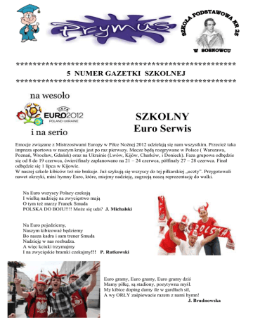 **************************************************** 5 NUMER GAZETKI SZKOLNEJ **************************************************** SZKOLNY Euro Serwis Emocje związane z Mistrzostwami Europy w Piłce Nożnej 2012 udzielają się nam wszystkim. Przecież taka impreza sportowa w naszym kraju jest po raz pierwszy. Mecze będą rozgrywane w Polsce ( Warszawa, Poznań, Wrocław, Gdańsk) oraz na Ukrainie (Lwów, Kijów, Charków, i Donieck). Faza grupowa odbędzie się od 8 do 19 czerwca, ćwierćfinały zaplanowano na 21 – 24 czerwca, półfinały 27 – 28 czerwca. Finał odbędzie się 1 lipca w Kijowie. W naszej szkole kibiców też nie brakuje. Już szykują się wszyscy do tej piłkarskiej „uczty”. Przygotowali nawet okrzyki, mini hymny Euro, które, miejmy nadzieję, zagrzeją naszą reprezentację do walki. Na Euro wszyscy Polacy czekają I wielką nadzieję na zwycięstwo mają O tym też marzy Franek Smuda POLSKA DO BOJU!!!! Może się uda? J. Michalski Na Euro pojedziemy, Naszym kibicować będziemy Bo nasza kadra i sam trener Smuda Nadzieję w nas rozbudza. A więc kciuki trzymajmy I na zwycięskie bramki czekajmy!!! P. Rutkowski Euro gramy, Euro gramy, Euro gramy dziś Mamy piłkę, są stadiony, pozytywna myśl. My kibice doping damy ile w gardłach sił, A wy ORŁY zaśpiewacie razem z nami hymn! J. Brudnowska Euro 2012 już się rozpoczyna Wspaniale przygotowana polska drużyna. Błaszczykowski, Lewandowski gole strzelają Kibice z radości hymn śpiewają. Ręce w górę – nasi grają W pięknym stylu wygrywają I dużo radości nam dostarczają. My za nich kciuki trzymamy I na finał już czekamy. J. Szafraniec Już czujemy klimat EURO Pora wygrać UEFA berło Więc nasi kochani piłkarze – rodacy Bierzcie się do ostrej pracy. Lecz ostrzegamy!!! Gdy nie wygramy My kibice wam żyć nie damy. Koniec EURO będzie taki Polacy, Że wyrzucimy Grześka Lato z pracy. Orzełki po murawie biegają i modlitwę odmawiają. Tylko to im pozostało – Ojcze Nasz by się przydało. Koko koko hymn biesiadny, Mój nie spoko, mój jest ładny. A. Włodarczyk **************************************************** CZY WIECIE , ŻE........ Orangutany są bardziej podobne do nas , niż myślimy. Są sprytnymi zwierzętami, choć ich mózgi są zaledwie jednej trzeciej wielkości mózgu człowieka. Oczy nasze i oczy orangutana są naprawdę pełne wyrazu. Możesz odgadnąć, jak się czuje orangutan, patrząc mu w oczy. Twój nas i nos orangutana czują tak samo. Odrobinę różnią się wyglądem. Ich nosy są nieforemne. Ale czy każdy z nas ma kształtny nos? I jeszcze jedno :orangutany tak jak ludzie też czasem dłubią w nosie! Mnóstwo czasu spędzają na drzewach. Z gałęzi na gałąź przemieszczają się za pomocą rąk i nóg. A co z bagażem! Duże przedmioty Przenoszą ..... w buzi. Orangutany mają tę samą ilość zębów co Ty. (przygotowała Julia Bańczyk kl. Vą) **************************************************** Przysłowia są mądrością narodu. Czy na pewno je dobrze znamy? Oto przykłady z zeszytów uczniowskich kl. V- VI. Hałaśliwa woda brzegi rwie. Na strażaku czapka gore. Trafiła kosa na brzytwę. Mądry Polak po jedzeniu. Kto rano wstaje, temu ptaszki śpiewają. Nie ma zapałki bez ognia. Dzieci i ryby łatwo nie mają. Bez koła nie ma kołaczy. Kto pyta, ten wie. Jadącemu wiatr w oczy wieje. Ta krowa dużo mleka daje, która jest leniwa. Tonący chwyta się koła ratunkowego. Kto rano wstaje, temu czas. Kto daje i odbiera, tego życie poniewiera. Myszy tańczą, kiedy kot jest chory. Chińskiego muru nie przebijesz. Jak się domyślacie, przysłowia są niepoprawne. Ogłaszamy więc mini konkurs. Pierwsza osoba, która odgadnie te przysłowia, otrzyma nagrodę niespodziankę. Zgłoszenia przyjmuje Pani Ewa Przytuła. **************************************************** Gratulujemy naszym uczennicom, które zostały laureatkami Miejskiego Konkursu Ortograficznego: I miejsce i tytuł Sosnowieckiego Mistrza Ortografii zdobyła Marta Muszyńska II miejsce zajęła Ania Iwanek Nasz kolega Jakub Bagiński ukończył właśnie II rok Dąbrowskiego Uniwersytetu Dziecięcego. **************************************************** Za kilkanaście dni szóstoklasiści opuszcza mury naszej szkoły. Co chcieliby przekazać swoim młodszym kolegom, oto ich wskazówki , rady, refleksje : Życzę wszystkim uczniom samych pogodnych dni, dobrych ocen, mało prac domowych i uśmiechniętych nauczycieli. Marek J. My odejdziemy, Wy zostaniecie Dbajcie o szkołę i nauczycieli By długo jeszcze uczyć Was chcieli. Bo nauczyciel jak dobra mamaWychowuje szkolne dzieci I przykładem często świeci Żegnajcie nauczyciele i kochana szkoło! Myślę, że w gimnazjum też będzie wesoło. Wiktoris S. Drodzy Młodsi Koledzy! Uczcie się dużo, uczcie, przez życie śmiało kroczcie. Słuchajcie swoich nauczycieli, a dobre stopnie będziecie mieli. Zdobądźcie dużo wiedzy, która jest cenniejsza nawet od wiedzy. Szanujcie się wszyscy wzajemnie, to taka rada ode mnie. Bądźcie grzeczni i ułożeni, a każdy nauczyciel to doceni. Ola S. Jestem w szóstej klasie ,a w zasadzie już ją kończę. Przez cały ten rok dużo się zmieniło. Niektórzy z nas opuścili się w nauce i wpadali w złe towarzystwo. Musicie uważać , by i Was to nie dotknęło. Powodzenia!!! Kamil M. Koleżanki i Koledzy!!! Proszę Was bardzo o to, abyście szanowali nauczycieli. Żebyście jedynek nie mieli. Żebyście zawsze byli grzeczni, Aby świat był słoneczny I człowiek dla człowieka serdeczny!!! Jonatan Z. Życzę 100% frekwencji i szczęścia , bo się przyda. Piątoklasisto, aby było ci łatwiej w szóstej klasie: * ucz się pilnie i nie siadaj na laurach *nie lekceważ egzaminu *uwierz w siebie Mam nadzieję, że sobie poradzisz. Życzę powodzenia! Adrian W. Gosia D. Mówią, że VI klasa jest najtrudniejsza. Jeśli się nie postarasz – może tak być. Jeśli jednak przeczytasz kolka moi