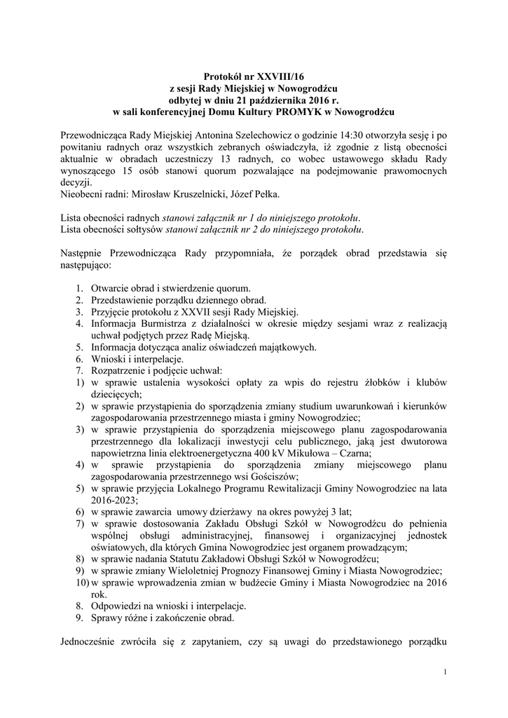 Protokół nr XXVIII/16 z sesji Rady Miejskiej w Nowogrodźcu odbytej w dniu 21 października 2016 r. w sali konferencyjnej Domu Kultury PROMYK w Nowogrodźcu Przewodnicząca Rady Miejskiej Antonina Szelechowicz o godzinie 14:30 otworzyła sesję i po powitaniu radnych oraz wszystkich zebranych oświadczyła, iż zgodnie z listą obecności aktualnie w obradach uczestniczy 13 radnych, co wobec ustawowego składu Rady wynoszącego 15 osób stanowi quorum pozwalające na podejmowanie prawomocnych decyzji. Nieobecni radni: Mirosław Kruszelnicki, Józef Pełka. Lista obecności radnych stanowi załącznik nr 1 do niniejszego protokołu. Lista obecności sołtysów stanowi załącznik nr 2 do niniejszego protokołu. Następnie Przewodnicząca Rady przypomniała, że porządek obrad przedstawia się następująco: 1. 2. 3. 4. Otwarcie obrad i stwierdzenie quorum. Przedstawienie porządku dziennego obrad. Przyjęcie protokołu z XXVII sesji Rady Miejskiej. Informacja Burmistrza z działalności w okresie między sesjami wraz z realizacją uchwał podjętych przez Radę Miejską. 5. Informacja dotycząca analiz oświadczeń majątkowych. 6. Wnioski i interpelacje. 7. Rozpatrzenie i podjęcie uchwał: 1) w sprawie ustalenia wysokości opłaty za wpis do rejestru żłobków i klubów dziecięcych; 2) w sprawie przystąpienia do sporządzenia zmiany studium uwarunkowań i kierunków zagospodarowania przestrzennego miasta i gminy Nowogrodziec; 3) w sprawie przystąpienia do sporządzenia miejscowego planu zagospodarowania przestrzennego dla lokalizacji inwestycji celu publicznego, jaką jest dwutorowa napowietrzna linia elektroenergetyczna 400 kV Mikułowa – Czarna; 4) w sprawie przystąpienia do sporządzenia zmiany miejscowego planu zagospodarowania przestrzennego wsi Gościszów; 5) w sprawie przyjęcia Lokalnego Programu Rewitalizacji Gminy Nowogrodziec na lata 2016-2023; 6) w sprawie zawarcia umowy dzierżawy na okres powyżej 3 lat; 7) w sprawie dostosowania Zakładu Obsługi Szkół w Nowogrodźcu do pełnienia wspólnej obsługi administracyjnej, finansowej i organizacyjnej jednostek oświatowych, dla których Gmina Nowogrodziec jest organem prowadzącym; 8) w sprawie nadania Statutu Zakładowi Obsługi Szkół w Nowogrodźcu; 9) w sprawie zmiany Wieloletniej Prognozy Finansowej Gminy i Miasta Nowogrodziec; 10) w sprawie wprowadzenia zmian w budżecie Gminy i Miasta Nowogrodziec na 2016 rok. 8. Odpowiedzi na wnioski i interpelacje. 9. Sprawy różne i zakończenie obrad. Jednocześnie zwróciła się z zapytaniem, czy są uwagi do przedstawionego porządku 1 dziennego obrad. Nie zgłoszono uwag. Ad. 3. Przewodnicząca Rady A. Szelechowicz poinformowała, że protokół z XXVII sesji był wyłożony do wglądu w biurze rady i każdy radny mógł się z nim zapoznać. Uwag nie wniesiono, w związku z tym Przewodnicząca Rady stwierdziła, że protokół z XXVII sesji Rady Miejskiej w Nowogrodźcu został przyjęty. Ad. 4. Burmistrz R. Relich przedstawił informację z wykonania uchwał, która stanowi załącznik nr 3 do niniejszego protokołu. Następnie Dyrektor Gminnego Centrum Kultury i Sportu E. Szwed przedstawiła prezentację z oficjalnej wizyty w Gminie Srbac, która stanowi załącznik nr 4 do niniejszego protokołu. W dalszej części osoby biorące udział w oficjalnej delegacji złożyli podziękowania dla Burmistrza za możliwość wyjazdu. Następnie Burmistrz wraz z Przewodniczącą Rady złożyli podziękowania biorącym udział w oficjalnej delegacji Gminy i Miasta Nowogrodziec w Gminie Srbac. Ponadto Burmistrz R. Relich poinformował o najistotniejszych zadaniach i wydarzeniach: 1) 31 sierpnia br.: uroczystość otarcia Filii Szkoły Podstawowej w Zebrzydowej – otwarcie dwóch oddziałów przedszkolnych, wręczono nauczycielom akty mianowania jako stopnie awansu zawodowego – składa podziękowania dla wszystkich, którzy przyczynili się do osiągnięcia i sukcesu na rzecz poprawy edukacji i oświaty w gminie, a szczególnie edukacji przedszkolnej, uroczystość pogrzebowa Prezesa Rejonowego Koła Pszczelarzy w Bolesławcu P. Żądło, 2) 1 września br. rozpoczęcie roku szkolnego – uczestnictwo w rozpoczęciu roku szkolnego w Szkole Podstawowej w Czernej – złożono podziękowanie dla p. Dyrektor J. Mierzwy, która zakończyła kadencję, a nową kadencję na stanowisku Dyrektora rozpoczęła p. E. Puzio, uroczystości rocznicowe związane z wybuchem II wojny światowej, 3) 3 września br. Dożynki Gminne w Kierżnie – składa podziękowania dla p. sołtys, rady sołeckiej, mieszkańcom Kierżna, radnemu i wszystkim którzy pomogli i uczestniczyli w święcie; 4) 5 września br. spotkanie z Dyrektorem Dolnośląskiej Służby Dróg i Kolei we Wrocławiu – celem spotkania było uzgodnienie wspólnych przedsięwzięć w zakresie zmiany organizacji ruchu w Nowogrodźcu na wniosek Dolnośląskiej Służby Dróg i Kolei (zmiany własnościowe). W formie rekompensaty otrzymał zobowiązanie, że zostanie przebudowany chodnik przy ul. Lubańskiej w Nowogrodźcu na koszt DSDiK w 100%; 5) prace związane z opracowaniem dokumentacji projektowych poszczególnych inwestycji wynikających z budżetu; 6) zgodnie z uchwałą Rady trwają przygotowania do połączenia zakładów – Samodzielnego Publicznego Zakładu Opieki Zdrowotnej i Samodzielnego Publicznego Zespołu Zakładów Opieki Zdrowotnej – zarządzeniem Burmistrza Nowogrodźca zostali powołani jako osoby odpowiedzialne do wykonania uchwały w imieniu Burmistrza p. Robert Adaszewski i p. Dariusz Jancelewicz; 7) 9 września br. posiedzenie Komisji Rozwoju Gospodarczego i Budżetu; 2 8) 10 września br. na zaproszenie p. Sołtysa wsi Czernej udział w dożynkach wiejskich; 9) 14 września br. zebranie wiejskie w Czernej – uczestnictwo wspólnie z Prezesem Spółki „Hydro-Tech” – poruszone były bieżące sprawy społeczności lokalnej oraz założenia do budowy kanalizacji sanitarnej. W bieżącym tygodni