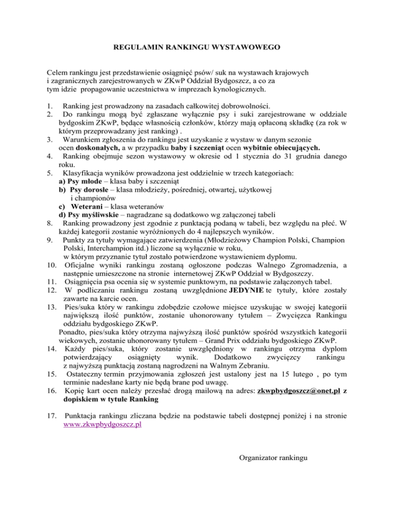 REGULAMIN RANKINGU WYSTAWOWEGO Celem rankingu jest przedstawienie osiągnięć psów/ suk na wystawach krajowych i zagranicznych zarejestrowanych w ZKwP Oddział Bydgoszcz, a co za tym idzie propagowanie uczestnictwa w imprezach kynologicznych. 1. 2. Ranking jest prowadzony na zasadach całkowitej dobrowolności. Do rankingu mogą być zgłaszane wyłącznie psy i suki zarejestrowane w oddziale bydgoskim ZKwP, będące własnością członków, którzy mają opłaconą składkę (za rok w którym przeprowadzany jest ranking) . 3. Warunkiem zgłoszenia do rankingu jest uzyskanie z wystaw w danym sezonie ocen doskonałych, a w przypadku baby i szczeniąt ocen wybitnie obiecujących. 4. Ranking obejmuje sezon wystawowy w okresie od 1 stycznia do 31 grudnia danego roku. 5. Klasyfikacja wyników prowadzona jest oddzielnie w trzech kategoriach: a) Psy młode – klasa baby i szczeniąt b) Psy dorosłe – klasa młodzieży, pośredniej, otwartej, użytkowej i championów c) Weterani – klasa weteranów d) Psy myśliwskie – nagradzane są dodatkowo wg załączonej tabeli 8. Ranking prowadzony jest zgodnie z punktacją podaną w tabeli, bez względu na płeć. W każdej kategorii zostanie wyróżnionych do 4 najlepszych wyników. 9. Punkty za tytuły wymagające zatwierdzenia (Młodzieżowy Champion Polski, Champion Polski, Interchampion itd.) liczone są wyłącznie w roku, w którym przyznanie tytuł zostało potwierdzone wystawieniem dyplomu. 10. Oficjalne wyniki rankingu zostaną ogłoszone podczas Walnego Zgromadzenia, a następnie umieszczone na stronie internetowej ZKwP Oddział w Bydgoszczy. 11. Osiągnięcia psa ocenia się w systemie punktowym, na podstawie załączonych tabel. 12. W podliczaniu rankingu zostaną uwzględnione JEDYNIE te tytuły, które zostały zawarte na karcie ocen. 13. Pies/suka który w rankingu zdobędzie czołowe miejsce uzyskując w swojej kategorii największą ilość punktów, zostanie uhonorowany tytułem – Zwycięzca Rankingu oddziału bydgoskiego ZKwP. Ponadto, pies/suka który otrzyma najwyższą ilość punktów spośród wszystkich kategorii wiekowych, zostanie uhonorowany tytułem – Grand Prix oddziału bydgoskiego ZKwP. 14. Każdy pies/suka, który zostanie uwzględniony w rankingu otrzyma dyplom potwierdzający osiągnięty wynik. Dodatkowo zwycięzcy rankingu z najwyższą punktacją zostaną nagrodzeni na Walnym Zebraniu. 15. Ostateczny termin przyjmowania zgłoszeń jest ustalony jest na 15 lutego , po tym terminie nadesłane karty nie będą brane pod uwagę. 16. Kopię kart ocen należy przesłać drogą mailową na adres: [email protected] z dopiskiem w tytule Ranking 17. Punktacja rankingu zliczana będzie na podstawie tabeli dostępnej poniżej i na stronie www.zkwpbydgoszcz.pl Organizator rankingu Ranking wystawowy -punktacja – Ocena „WO” Doskonała lokata I Ocena „WO” Doskonała lokata II Ocena „WO” Doskonała lokata III Ocena „WO” Doskonała lokata IV Zwycięzca Młodzieży Najlepsze Baby, Szczenię, Junior, Weteran w Rasie Nominacja CRUFT Zwycięzca Zwycięzca Klubu Zwycięzca Rasy CWC, CAC Res CACIB CACIB Best of Group: I II III IV Best In Show: I II III IV Wystawy o randze krajowej w kraju i zagranicą Wystawy międzynarodowe i championów w kraju i zagranicą Wystawy klubowe (wszystkie) Wystawy europejskie Wystawy światowe 5 10 15 20 25 4 8 12 16 20 3 6 9 12 16 2 4 6 8 10 10 15 15 20 30 10 15 15 20 30 10 15 15 - 15 25 20 20 25 20 20 25 30 25 - 25 40 30 35 40 40 50 40 45 50 25 20 15 10 30 25 20 15 100 80 60 40 150 100 75 50 30 25 20 15 40 35 30 25 200 150 100 50 300 250 200 150 50 45 40 35 Ponadto za dyplom: Zwycięzca Polski – 15 pkt Młodzieżowy Champion Polski – 20 pkt Champion Polski – 30 pkt Champion każdego innego kraju – 50 pkt Interchampion – 100 pkt Psy użytkowe (myśliwskie) nagradzane są dodatkowo na podstawie sumy punktów zdobytych na próbach , konkursach i egzaminach Psy myśliwskie Próby polowe Konkursy regionalne Konkursy krajowe 5 3 1 8 5 3 10 10 8 5 20 Dyplom I stopnia Dyplom I stopnia Dyplom I stopnia CPC Res-CACIT CACIT Champion Polski Pracy Champion Pracy innej organizacji Międzynarodowy Champion Pracy Konkursy międzynarodowe 20 15 10 30 40 50 50 50 100 Psy towarzyszące i obrończe Dyplom IPO III stopnia Dyplom IPO II stopnia Dyplom IPO I stopnia Dyplom PTT Dyplom PT II stopnia Dyplom PT I stopnia Lokata I (Mistrz) Lokata II(I vice-Mistrz) Lokata III (II vice-Mistrz) CPC Res-CACIT CACIT 10 8 5 5 3 1 Mistrzostwa regionalne 10 8 5 10 Mistrzostwa Polski 40 20 10 20 Champion Polski Pracy Champion Pracy innej organizacji (FCI) Międzynarodowy Champion Pracy Mistrzostwa Świata 100 65 50 30 40 50 50 50 100 Wyścigi Chartów Lokata I (Mistrz) Lokata II(I vice-Mistrz) Lokata III (II viceMistrz) Mistrzostwa regionalne 10 8 5 Mistrzostwa Polski 40 20 10 Mistrzostwa Świata 100 65 50