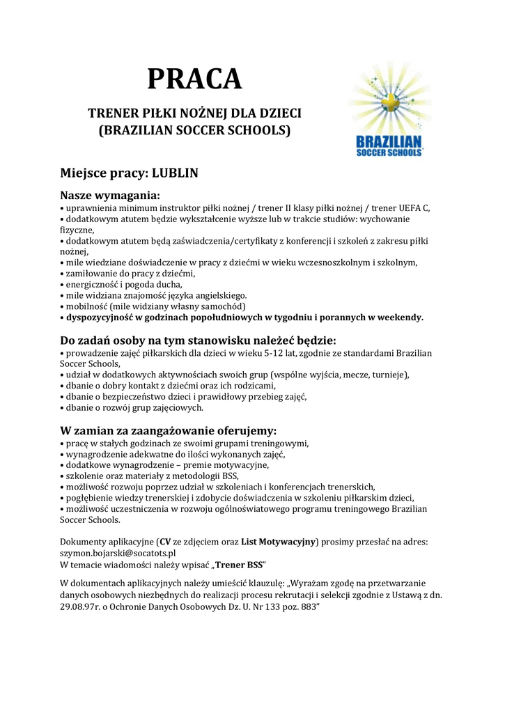 PRACA TRENER PIŁKI NOŻNEJ DLA DZIECI (BRAZILIAN SOCCER SCHOOLS) Miejsce pracy: LUBLIN Nasze wymagania: • uprawnienia minimum instruktor piłki nożnej / trener II klasy piłki nożnej / trener UEFA C, • dodatkowym atutem będzie wykształcenie wyższe lub w trakcie studiów: wychowanie fizyczne, • dodatkowym atutem będą zaświadczenia/certyfikaty z konferencji i szkoleń z zakresu piłki nożnej, • mile wiedziane doświadczenie w pracy z dziećmi w wieku wczesnoszkolnym i szkolnym, • zamiłowanie do pracy z dziećmi, • energiczność i pogoda ducha, • mile widziana znajomość języka angielskiego. • mobilność (mile widziany własny samochód) • dyspozycyjność w godzinach popołudniowych w tygodniu i porannych w weekendy. Do zadań osoby na tym stanowisku należeć będzie: • prowadzenie zajęć piłkarskich dla dzieci w wieku 5-12 lat, zgodnie ze standardami Brazilian Soccer Schools, • udział w dodatkowych aktywnościach swoich grup (wspólne wyjścia, mecze, turnieje), • dbanie o dobry kontakt z dziećmi oraz ich rodzicami, • dbanie o bezpieczeństwo dzieci i prawidłowy przebieg zajęć, • dbanie o rozwój grup zajęciowych. W zamian za zaangażowanie oferujemy: • pracę w stałych godzinach ze swoimi grupami treningowymi, • wynagrodzenie adekwatne do ilości wykonanych zajęć, • dodatkowe wynagrodzenie – premie motywacyjne, • szkolenie oraz materiały z metodologii BSS, • możliwość rozwoju poprzez udział w szkoleniach i konferencjach trenerskich, • pogłębienie wiedzy trenerskiej i zdobycie doświadczenia w szkoleniu piłkarskim dzieci, • możliwość uczestniczenia w rozwoju ogólnoświatowego programu treningowego Brazilian Soccer Schools. Dokumenty aplikacyjne (CV ze zdjęciem oraz List Motywacyjny) prosimy przesłać na adres: [email protected] W temacie wiadomości należy wpisać „Trener BSS” W dokumentach aplikacyjnych należy umieścić klauzulę: „Wyrażam zgodę na przetwarzanie danych osobowych niezbędnych do realizacji procesu rekrutacji i selekcji zgodnie z Ustawą z dn. 29.08.97r. o Ochronie Danych Osobowych Dz. U. Nr 133 poz. 883”