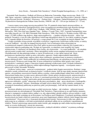 Jerzy Siwek, „ Tatrzański Park Narodowy”, Polski Przegląd Kartograficzny, t. 31, 1999, nr 1 Tatrzański Park Narodowy. Podhale od Witowa po Bukowinę Tatrzańską. Mapa turystyczna. Skala 1:25 000. Oprac. autorskie i redakcyjne Michał Siwicki. Cieniowanie i rysunek skał Mieczysław Cukierski. Zdjęcia i tekst Ryszard Siwicki. Wydanie I. Warszawa – Zielona Góra – Zakopane. Zakład Kartograficzny Sygnatura, Wydawnictwo Kartograficzne Polkart Anna Siwicka, 1998/99. Ark. 82 × 120 cm (po złożeniu 25 × 13 cm) I znowu mamy nową mapę turystyczną polskich Tatr. W ostatnich ośmiu latach otrzymywaliśmy, za sprawą różnych wydawnictw kartograficznych, coraz szczegółowsze przedstawienia tego skrawka naszego kraju – począwszy od skali 1:75 000 (Tatry i Podhale, 1990, PPWK), przez 1:50 000 (Tatry Polskie i Słowackie, 1995, Eko-Graf oraz Západné Tatry – Roháce i Vysoké Tatry, 1997, Vojenský kartografický ústav oraz kilka innych), po 1:30 000 (Tatrzański Park Narodowy, 1996, Eko-Graf) (1). Wydana wiosną 1998 roku mapa 1:25 000 wydłuża ciąg skalowy, dając najszczegółowszy – z punktu widzenia turystyki – obraz Tatr polskich. Świadczy o tym nie tylko największa wśród map tatrzańskich skala (2), lecz także wyjątkowo bogata treść. Legenda składa się bowiem z 84 pozycji, z czego ponad 30 (!) nie występuje na innych mapach Tatr. Uwagę czytelnika zwraca przede wszystkim wyraziście i sugestywnie cieniowana rzeźba terenu, co należy u nas do rzadkości – nie tylko na mapach turystycznych. Jest to koncepcja różna od przyjętej na wcześniejszych mapach wydawnictwa Eko-Graf, gdzie na pierwszym planie widoczny jest rysunek skał, a cieniowanie odgrywa podrzędną rolę. Wydaje się wprawdzie, że natężenie cieni mogłoby być lepiej zróżnicowane, w zależności od charakteru form rzeźby, ale cieniowanie – i to warto podkreślić – nie utrudnia odczytywania rysunku skał i poziomic. Obraz tatrzańskiej rzeźby terenu znajduje kontynuację na stawach. Ukształtowanie ich dna pokazują izobaty w cięciu 20-metrowym, a więc takim samym jak cięcie poziomicowe (pozbawione izobat są stawy słowackie, zapewne z braku odpowiednich materiałów). Na korzystny wygląd mapy wpływa także obraz roślinności, przedstawionej za pomocą czytelnych i dobrze dobranych barw. Warto podkreślić jej rozbudowaną klasyfikację, nie spotykaną na innych mapach turystycznych. Wziąwszy pod uwagę fakt, że poza roślinnością wyróżniono także grunty orne, tereny przemysłowe i cmentarze, mapa w znacznym stopniu pokazuje użytkowanie ziemi. Związek roślinności z wysokością n.p.m. podkreśla piętrowy układ odpowiedniego fragmentu legendy – rozwiązanie znane z pierwszych wydań Alexander Weltatlas. Użytkowe walory mapy – poza już wymienionymi – podnosi także bogate nazewnictwo. Rodzaje i ranga obiektów zostały zróżnicowane za pomocą krojów i wielkości pisma. Jeśli do tego dodać staranne spacjowanie opisów, otrzymaliśmy nazewnictwo bardzo dobrze czytelne, często podkreślające układ form rzeźby terenu. Zastrzeżenia budzą nieco za duże nazwy głównych dolin i forma opisów dwujęzycznych, umieszczonych w rejonie przygranicznym. Wydaje się, że nazwy w nawiasach powinny być nieco mniejsze, niż nazwy główne. Pewien dysonans wizualny wprowadza sposób prezentacji komunikacji autobusowej. Zwłaszcza agresywne niebieskie „szyldy” stanowiące tło dla nazw przystanków, dają – przez skojarzenie z hydrografią – wrażenie „nawodnienia” obszaru. Abstrahując od logiki użycia takiej barwy, efekt wizualny, polegający na wysunięciu komunikacji publicznej na pierwszy plan, jest piorunujący. Jeśli taki był zamiar autora, to się powiódł. Swoistym układem nerwowym mapy są szlaki turystyczne, będące – jak wiadomo – jedynymi trasami przemieszczania się odwiedzających Tatrzański Park Narodowy. Poprowadzono je na ogół bardzo starannie, chociaż w następnym wydaniu należy zadbać o to, aby odpowiednie odcinki szlaków zawsze trafiały w znak przełęczy (oba znaki rozmijają się na Krzyżnem i na Przełęczy pod Chłopkiem). Czytelność przebiegu szlaków turystycznych nie budzi właściwie zastrzeżeń, poza tymi fragmentami szlaków żółtych, które biegną zboczami „zacienionymi”. Przyczyna leży w koncepcji przedstawienia ścieżek. Narysowano je tylko tam, gdzie nie pokrywają się ze szlakami, a ich brak na pozostałych odcinkach odbija się na czytelności wspomnianych szlaków. Pomysł częściowego opuszczenia znaku ścieżki, gdy zastępuje go znak szlaku turystycznego, należy uznać za wysoce dyskusyjny i raczej nie stosowany. Rozwiązaniem niezbyt fortunnym jest oznaczanie „trudnych odcinków szlaków” za pomocą osobnego znaku (wykrzyknik w kółku), umieszczonego wzdłuż tych odcinków. To rozrzutne gospodarowanie powierzchnią mapy nie ma żadnego uzasadnienia, wobec możliwości bardziej przejrzystego rozwiązania, polegającego na zmianie charakteru linii szlaku (na wojskowej mapie Tatr w skali 1:10 000 linię przerywaną „zwykłego” szlaku zastąpiono linią kropkową szlaku „trudnego”). Wzbogaceniem informacji o trudnościach na szlakach mogłoby być pokazanie, wzorem map słowackich, obiektów takich jak łańcuchy, drabinki itp. Szlaki turystyczne są opisane czasami ich pokonywania, podanymi zarówno na mapie głównej jak i osobnej mapie umieszczonej na odwrocie arkusza. Warto przypomnieć, że dobry ten zwyczaj został zapoczątkowany przed kilku laty przez Wydawnictwo Eko-Graf. Czasy te są generalnie dłuższe od odpowiedników na tatrzańskich mapach Eko-Grafu – najczęściej o 25%, a w krańcowym przypadku, na odcinku „Murowaniec” – Zawrat, nawet o 40% (chyba z uwzględnieniem kolejki do łańcuchów, która ustawia się w miesiącach letnich!). Kilka uwag nasuwa się także do niektórych innych pozycji treści turystycznej. Zbędne wydaje si