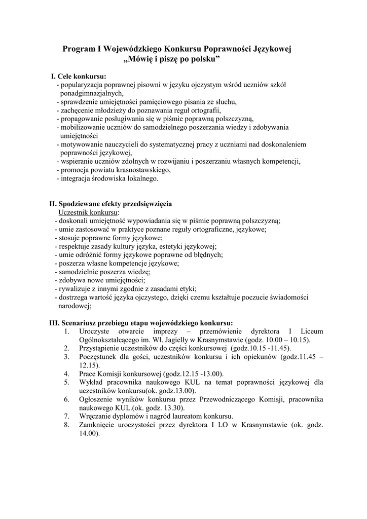 Program I Wojewódzkiego Konkursu Poprawności Językowej „Mówię i piszę po polsku” I. Cele konkursu: - popularyzacja poprawnej pisowni w języku ojczystym wśród uczniów szkół ponadgimnazjalnych, - sprawdzenie umiejętności pamięciowego pisania ze słuchu, - zachęcenie młodzieży do poznawania reguł ortografii, - propagowanie posługiwania się w piśmie poprawną polszczyzną, - mobilizowanie uczniów do samodzielnego poszerzania wiedzy i zdobywania umiejętności - motywowanie nauczycieli do systematycznej pracy z uczniami nad doskonaleniem poprawności językowej, - wspieranie uczniów zdolnych w rozwijaniu i poszerzaniu własnych kompetencji, - promocja powiatu krasnostawskiego, - integracja środowiska lokalnego. II. Spodziewane efekty przedsięwzięcia Uczestnik konkursu: - doskonali umiejętność wypowiadania się w piśmie poprawną polszczyzną; - umie zastosować w praktyce poznane reguły ortograficzne, językowe; - stosuje poprawne formy językowe; - respektuje zasady kultury języka, estetyki językowej; - umie odróżnić formy językowe poprawne od błędnych; - poszerza własne kompetencje językowe; - samodzielnie poszerza wiedzę; - zdobywa nowe umiejętności; - rywalizuje z innymi zgodnie z zasadami etyki; - dostrzega wartość języka ojczystego, dzięki czemu kształtuje poczucie świadomości narodowej; III. Scenariusz przebiegu etapu wojewódzkiego konkursu: 1. Uroczyste otwarcie imprezy – przemówienie dyrektora I Liceum Ogólnokształcącego im. Wł. Jagielły w Krasnymstawie (godz. 10.00 – 10.15). 2. Przystąpienie uczestników do części konkursowej (godz.10.15 -11.45). 3. Poczęstunek dla gości, uczestników konkursu i ich opiekunów (godz.11.45 – 12.15). 4. Prace Komisji konkursowej (godz.12.15 -13.00). 5. Wykład pracownika naukowego KUL na temat poprawności językowej dla uczestników konkursu(ok. godz.13.00). 6. Ogłoszenie wyników konkursu przez Przewodniczącego Komisji, pracownika naukowego KUL.(ok. godz. 13.30). 7. Wręczanie dyplomów i nagród laureatom konkursu. 8. Zamknięcie uroczystości przez dyrektora I LO w Krasnymstawie (ok. godz. 14.00).