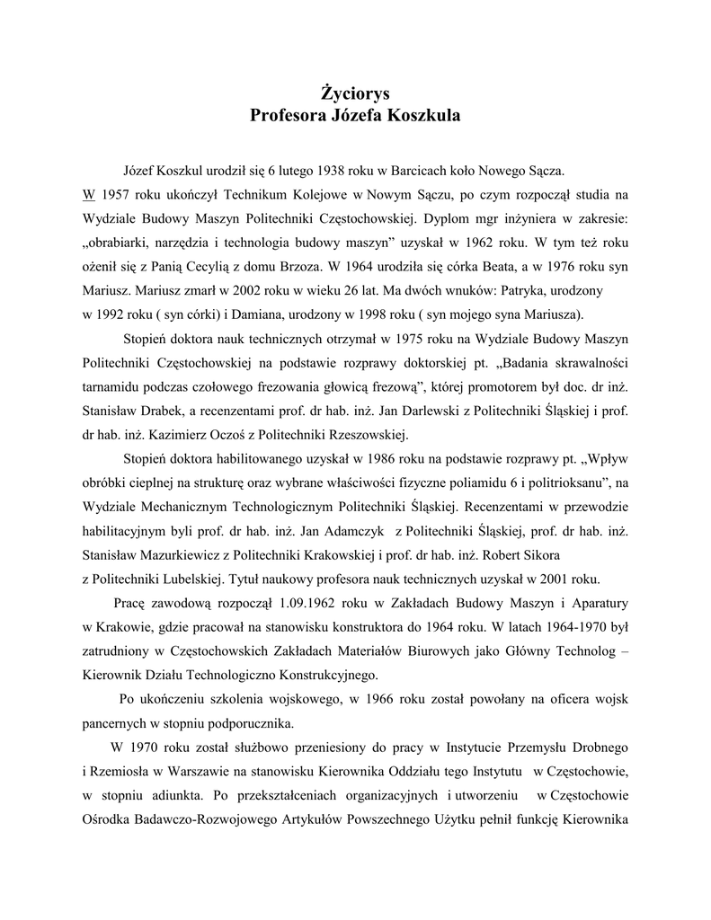 Życiorys Profesora Józefa Koszkula Józef Koszkul urodził się 6 lutego 1938 roku w Barcicach koło Nowego Sącza. W 1957 roku ukończył Technikum Kolejowe w Nowym Sączu, po czym rozpoczął studia na Wydziale Budowy Maszyn Politechniki Częstochowskiej. Dyplom mgr inżyniera w zakresie: „obrabiarki, narzędzia i technologia budowy maszyn” uzyskał w 1962 roku. W tym też roku ożenił się z Panią Cecylią z domu Brzoza. W 1964 urodziła się córka Beata, a w 1976 roku syn Mariusz. Mariusz zmarł w 2002 roku w wieku 26 lat. Ma dwóch wnuków: Patryka, urodzony w 1992 roku ( syn córki) i Damiana, urodzony w 1998 roku ( syn mojego syna Mariusza). Stopień doktora nauk technicznych otrzymał w 1975 roku na Wydziale Budowy Maszyn Politechniki Częstochowskiej na podstawie rozprawy doktorskiej pt. „Badania skrawalności tarnamidu podczas czołowego frezowania głowicą frezową”, której promotorem był doc. dr inż. Stanisław Drabek, a recenzentami prof. dr hab. inż. Jan Darlewski z Politechniki Śląskiej i prof. dr hab. inż. Kazimierz Oczoś z Politechniki Rzeszowskiej. Stopień doktora habilitowanego uzyskał w 1986 roku na podstawie rozprawy pt. „Wpływ obróbki cieplnej na strukturę oraz wybrane właściwości fizyczne poliamidu 6 i politrioksanu”, na Wydziale Mechanicznym Technologicznym Politechniki Śląskiej. Recenzentami w przewodzie habilitacyjnym byli prof. dr hab. inż. Jan Adamczyk z Politechniki Śląskiej, prof. dr hab. inż. Stanisław Mazurkiewicz z Politechniki Krakowskiej i prof. dr hab. inż. Robert Sikora z Politechniki Lubelskiej. Tytuł naukowy profesora nauk technicznych uzyskał w 2001 roku. Pracę zawodową rozpoczął 1.09.1962 roku w Zakładach Budowy Maszyn i Aparatury w Krakowie, gdzie pracował na stanowisku konstruktora do 1964 roku. W latach 1964-1970 był zatrudniony w Częstochowskich Zakładach Materiałów Biurowych jako Główny Technolog – Kierownik Działu Technologiczno Konstrukcyjnego. Po ukończeniu szkolenia wojskowego, w 1966 roku został powołany na oficera wojsk pancernych w stopniu podporucznika. W 1970 roku został służbowo przeniesiony do pracy w Instytucie Przemysłu Drobnego i Rzemiosła w Warszawie na stanowisku Kierownika Oddziału tego Instytutu w Częstochowie, w stopniu adiunkta. Po przekształceniach organizacyjnych i utworzeniu w Częstochowie Ośrodka Badawczo-Rozwojowego Artykułów Powszechnego Użytku pełnił funkcję Kierownika Zakładu Przetwórstwa Tworzyw Sztucznych, skąd w 1976 roku został służbowo przeniesiony do pracy w Politechnice Częstochowskiej na stanowisku docenta kontraktowego w Instytucie Technologii Budowy Maszyn. W Instytucie tym pełnił kolejno funkcje kierownika studiów podyplomowych, kierownika Zakładu Obrabiarek i Zastępcy Dyrektora Instytutu. W latach 1992-1999 pracował w Instytucie Obróbki Plastycznej Metali i Tworzyw Sztucznych na stanowisku kierownika Zakładu Przetwórstwa Tworzyw Sztucznych. W 1992 roku został powołany na stanowisko profesora nadzwyczajnego Politechniki Częstochowskiej, a w 2002 roku na stanowisko profesora zwyczajnego. Z dniem 1.01.2000 roku doprowadził do utworzenia Katedry Przetwórstwa Tworzyw Sztucznych i Zarządzania Produkcją, zostając jej kierownikiem. Po przekształceniu Katedry w Instytut Przetwórstwa Polimerów i Zarządzania Produkcją (16.11.2005) został dyrektorem Instytutu. W latach 1996-2002 pełnił funkcję dziekana Wydziału Budowy Maszyn, który na jego wniosek został przekształcony w Wydział Inżynierii Mechanicznej i Informatyki. W latach 2002-2005 pełnił funkcję prorektora Politechniki Częstochowskiej ds. Rozwoju i Współpracy z Zagranicą. Od 1964 roku pracuje społecznie, w Stowarzyszeniu Inżynierów i Techników Mechaników Polskich, początkowo jako zastępca sekretarza Oddziału a następnie, nieprzerwanie od 1972 roku, jako jego prezes. W latach w Częstochowie, 1972-1990 był też członkiem Zarządu Głównego tego Stowarzyszenia. W 1994 roku został członkiem Honorowym SIMP. Od 1994 roku jest prezesem Zarządu Głównego Towarzystwa Przetwórców Tworzyw Polimerowych SIMP. W 1969 roku uzyskał uprawnienia wykładowcy SIMP w zakresie: Technologia przetwórstwa tworzyw sztucznych. Ukończył też kurs dla kandydatów na rzeczników patentowych i po złożeniu egzaminu uzyskał świadectwo rzecznika patentowego. W 1972 roku uzyskał tytuł Dyplomowanego Rzeczoznawcy SIMP nr 284 w zakresie rzecznictwa patentowego i przetwórstwa tworzyw sztucznych.. Był jednym z założycieli Polskiego Towarzystwa Materiałów Kompozytowych. Od 1993 roku jest członkiem Zarządu Głównego Towarzystwa pełniąc funkcję skarbnika. Po utworzeniu czasopisma naukowego Kompozyty został członkiem Komitetu Naukowego i Redakcyjnego tego czasopisma. Od 2003 roku jest członkiem Honorowym tego Towarzystwa. Od 1996 roku wchodzi w skład Komitetu Organizacyjnego Międzynarodowych Targów Przetwórstwa Tworzyw Sztucznych „Plastpol” w Kielcach, gdzie przewodniczy Sądowi Konkursowemu Targów. Jest też członkiem Sekcji Podstaw Technologii Komitetu Budowy Maszyn PAN (od 1985 roku) oraz członkiem Komisji Nauki o Materiałach Oddziału PAN w Katowicach (od 2000 roku). Za swoja działalność naukową i społeczną uzyskał wiele odznaczeń i nagród: - Srebrny Krzyż Zasługi (1975), Złoty Krzyż Zasługi (1981), Krzyż Kawalerski Orderu Odrodzenia Polski (1988), Krzyż Oficerski Orderu Odrodzenia Polski (1998), - Medal brązowy za zasługi dla obronności kraju (1977), - Medal Komisji Edukacji Narodowej (1999), - Medal srebrny za zasługi dla woj. katowickiego (1972), - Medal za zasługi dla rozwoju woj. częstochowskiego (brązowy – 1977, srebrny – 1983, złoty – 1988), - Srebrna i Złota Honorowa Odznaka NOT, - Srebrna i Złota Honorowa Odznaka SIMP, - Medal Zasłużonego Działacza SIMP im. Prof. Mierzejewskiego (1984), - Medal i dyplom członka Honorowego SIMP (1994), - Nagrody MEN – 1983 i 1986, - Nagrody Re