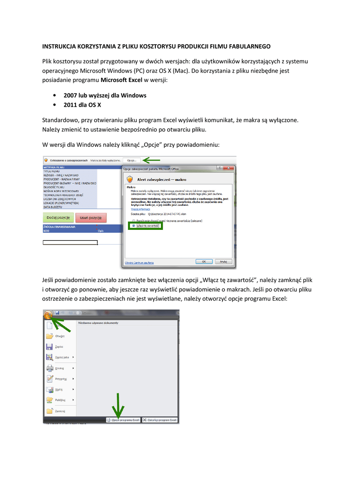 INSTRUKCJA KORZYSTANIA Z PLIKU KOSZTORYSU PRODUKCJI FILMU FABULARNEGO Plik kosztorysu został przygotowany w dwóch wersjach: dla użytkowników korzystających z systemu operacyjnego Microsoft Windows (PC) oraz OS X (Mac). Do korzystania z pliku niezbędne jest posiadanie programu Microsoft Excel w wersji: • • 2007 lub wyższej dla Windows 2011 dla OS X Standardowo, przy otwieraniu pliku program Excel wyświetli komunikat, że makra są wyłączone. Należy zmienić to ustawienie bezpośrednio po otwarciu pliku. W wersji dla Windows należy kliknąć „Opcje” przy powiadomieniu: Jeśli powiadomienie zostało zamknięte bez włączenia opcji „Włącz tę zawartość”, należy zamknąć plik i otworzyć go ponownie, aby jeszcze raz wyświetlić powiadomienie o makrach. Jeśli po otwarciu pliku ostrzeżenie o zabezpieczeniach nie jest wyświetlane, należy otworzyć opcje programu Excel: a następnie, po wejściu do „Opcji”, otworzyć „Centrum zaufania”, w „Ustawieniach Centrum zaufania” przejść do „Ustawień makr” i zaznaczyć pozycję „Wyłącz wszystkie makra i wyświetl powiadomienie”: Po zatwierdzeniu zmiany należy ponownie otworzyć plik i zezwolić na włączenie makr w pliku kosztorysu. Ze względów bezpieczeństwa nie zalecamy włączania wszystkich makr w opcjach programu Excel. W programie Excel dla Mac należy zezwolić na włączenie makr podczas otwierania pliku: Plik składa się z dziewięciu arkuszy: • • • • • • • • • Info Str. zbiorcza Struktura finansowania I DEV II PROD III POST IV INNE Notatki Wykresy We wszystkich arkuszach należy uzupełniać wyłącznie komórki w kolorze białym. Nie należy ingerować w ustaloną strukturę dokumentu, próbować samodzielnie dodawać arkuszy, pozycji kosztorysu na poziomach 1-3 (KATEGORIA, GRUPA, POZYCJA, edytowalny jest tylko poziom 4: DETAL), dodatkowych kolumn itp. Dokument ma określony kształt i jest zabezpieczony przed próbami jego zmiany. Nie należy podejmować prób przełamywania tych zabezpieczeń. Dołączenie do wniosku o dofinansowanie kosztorysu, którego struktura będzie różniła się od udostępnionej przez PISF, będzie skutkowało odrzuceniem wniosku z przyczyn formalnych. Tam, gdzie możliwe jest dodawanie i usuwanie kolejnych pozycji, zostały umieszczone odpowiednie przyciski: W arkuszu „Info” należy samodzielnie uzupełnić: „Metrykę wniosku” (wpisując dane projektu), a także tabelki: „Źródła finansowania” i „Jednostki”. Jeśli np. na liście brakuje niezbędnych jednostek miary lub są na niej jednostki niepotrzebne należy kliknąć (jeden raz lewym klawiszem myszki) we właściwą komórkę i użyć przycisków „Dodaj pozycję” lub „Usuń pozycję”: • usuwanie pozycji „Metr” (klikamy na komórkę „Metr”, a następnie przycisk „Usuń pozycję”): • dodawanie pozycji „Nowa jednostka” (klikamy w dowolną wypełnioną komórkę – nowa, pusta komórka zostanie dodana tuż nad nią, a następnie klikamy „Dodaj pozycję” i wpisujemy nazwę nowej jednostki): Jeśli przy opisie komórki znajduje się znak czerwonego trójkąta, oznacza to, że w komentarzu dostępne są dodatkowe informacje (należy najechać myszką w pobliże trójkąta, by wyświetlić komentarz): W niektórych polach należy wybrać właściwą wartość z przygotowanej listy (nie należy próbować zmieniać jej samodzielnie poza określonymi wyjątkami – np. „Jednostki”) – po kliknięciu w komórkę zawierającą listę po prawej stronie pojawi się trójkąt, który należy kliknąć jeden raz lewym klawiszem myszki, by zobaczyć zawartość: W arkuszu „Str. Zbiorcza” należy uzupełnić ręcznie jedynie komórki w kolumnie „Dotacja PISF” oraz pozycje: VI („Koszty ogólne producenta”) i VIII („P&A”) – za pomocą suwaka („chwytając” go lewym klawiszem myszki i przesuwając w lewo lub prawo) albo wpisując kwotę: Uwaga! Prawidłowe wyliczenie tych wartości wymaga wprowadzenia danych w odpowiednich pozycjach w arkuszach I-IV i użycia przycisku „Odśwież podsumowanie” lub „Odśwież załączniki”. Dane o tytule filmu oraz dacie kosztorysu zostaną przeniesione z arkusza „Info”, natomiast dane finansowe z arkuszy I-IV („DEV”, „PROD”, „POST” i „INNE”). Aby zobaczyć dane z arkuszy I-IV podsumowane na stronie zbiorczej należy użyć przycisku „Odśwież podsumowanie” lub „Odśwież załączniki”. Uwaga! W arkuszu „Str. zbiorcza” umieszczony został także przycisk „Generuj pusty szablon”. Umożliwia on wyczyszczenie wszystkich wprowadzonych danych i stworzenie czystego kosztorysu (np. gdy pobranie nowego, pustego pliku ze strony internetowej PISF jest niemożliwe, a konieczne jest przygotowanie kolejnego kosztorysu). Po kliknięciu tego przycisku pojawi się ostrzeżenie, że operacji tej nie można cofnąć: Z opcji generowania pustego szablonu należy korzystać bardzo ostrożnie, tylko w sytuacji, gdy wprowadzone dane są niepotrzebne lub gdy wypełniony kosztorys został już zapisany na dysku. Usunięcie danych jest nieodwracalne! Po odświeżeniu szablonu i usunięciu danych zaleca się zapisać na dysku pusty plik bez danych pod inną nazwą. W arkuszu „Struktura finansowania” można ręcznie stworzyć zbiorcze zestawienia pokazujące pokrycie kosztów produkcji z różnych źródeł finansowania, z podziałem na wkłady rzeczowe, wkłady finansowe i dotacje publiczne. Tabela pozwoli automatycznie sprawdzić, czy wpisana kwota projektu jest zgodna z uzupełnionym kosztorysem. Jest to arkusz pomocniczy. W arkuszach „I DEV”, „II PROD”, „III POST” oraz „IV INNE” należy skonstruować kosztorys przygotowywanego projektu filmowego. Arkusz „I DEV” zawiera pozycje 01-07, odpowiadające okresowi rozwoju projektu i prac wstępnych; arkusz „II PROD” zawiera pozycje 08-19, odpowiadające okresowi przygotowawczemu i zdjęciowemu; ark