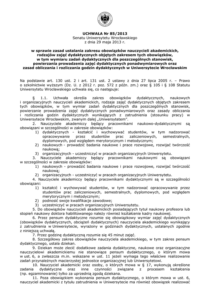 UCHWAŁA Nr 85/2013 Senatu Uniwersytetu Wrocławskiego z dnia 29 maja 2013 r. w sprawie zasad ustalania zakresu obowiązków nauczycieli akademickich, rodzajów zajęć dydaktycznych objętych zakresem tych obowiązków, w tym wymiaru zadań dydaktycznych dla poszczególnych stanowisk, powierzania prowadzenia zajęć dydaktycznych ponadwymiarowych oraz zasad obliczania i rozliczania godzin dydaktycznych w Uniwersytecie Wrocławskim Na podstawie art. 130 ust. 2 i art. 131 ust. 2 ustawy z dnia 27 lipca 2005 r. – Prawo o szkolnictwie wyższym (Dz. U. z 2012 r. poz. 572 z późn. zm.) oraz § 105 i § 108 Statutu Uniwersytetu Wrocławskiego uchwala się, co następuje: § 1.1. Uchwała określa zakres obowiązków dydaktycznych, naukowych i organizacyjnych nauczycieli akademickich, rodzaje zajęć dydaktycznych objętych zakresem tych obowiązków, w tym wymiar zadań dydaktycznych dla poszczególnych stanowisk, powierzanie prowadzenia zajęć dydaktycznych ponadwymiarowych oraz zasady obliczania i rozliczania godzin dydaktycznych wynikających z zatrudnienia (stosunku pracy) w Uniwersytecie Wrocławskim, zwanym dalej „Uniwersytetem”. 2. Nauczyciele akademiccy będący pracownikami naukowo-dydaktycznymi są obowiązani w szczególności w zakresie obowiązków: 1) dydaktycznych - kształcić i wychowywać studentów, w tym nadzorować opracowywanie przez studentów prac zaliczeniowych, semestralnych, dyplomowych, pod względem merytorycznym i metodycznym; 2) naukowych - prowadzić badania naukowe i prace rozwojowe, rozwijać twórczość naukową; 3) organizacyjnych - uczestniczyć w pracach organizacyjnych Uniwersytetu. 3. Nauczyciele akademiccy będący pracownikami naukowymi są obowiązani w szczególności w zakresie obowiązków: 1) naukowych - prowadzić badania naukowe i prace rozwojowe, rozwijać twórczość naukową; 2) organizacyjnych - uczestniczyć w pracach organizacyjnych Uniwersytetu. 4. Nauczyciele akademiccy będący pracownikami dydaktycznymi są w szczególności obowiązani: 1) kształcić i wychowywać studentów, w tym nadzorować opracowywanie przez studentów prac zaliczeniowych, semestralnych, dyplomowych, pod względem merytorycznym i metodycznym; 2) podnosić swoje kwalifikacje zawodowe; 3) uczestniczyć w pracach organizacyjnych Uniwersytetu. 5. Do obowiązków nauczycieli akademickich posiadających tytuł naukowy profesora lub stopień naukowy doktora habilitowanego należy również kształcenie kadry naukowej. 6. Przez pensum dydaktyczne rozumie się obowiązkowy wymiar zajęć dydaktycznych (obowiązków dydaktycznych, obciążeń dydaktycznych) nauczyciela akademickiego wynikający z zatrudnienia w Uniwersytecie, wyrażony w godzinach dydaktycznych, ustalanych zgodnie z niniejszą uchwałą. 7. Przez godzinę dydaktyczną rozumie się 45 minut zajęć. 8. Szczegółowy zakres obowiązków nauczyciela akademickiego, w tym zakres pensum dydaktycznego, ustala dziekan. 9. Dziekan może zlecić dodatkowe zadania dydaktyczne, naukowe oraz organizacyjne nauczycielowi akademickiemu nie stanowiące pensum dydaktycznego, o którym mowa w ust. 6, a zwłaszcza m.in. wskazane w ust. 11 jeżeli wymaga tego właściwe realizowanie zadań przynależnych macierzystej jednostce organizacyjnej lub Uniwersytetowi. 10. Nauczyciel akademicki oraz osoby, o których mowa w § 17, wykonują określone zadania dydaktyczne oraz inne czynności związane z procesem kształcenia (np. egzaminowanie) tylko za uprzednią zgodą dziekana. 11. Poza obowiązkiem wykonania pensum dydaktycznego, o którym mowa w ust. 6, nauczyciel akademicki z tytułu zatrudnienia w Uniwersytecie ma również obowiązek realizować inne obowiązki związane z zadaniami macierzystej jednostki organizacyjnej oraz zadaniami Uniwersytetu, w szczególności w formie: 1) konsultacji dla studentów; 2) przeprowadzania zaliczeń i egzaminów oraz innych czynności w toku studiów; 3) udziału w zaliczeniach i egzaminach komisyjnych; 4) udziału w egzaminach dyplomowych; 5) promotorstwa (opieki) nad pracami dyplomowymi oraz ich recenzowania; 6) opieki nad kołami naukowymi studentów i doktorantów; 7) przygotowania studentów do udziału w konkursach, olimpiadach i innych formach współzawodnictwa oraz akademickich zawodach sportowych; 8) działalności wychowawczej; 9) udziału w zespołach (komisjach) powoływanych przez dziekana i Rektora; 10) udziału w zespołach (komisjach) powoływanych przez radę jednostki organizacyjnej i Senat Uniwersytetu; 11) udziału w zespołach (komisjach) systemu zapewniania jakości kształcenia oraz oceny jakości kształcenia w jednostce macierzystej oraz Uniwersytecie; 12) prac związanych z postępowaniem rekrutacyjnym; 13) udziału w projektach, programach i innych przedsięwzięciach związanych z podnoszeniem kwalifikacji zawodowych, poziomu naukowo-dydaktycznego i organizacyjnego Uniwersytetu; 14) organizowania (współorganizowania) seminariów i konferencji naukowych, naukowo-dydaktycznych i innych; 15) prowadzenia lub udziału w seminariach i konferencjach naukowych, naukowodydaktycznych i innych; 16) udziału w pracach organizacyjnych związanych z badaniami naukowymi, 17) udziału w komisjach (zespołach) związanych z przeprowadzanymi postępowaniami w zakresie stopni i tytułów naukowych; 18) promotorstwa rozpraw doktorskich; 19) recenzowania prac naukowych; 20) działań zmierzających do pozyskiwania środków zewnętrznych na działalność naukowo-dydaktyczną, badania naukowe i inną; 21) terminowego wprowadzania rzetelnych informacji (danych) wymaganych przez Uniwersytecki System Obsługi Studentów (USOS); 22) innych obowiązków związanych z zadaniami macierzystej jednostki organizacyjnej oraz zadaniami Uniwersytetu. 12. Nauczyciel akademicki jest zobowiązany do prowadzenia w tygodniu (od poniedziałku do piątku) co najmniej 2 godzin zegarowych (120 minut) w godzinach od 7:00 do 18:00 konsultacji dla studentów, w okresie odbywania się zajęć dyda