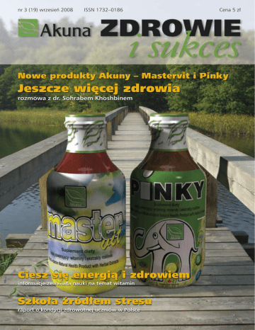 nr 3 (19) wrzesień 2008 ISSN 1732–0186 Cena 5 zł Nowe produkty Akuny – Mastervit i Pinky Jeszcze więcej zdrowia rozmowa z dr. Sohrabem Khoshbinem Ciesz się energią i zdrowiem informacje ze świata nauki na temat witamin Szkoła źródłem stresu raport o kondycji zdrowotnej uczniów w Polsce W numerze 3 4 7 8 10 14 16 22 24 28 30 34 36 38 42 44 46 48 50 52 54 56 58 Słowo wstępne Alek jest zdrowym dzieckiem reportaż o rodzinie Rezmerów Jeszcze więcej zdrowia rozmowa z dr. Sohrabem Khoshbinem Szczęście i zdrowie moich dzieci reportaż o rodzinie Agnieszki Liszki Ciesz się energią i zdrowiem informacje ze świata nauki na temat witamin 16 „Zdrowa rodzina bogactwem narodu” – wywiad z Józefem Kropem i Jerzym Maslanky 38 Najjaśniejszy umysł – rozmowa z Magdaleną Wdowiak 48 Akuna Vip Club – doświadczenie i wiedza 50 Odpowiedzialność za kierownicą – relacja ze szkolenia Akuny Lawina zmian reportaż o rodzinie Brzozowców „Zdrowa rodzina bogactwem narodu” wywiad z Józefem Kropem i Jerzym Maslanky Śnię kolorowo reportaż o rodzinie Górów Szkoła źródłem stresu raport na temat kondycji zdrowotnej uczniów w Polsce Lepsza koncentracja reportaż o rodzinie Dziurów Właściwa dieta, witaminy, sport raport o tym, jak zadbać o dzieci w wieku szkolnym Złe nawyki w pracy raport o problemie pracoholizmu w naszym kraju Szłam drogą pod prąd reportaż o rodzinie Połomskich Najjaśniejszy umysł rozmowa z Magdaleną Wdowiak Strach o syna reportaż o rodzinie Pieczarów Rower zimową porą reportaż o Jolancie Kolasa Tylko zdrowe zęby rozmowa z Katarzyną Tanasiewicz-Brykczyńską, lekarzem stomatologiem Akuna Vip Club doświadczenie i wiedza Odpowiedzialność za kierownicą relacja ze szkolenia Akuny Dobroczynne jabłko porady zielarki Grażyny Utratnej Oleje roślinne radzi dietetyk Ewa Ceborska Oliwa – zdrowa, pyszna, sprawiedliwa podróże kulinarne Ewy Liguz-Borowiec Biuro. Aktualności i informacje. Nominacje 2 ZDROWIE i sukces Najlepsza marka zdaniem Polaków „Eko-laur konsumenta 2008” dla Akuny W tym roku Akuna została nagrodzona „Eko-laurem konsumenta”. To godło najpopularniejszych produktów i usług ogólnodostępnych na krajowym rynku. Przyznanie go oznacza, że oferowane przez firmę Akuna produkty cieszą się bardzo dobrą opinią i dużą popularnością wśród polskich konsumentów, są najczęściej przez nich wybierane, polecane innym oraz pozytywnie oceniane. „Eko-laur konsumenta” jest największym programem konsumenckim w Polsce, organizowanym przez Grupę Media Partner. To, do kogo wędruje godło (przyznane przez Przegląd Gospodarczy – dodatek promocyjno-informacyjny do Gazety Prawnej), zostało rozstrzygnięte w oparciu o badania popularności produktów i usług na polskim rynku. Pod opieką merytoryczną Instytutu Gallupa redakcja Przeglądu Gospodarczego w 2004 r. zapoczątkowała badania, które pozwoliły wyłonić najpopularniejsze firmy, produkty i usługi na krajowym rynku w roku 2005. Są to firmy i produkty, które często wskazywali w ankietach konsumenci, najczęściej przez nich wybierane, pozytywnie oceniane i rekomendowane innym osobom. Badania przeprowadzane są za pomocą ankiet telefonicznych (gospodarstwa domowe, firmy), elektronicznych, a także bezpośrednich (ankieterzy w sklepach różnej wielkości w 12 największych miastach w Polsce). Oceniana jest przede wszystkim znajomość marki, jakość produktu, chęć rekomendacji znajomym, przywiązanie klienta do danej marki oraz wpływ doświadczeń osobistych na decyzję zakupu. Badania mają na celu wyłonienie najwyżej cenionej przez klientów marki produktu. Firma, która otrzymała „Eko-laur konsumenta” może posługiwać się godłem w reklamach, na stronach internetowych, na opakowaniu itd. Szanowni Państwo Choć często wydaje się nam, że jest zupełnie inaczej, ja pokusiłbym się o stwierdzenie: „Dzieci żyją dokładnie tak, jak ich rodzice”. To przecież rodzinny dom jest pierwszym nauczycielem. I to w domowych pieleszach nabywamy pierwsze dobre, ale też i złe nawyki. Warto o tym myśleć właśnie teraz. Bo wrzesień to czas zaczynania wszystkiego od nowa. My, dorośli, snujemy plany, nasze dzieci idą do szkoły, na studia, zapisują się na kursy języków. Dlatego numer „Zdrowia i Sukcesu”, który właśnie trafia do rąk Państwa, poświęcony jest nauce i temu, jak pracujemy. To bardzo ważny temat, dotyczący zwłaszcza dzieci. Jak zorganizować im czas pracy, jak pokierować, by nauka była przyjemnością, a nie jedynie nawałem obowiązków. Co zrobić, by siedzące nad książkami dziecko było zdrowe? Jak nie przegapić pierwszych symptomów chorób, wynikających ze złego odżywiania, braku sportu, krzywego kręgosłupa? Lekarze biją na alarm, stan zdrowia naszych pociech nie jest zadowalający. Niedożywienie. Przemęczenie. Agresja. Stres. Może zamiast wysyłać nasze dziecko na kolejny kurs nauki języka, pomyślmy o tym, by zaczęło uprawiać jakiś sport? Chcemy, by artykuły, które publikujemy w tym wydaniu, stały się inspiracją dla rodziców. By przyjrzeli się, jak żyją ich dzieci i w jakim kierunku nasza opieka nad nimi zmierza. Może zacznijmy od tego, by przyglądnąć się, jak sami żyjemy? Jak się odżywiamy? Ile czasu poświęcamy na odpoczynek? Nadmierne eksploatowanie organizmu to taka polityka rabunkowa na naszym sercu. Niestety, zawsze kończy się tak samo – źle. Natury się nie oszuka. Zawsze płacimy taką samą cenę – utratę zdrowia. Warto mieć tego świadomość. Może zacząć dbać o siebie, o rodzinę już dziś? Akuna, jak zawsze zresztą, idzie Państwu z pomocą. Mamy dla Państwa dwa nowe produkty: Mastervit i Pinky – do tej pory dostępne w Czechach, wkrótce zostaną wprowadzone na polski rynek. To zestawy witamin skierowane: Mastervit – dla dorosłych i Pinky – dla dzieci, kolejne z produktów, które pomogą utrzymać zdrowy styl życia. A