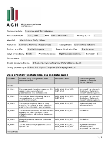 Nazwa modułu: Rok akademicki: Wydział: Kierunek: Systemy geoinformatyczne 2013/2014 Kod: WIN-2-102-WN-s Punkty ECTS: 2 Wiertnictwa, Nafty i Gazu Inżynieria Naftowa i Gazownicza Poziom studiów: Studia II stopnia Język wykładowy: Polski Specjalność: Wiertnictwo naftowe Forma i tryb studiów: Profil kształcenia: Stacjonarne Ogólnoakademicki (A) Semestr: 1 Strona www: Osoba odpowiedzialna: dr hab. inż. Fąfara Zbigniew ([email protected]) Osoby prowadzące: dr hab. inż. Fąfara Zbigniew ([email protected]) Opis efektów kształcenia dla modułu zajęć Kod EKM Student, który zaliczył moduł zajęć wie/umie/potrafi Powiązania z EKK Sposób weryfikacji efektów kształcenia (forma zaliczeń) M_W001 Zna organizację i strukturę systemu GIS, rodzaj realizowanych funkcji, przeznaczenie oraz zastosowania. IN2A_W03, IN2A_W07, IN2A_W10 Aktywność na zajęciach, Kolokwium, Wykonanie ćwiczeń laboratoryjnych M_W002 Zna rodzaje danych i modele danych wykorzytywane w systemach geoinformatycznych. IN2A_W03, IN2A_W07, IN2A_W10 Aktywność na zajęciach, Kolokwium, Wykonanie ćwiczeń laboratoryjnych M_W003 Zna tematyczne bazy danych, które mogą być przydatne w pracy inżyniera przemysłu naftowego i gazowniczego. IN2A_W03, IN2A_W07 Wykonanie ćwiczeń laboratoryjnych M_W004 Zna sposoby i problemy odzwierciedlania powierzchni Ziemi na płaszczyźnie, układy i systemy odniesienia stosowane w Polsce. IN2A_W03, IN2A_W07 Kolokwium M_W005 Ma ogólną wiedzę na temat systemów lokalizacji. IN2A_W03, IN2A_W07 Kolokwium M_W006 Zna na podstawowym poziomie jeden system GIS. IN2A_W03, IN2A_W07, IN2A_W09, IN2A_W10 Wykonanie ćwiczeń laboratoryjnych, Aktywność na zajęciach Wiedza Umiejętności 1/9 Karta modułu - Systemy geoinformatyczne M_U001 Potrafi obsługiwać dostępne w Internecie systemy zarządzające danymi przestrzennymi znając ich uwarunkowania i możliwości. IN2A_U01, IN2A_U03, IN2A_U09, IN2A_U10, IN2A_U11 Wykonanie ćwiczeń laboratoryjnych M_U002 Potrafi znaleźć i wykorzystać w pracy informacje zgromadzone w tematycznych bazach danych związanych z przemysłem naftowym i gazowniczym. IN2A_U01, IN2A_U03, IN2A_U09, IN2A_U10 Wykonanie ćwiczeń laboratoryjnych M_U003 Potrafi zarządzać danymi przestrzennymi dotyczącymi obiektów związanych z zakresem prowadzonej działalności. IN2A_U09, IN2A_U10, IN2A_U11 Wykonanie ćwiczeń laboratoryjnych M_U004 Potrafi zarządzać danymi w przykładowym systemie GIS. IN2A_U03, IN2A_U10, IN2A_U11 Wykonanie ćwiczeń laboratoryjnych M_U005 Potrafi stworzyć system bazy danych przestrzennych do zarządzania informacjami wynikającymi z charakteru prowadzonej działalności. IN2A_U10, IN2A_U11, IN2A_U15 Praca dyplomowa, Wykonanie ćwiczeń laboratoryjnych Kompetencje społeczne M_K001 Potrafi działać w sposób kreatywny przy pozyskiwaniu i wykorzystywaniu informacji geoporzestrzennych. IN2A_K01, IN2A_K05 Aktywność na zajęciach, Wykonanie ćwiczeń laboratoryjnych M_K002 Rozumie potrzebę ciągłego dokształcania się w zakresie metod i środków stosowanych przy analizach geoprzestrzennych. IN2A_K03, IN2A_K04, IN2A_K07 Aktywność na zajęciach, Wykonanie ćwiczeń laboratoryjnych M_K003 Ma świadomość ogromu możliwości jakie daje stosowanie w pracy nowoczesnych systemów geoinformatycznych. IN2A_K03, IN2A_K04, IN2A_K07 Aktywność na zajęciach, Wykonanie ćwiczeń laboratoryjnych M_K004 Potrafi działać w sposób profesjonalny i przedsiębiorczy przy podejmowaniu decyzji dotycząców zarządzania obiektami przestrzennymi. IN2A_K01, IN2A_K02, IN2A_K04 Wykonanie ćwiczeń laboratoryjnych Matryca efektów kształcenia w odniesieniu do form zajęć Zajęcia praktyczne - - - - E-learning Zajęcia seminaryjne + Zajęcia Konwersatori um - Zajęcia terenowe Ćwiczenia projektowe + Inne Ćwiczenia laboratoryjne Forma zajęć Ćwiczenia audytoryjne Student, który zaliczył moduł zajęć wie/umie/potrafi Wykład Kod EKM Wiedza M_W001 Zna organizację i strukturę systemu GIS, rodzaj realizowanych funkcji, przeznaczenie oraz zastosowania. - - - - 2/9 Karta modułu - Systemy geoinformatyczne M_W002 Zna rodzaje danych i modele danych wykorzytywane w systemach geoinformatycznych. + - - - - - - - - - - M_W003 Zna tematyczne bazy danych, które mogą być przydatne w pracy inżyniera przemysłu naftowego i gazowniczego. + - + - - - - - - - - M_W004 Zna sposoby i problemy odzwierciedlania powierzchni Ziemi na płaszczyźnie, układy i systemy odniesienia stosowane w Polsce. + - - - - - - - - - - M_W005 Ma ogólną wiedzę na temat systemów lokalizacji. + - - - - - - - - - - M_W006 Zna na podstawowym poziomie jeden system GIS. - - + - - - - - - - - M_U001 Potrafi obsługiwać dostępne w Internecie systemy zarządzające danymi przestrzennymi znając ich uwarunkowania i możliwości. - - + - - - - - - - - M_U002 Potrafi znaleźć i wykorzystać w pracy informacje zgromadzone w tematycznych bazach danych związanych z przemysłem naftowym i gazowniczym. + - + - - - - - - - - M_U003 Potrafi zarządzać danymi przestrzennymi dotyczącymi obiektów związanych z zakresem prowadzonej działalności. - - + - - - - - - - - M_U004 Potrafi zarządzać danymi w przykładowym systemie GIS. + - + - - - - - - - - M_U005 Potrafi stworzyć system bazy danych przestrzennych do zarządzania informacjami wynikającymi z charakteru prowadzonej działalności. - - + - - - - - - - - Umiejętności Kompetencje społeczne M_K001 Potrafi działać w sposób kreatywny przy pozyskiwaniu i wykorzystywaniu informacji geoporzestrzennych. - - + - - - - - - - - M_K002 Rozumie potrzebę ciągłego dokształcania się w zakresie metod i środków stosowanych przy analizach geoprzestrzennych. + - - - - - - - - - - M_K003 Ma świadomość ogromu możliwości jakie daje stosowanie w pracy nowoczesnych systemów geoinformatycznych. + - + - - - - - - - - 3/9 Karta modułu - Systemy geoinformatyczne M_K004 Potrafi działać w sposób profesjonalny i przedsiębiorczy przy podejmo