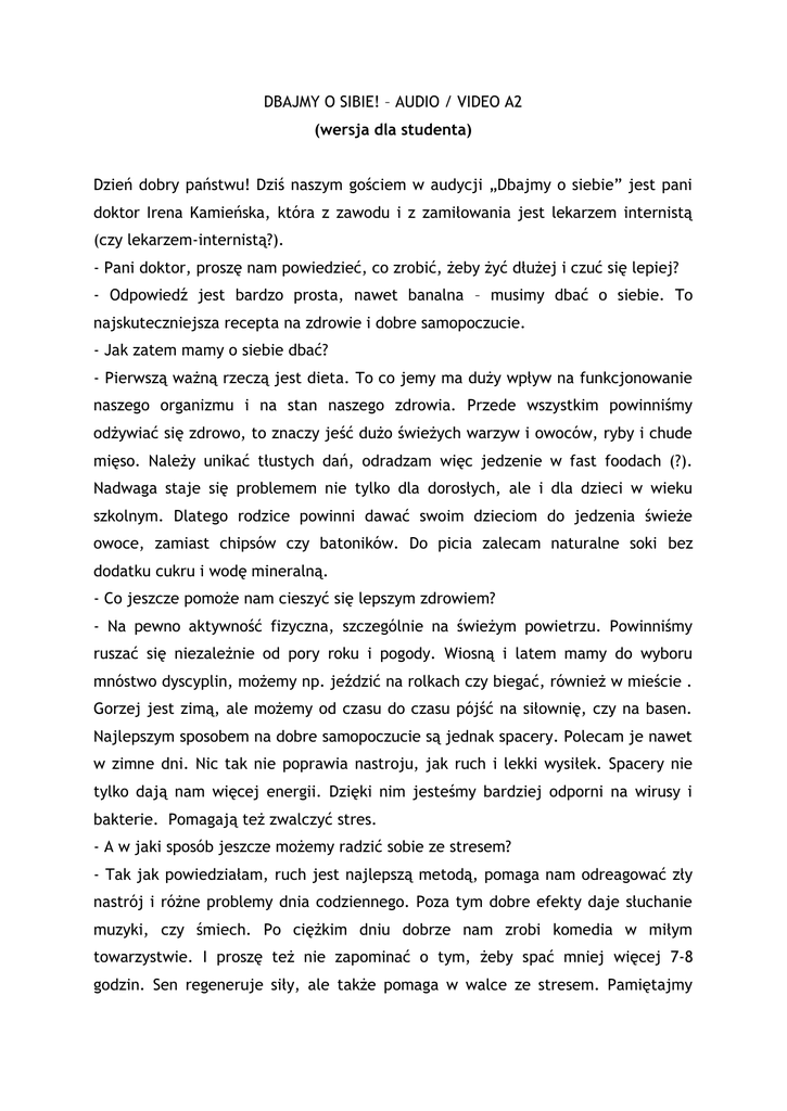 DBAJMY O SIBIE! – AUDIO / VIDEO A2 (wersja dla studenta) Dzień dobry państwu! Dziś naszym gościem w audycji „Dbajmy o siebie” jest pani doktor Irena Kamieńska, która z zawodu i z zamiłowania jest lekarzem internistą (czy lekarzem-internistą?). - Pani doktor, proszę nam powiedzieć, co zrobić, żeby żyć dłużej i czuć się lepiej? - Odpowiedź jest bardzo prosta, nawet banalna – musimy dbać o siebie. To najskuteczniejsza recepta na zdrowie i dobre samopoczucie. - Jak zatem mamy o siebie dbać? - Pierwszą ważną rzeczą jest dieta. To co jemy ma duży wpływ na funkcjonowanie naszego organizmu i na stan naszego zdrowia. Przede wszystkim powinniśmy odżywiać się zdrowo, to znaczy jeść dużo świeżych warzyw i owoców, ryby i chude mięso. Należy unikać tłustych dań, odradzam więc jedzenie w fast foodach (?). Nadwaga staje się problemem nie tylko dla dorosłych, ale i dla dzieci w wieku szkolnym. Dlatego rodzice powinni dawać swoim dzieciom do jedzenia świeże owoce, zamiast chipsów czy batoników. Do picia zalecam naturalne soki bez dodatku cukru i wodę mineralną. - Co jeszcze pomoże nam cieszyć się lepszym zdrowiem? - Na pewno aktywność fizyczna, szczególnie na świeżym powietrzu. Powinniśmy ruszać się niezależnie od pory roku i pogody. Wiosną i latem mamy do wyboru mnóstwo dyscyplin, możemy np. jeździć na rolkach czy biegać, również w mieście . Gorzej jest zimą, ale możemy od czasu do czasu pójść na siłownię, czy na basen. Najlepszym sposobem na dobre samopoczucie są jednak spacery. Polecam je nawet w zimne dni. Nic tak nie poprawia nastroju, jak ruch i lekki wysiłek. Spacery nie tylko dają nam więcej energii. Dzięki nim jesteśmy bardziej odporni na wirusy i bakterie. Pomagają też zwalczyć stres. - A w jaki sposób jeszcze możemy radzić sobie ze stresem? - Tak jak powiedziałam, ruch jest najlepszą metodą, pomaga nam odreagować zły nastrój i różne problemy dnia codziennego. Poza tym dobre efekty daje słuchanie muzyki, czy śmiech. Po ciężkim dniu dobrze nam zrobi komedia w miłym towarzystwie. I proszę też nie zapominać o tym, żeby spać mniej więcej 7-8 godzin. Sen regeneruje siły, ale także pomaga w walce ze stresem. Pamiętajmy też, żeby od czasu do czasu zrobić sobie małą przyjemność, bez okazji. Możemy pójść do kina, czy kupić sobie jakiś drobiazg. I nie zapominajmy o spotkaniach z przyjaciółmi. To przecież ludzie potrafią najlepiej poprawić nam humor. I proszę pamiętać – najgorszym sposobem na stres jest picie alkoholu czy palenie papierosów. Jeśli ktoś pali papierosy, już dziś powinien zdecydować, żeby rzucić palenie. - Pani doktor, bardzo dziękuję za naszą rozmowę i zapraszam ponownie do naszego studia. Mam nadzieję, że zobaczymy się już wkrótce. - Dziękuję bardzo i do usłyszenia! ĆWICZENIA PRZED CZYTANIEM: 1. Proszę przeczytać przysłowia i napisać odpowiedzi na pytania: „W ZDROWYM CIELE ZDROWY DUCH” „SPORT TO ZDROWIE” „ZDROWY JAK RYBA” „SILNY JAK KOŃ” 1. Jak rozumiesz te zdania? Czy zgadzasz się z nimi? 2. Jakie zwroty o zdrowiu funkcjonują w Twoim krajach? 3. W jaki sposób możemy dbać o zdrowie i samopoczucie? 4. Co szkodzi zdrowiu? 5. Jak myślisz, co to są choroby cywilizacyjne? 6. Co myślisz o dietach-cud? 7. Kto to jest hipochondryk? 2. Czy znasz te słowa? Jeśli nie, sprawdź ich znaczenie w słowniku: dbać o (kogo? co? + biernik) – dbać o siebie, o dzieci, o zdrowie, o kondycję, itp., odżywiać się zdrowo, mieć nadwagę, być na diecie, rzucać/rzucić palenie odreagowywać/odreagować stres, uprawiać sport, ćwiczyć regularnie, chodzić na siłownię, odpoczywać/odpocząć na świeżym powietrzu, zdrowie, samopoczucie, kondycja fizyczna (mieć kondycję/nie mieć kondycji) być w dobrym/złym humorze = być w dobrym/złym nastroju, (być) zestresowany, wypoczęty, wyspany/niewyspany, przygnębiony, itp. skarżyć się na coś (+ biernik), skarżyć się na ból głowy, na złe samopoczucie, boli (kogo? + biernik) mnie głowa, kręgosłup, itp., bolą (kogo? + biernik) mnie plecy, oczy, itp., mam (co? + biernik) kaszel, migrenę, alergię, itp., choroby cywilizacyjne, (być) odporny na coś (+biernik) stres, wirusy, itp. lekarz internista = lekarz pierwszego kontaktu lekarze specjaliści, np. alergolog, laryngolog, dermatolog, psychiatra, itp. doradzać / doradzić coś odradzać / odradzić coś 3. Poniższe słowa pochodzą z tekstu, który za chwilę przeczytasz. Proszę użyć tych słów w zadaniach (uwaga na formy!!) z zawodu unikać z zamiłowania rzucić palenie recepta samopoczucie mieć wpływ sen odradzać nadwaga odżywiać się na świeżym powietrzu odporny 0. ……….. jestem nauczycielką, ale pracuję w wydawnictwie. Z zawodu… 1. Muszę ………………………………………………………… niektórych produktów chemicznych, bo mam na nie alergię. 2. Kiedy odpoczywam ……………………………………………………………………….., czuję się doskonale! 3. Znajomi ……………………………………………… mi tego lekarza, bo jest bardzo drogi. 4. Meteopaci często narzekają na złe ……………………………………………………………., np. kiedy zmienia się pogoda. 5. Kilka razy próbowałem ………………………………………………………. i w końcu udało mi się! 6. W dzisiejszych czasach ludzie ……………………………………………………. Bardzo nieregularnie i niezdrowo. 7. W Polsce większość antybiotyków można kupić tylko na ………………………………… 8. Coraz więcej ludzi ma problemy z ……………………………………………., dlatego tak ważna jest właściwa dieta i aktywność fizyczna. 9. Skończyłam ekonomię i pracuję w swoim zawodzie, ale ………………………………………………….. jestem malarką. 10. ………