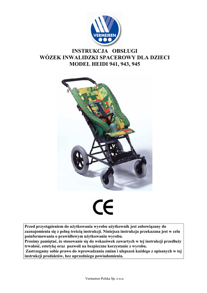 INSTRUKCJA OBSŁUGI WÓZEK INWALIDZKI SPACEROWY DLA DZIECI MODEL HEIDI 941, 943, 945 Przed przystąpieniem do uŜytkowania wyrobu uŜytkownik jest zobowiązany do zaznajomienia się z pełną treścią instrukcji. Niniejsza instrukcja przekazana jest w celu poinformowania o prawidłowym uŜytkowaniu wyrobu. Prosimy pamiętać, Ŝe stosowanie się do wskazówek zawartych w tej instrukcji przedłuŜy trwałość, estetykę oraz pozwoli na bezpieczne korzystanie z wyrobu. Zastrzegamy sobie prawo do wprowadzania zmian i ulepszeń kaŜdego z opisanych w tej instrukcji produktów, bez uprzedniego powiadomienia. Vermeiren Polska Sp. z o.o. Vermeiren Polska Sp. z o.o. Wózek inwalidzki spacerowy dla dzieci model Heidi 941, 943, 945 Wstęp Pragniemy podziękować Państwu za zaufanie, jakim nas obdarzyliście dokonując wyboru zakupu naszego wózka. JeŜeli jest to Państwa pierwszy wózek, radzimy dokładnie przeczytać ten podręcznik. On pomoŜe zapoznać się z tym sprzętem, da praktyczne rady pomocnicze przy uŜywaniu go przez uŜytkownika. Udzieli wskazówek jak zadbać o wózek i jak go właściwie obsługiwać. Przestrzeganie niniejszych rad umoŜliwi zachowanie doskonałego stanu wózka przez lata ciągłego uŜytkowania. JeŜeli będziecie Państwo mieli dodatkowe pytania po przeczytaniu wszystkich informacji, prosimy skonsultować się z najbliŜszym przedstawicielem. 1. Opis modeli 1.1 WyposaŜenie KaŜdy wózek w standardzie posiada: • profilowane siedzisko wypełnione gąbką • deskę ortopedyczną na plecy • pasy bezpieczeństwa (barkowo-brzuszne) • klin • regulowane podnóŜki • pompkę • kartę gwarancyjną • instrukcje obsługi Wózki Heidi 941, 943 i 945 przeznaczone są dla dzieci z dysfunkcją narządów ruchu i po poraŜeniach mózgowych. Bogata gama kolorystyczna ram i tapicerki oraz wygodna pozycja siedzenia zapewnia komfort fizyczny i psychiczny dziecku poruszającemu się na wózku. Heidi 941 Najmniejszy rozmiarowo wózek dla dzieci w wieku do 6 lat i wzroście do 115 cm. Heidi 943 Pośredni rozmiarowo wózek dla dzieci w wieku do 12 lat i wzroście do 135 cm. Heidi 945 Największy rozmiarowo wózek dla dzieci w wieku do 15 lat i wzroście do 155 cm. Data wydania 2003-01-14 / Data ostatniej aktualizacji 2008-10-06 strona 2 / 7 Vermeiren Polska Sp. z o.o. Wózek inwalidzki spacerowy dla dzieci model Heidi 941, 943, 945 2. Opis ogólny 2.1 Rozkładanie i składanie Rozkładanie wózka Aby rozłoŜyć wózek naleŜy pociągnąć do góry za uchwyt do prowadzenia wózka aŜ do całkowitego rozłoŜenia. Następnie naleŜy zabezpieczyć wózek przed jego samoczynnym złoŜeniem, poprzez załoŜenie po obydwu jego stronach plastikowych klamer na rury oparcia i uchwytu. Składanie wózka Składanie wózka odbywa się w odwrotnej kolejności do rozkładania. Po złoŜeniu gabaryty wózka się zmniejszają , co ułatwia jego przechowywanie oraz przewoŜenie nawet w stosunkowo małych autach. 2.2 Mocowanie siedziska i klina Do konstrukcji wózka jest przymocowane na stałe siedzisko z ceraty. Po rozłoŜeniu wózka naleŜy ułoŜyć deskę ortopedyczną w miejscu oparcia pleców, tak aby szczeliny w desce pokrywały się z szczelinami w ceracie siedziska. Data wydania 2003-01-14 / Data ostatniej aktualizacji 2008-10-06 strona 3 / 7 Vermeiren Polska Sp. z o.o. Wózek inwalidzki spacerowy dla dzieci model Heidi 941, 943, 945 Następnie nakłada się tapicerowane siedzisko i przymocowuje się je za pomocą przyszytych pasów w dwóch miejscach, pod siedziskiem oraz w górnej części oparcia, tak aby brzegi tapicerki były wywinięte na zewnątrz. Do tak przygotowanego siedziska mocujemy dostarczony klin w trzech dowolnych pozycjach, unieruchamiając go nakrętką motylkową pod siedziskiem. 2.3 Zakładanie paska W następnej kolejności zakładamy pasy barkowe przekładając je w szczelinach w oparciu. Zszyty koniec paska zakładamy na pasek zamocowany do konstrukcji wózka. Tak przygotowane paski skutecznie chronią dziecko przed wychylaniem się do przodu i przechylaniem na boki. 2.4 Regulacja kąta nachylenia oparcia Oparcie moŜna regulować zaleŜnie od potrzeby i ustawiać w dwóch pozycjach. Aby zmienić pozycję oparcia naleŜy pociągnąć w górę za górną część oparcia obszytego siedziskiem z ceraty a następnie podnieść lub opuścić oparcie. Oparcie zostanie zablokowane bez konieczności dokręcania śrub. Data wydania 2003-01-14 / Data ostatniej aktualizacji 2008-10-06 strona 4 / 7 Vermeiren Polska Sp. z o.o. Wózek inwalidzki spacerowy dla dzieci model Heidi 941, 943, 945 2.5 Regulacja wysokości podnóŜka PodnóŜek moŜemy ustawiać w czterech Ŝądanych wysokościach tak aby stopy dziecka miały prawidłowe podparcie. Regulację wysokości podnóŜka dokonujemy za pomocą zatrzasków blokujących. NaleŜy ustawić podnóŜek w prawidłowej pozycji i za pomocą zatrzasków zablokować po obydwu jego stronach. 3. Konserwacja 3.1 Co miesiąc Opony Sprawdzić ciśnienie w oponach: Średnica koła 200 mm 310 mm Max ciśnienie 2,5 bara 2,5 bara NaleŜy pamiętać aby nie przekraczać dozwolonego ciśnienia. Systematycznie sprawdzać stan opon, w przypadku konieczności ich wymiany zaleca się jednoczesną wymianę opon na jednej osi. Hamulce NaleŜy sprawdzić sprawność hamulców po odpowiednim napompowaniu kół. NaleŜy upewnić się, Ŝe hamulec styka się z powierzchnią i nie pozwala się kręcić kołu. Tapicerka i pasy NaleŜy czyścić tapicerkę wilgotną szmatką. W razie potrzeby moŜna uŜyć nie Ŝrącego środka czyszczącego. Sprawdzić czy tapicerka i pasy nie są uszkodzone, jeśli tak naleŜy je wymienić. Data wydania 2003-01-14 / Data ostatniej aktualizacji 2008-10-06 strona 5 / 7 Vermeiren Polska Sp. z o.o. Wózek inwalidzki spacerowy dla dzieci model Heidi 941, 943, 945 3.2 Co rok Zalecamy raz w roku dokładny przegląd wózka w tym sprawdzenie wszystkich nakrętek i śrub. Właściwe przestrzeganie powyŜszych zasad zagwa