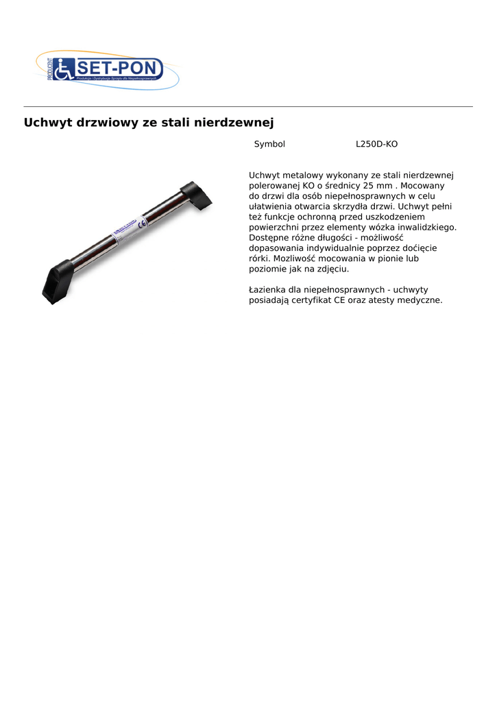 Uchwyt drzwiowy ze stali nierdzewnej Symbol L250D-KO Uchwyt metalowy wykonany ze stali nierdzewnej polerowanej KO o średnicy 25 mm . Mocowany do drzwi dla osób niepełnosprawnych w celu ułatwienia otwarcia skrzydła drzwi. Uchwyt pełni też funkcje ochronną przed uszkodzeniem powierzchni przez elementy wózka inwalidzkiego. Dostępne różne długości - możliwość dopasowania indywidualnie poprzez doćięcie rórki. Mozliwość mocowania w pionie lub poziomie jak na zdjęciu. Łazienka dla niepełnosprawnych - uchwyty posiadają certyfikat CE oraz atesty medyczne. Powered by TCPDF (www.tcpdf.org)