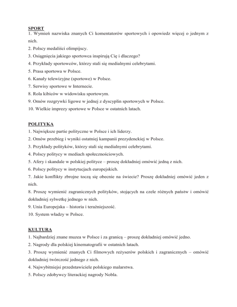 SPORT 1. Wymień nazwiska znanych Ci komentatorów sportowych i opowiedz więcej o jednym z nich. 2. Polscy medaliści olimpijscy. 3. Osiągnięcia jakiego sportowca inspirują Cię i dlaczego? 4. Przykłady sportowców, którzy stali się medialnymi celebrytami. 5. Prasa sportowa w Polsce. 6. Kanały telewizyjne (sportowe) w Polsce. 7. Serwisy sportowe w Internecie. 8. Rola kibiców w widowisku sportowym. 9. Omów rozgrywki ligowe w jednej z dyscyplin sportowych w Polsce. 10. Wielkie imprezy sportowe w Polsce w ostatnich latach. POLITYKA 1. Największe partie polityczne w Polsce i ich liderzy. 2. Omów przebieg i wyniki ostatniej kampanii prezydenckiej w Polsce. 3. Przykłady polityków, którzy stali się medialnymi celebrytami. 4. Polscy politycy w mediach społecznościowych. 5. Afery i skandale w polskiej polityce – proszę dokładniej omówić jedną z nich. 6. Polscy politycy w instytucjach europejskich. 7. Jakie konflikty zbrojne toczą się obecnie na świecie? Proszę dokładniej omówić jeden z nich. 8. Proszę wymienić zagranicznych polityków, stojących na czele różnych państw i omówić dokładniej sylwetkę jednego w nich. 9. Unia Europejska – historia i teraźniejszość. 10. System władzy w Polsce. KULTURA 1. Najbardziej znane muzea w Polsce i za granicą – proszę dokładniej omówić jedno. 2. Nagrody dla polskiej kinematografii w ostatnich latach. 3. Proszę wymienić znanych Ci filmowych reżyserów polskich i zagranicznych – omówić dokładniej twórczość jednego z nich. 4. Najwybitniejsi przedstawiciele polskiego malarstwa. 5. Polscy zdobywcy literackiej nagrody Nobla. 6. Balet, opera, operetka, dramat, komedia – czym różnią się od siebie poszczególne gatunki teatralne? 7. Zabytki w Twoim regionie. 8. Życie kulturalne w Twoim regionie. 9. Filmy zagraniczne, które zdobyły Oscara – proszę omówić wybrany. 10. Polscy muzycy, kompozytorzy i piosenkarze – proszę omówić dokładniej sylwetkę jednego z nich. RELIGIA 1. Dogmat o Niepokalanym Poczęciu Maryi – historia i treść. 2. Pismo Święte – list Boga do ludzi. 3. Jezus Chrystus – Bóg i człowiek. 4. Święty Paweł Apostoł i jego rola w Kościele. 5. Znaczenie pontyfikatu św. Jana Pawła II dla Polski, Kościoła i świata. 6. Polscy święci i błogosławieni. Proszę dokładniej omówić sylwetkę jednego z nich. 7. Proszę wymienić sakramenty święte i dokładniej omówić jeden z nich. 8. Przykazania Boże i Przykazania kościelne. 9. Zmartwychwstanie Jezusa Chrystusa jako najważniejszy moment w dziejach świata – dlaczego? 10. Stworzenie świata: czy Pismo święte i teoria ewolucji wykluczają się? EKONOMIA 1. Czy Polska może i powinna przyjmować euro? Dlaczego? 2. Polskie serwisy internetowe, kanały telewizyjne i tytuły prasowe o tematyce ekonomicznej. 3. Na czym polegała pułapka kredytów we frankach i innych walutach obcych? 4. Wymień znanych Ci dziennikarzy ekonomicznych i przybliż sylwetkę jednego z nich. 5. Na czym polegał plan Balcerowicza i jakie były jego efekty? 6. Najbardziej znane i silne waluty na świecie. 7. Giełda Papierów Wartościowych w Warszawie na tle innych giełd w Europie i na świecie. 8. Czym różni się gospodarka socjalistyczna od kapitalistycznej? 9. Dlaczego mówi się, że obecny system emerytalny w Polsce grozi brakiem emerytur dla przyszłych pokoleń? 10. Największe afery gospodarcze w Polsce. Omów jedną z nich. TURYSTYKA 1. Najbardziej znane miejsca pielgrzymkowe w Polsce. 2. Najbardziej znane miejsca pielgrzymkowe na świecie. 3. Wymień znane Ci linie lotnicze i omów dokładniej jedną z nich. 4. Najsłynniejsze polskie kurorty i ośrodki turystyczne. 5. Turystyczne atrakcje w Twoim regionie. 6. Prasa i strony internetowe o tematyce turystycznej – polskie i zagraniczne. 7. Najbardziej znani polscy dziennikarze-podróżnicy. 8. Najbardziej popularne kierunki wakacyjne. 9. Polscy turyści za granicą – stereotypy i fakty. 10. Niebezpieczeństwa związane z turystyką i podróżowaniem. MEDIA 1. Najbardziej znani polscy dziennikarze. 2. Ogólnopolskie stacje radiowe. 3. Ogólnopolskie stacje telewizyjne. 4. Media lokalne w Twoim regionie. 5. Największe i najbardziej znaczące dzienniki ogólnopolskie (gazety). 6. Media katolickie w Polsce. 7. Cyfryzacja telewizji w Polsce. 8. Czy Internet stanowi zagrożenie dla prasy? Uzasadnij swoją opinię. 9. Wymień znane Ci tytuły prasy młodzieżowej i omów jeden z nich. 10. Z jakich mediów społecznościowych korzystasz? Omów je.