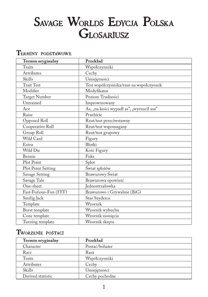 Savage Worlds Edycja Polska Glosariusz Terminy podstawowe Termin oryginalny Traits Attributes Skills Trait Test Modifier Target Number Untrained Ace Raise Opposed Roll Cooperative Roll Group Roll Wild Card Extra Wild Die Bennie Plot Point Plot Point Setting Savage Setting Savage Tale One-sheet Fast-Furious-Fun (FFF) Smilig Jack Template Burst template Cone template Turning template Przekład Współczynniki Cechy Umiejętności Test współczynnika/rzut na współczynnik Modyfikator Poziom Trudności Improwizowany As, „na kości wypadł as”, „wyrzucił asa” Przebicie Rzut/test przeciwstawny Rzut/test wspomagany Rzut/test grupowy Figury Blotki Kość Figury Fuks Splot Świat splotów Brawurowy Świat Brawurowa opowieść Jednostrzałowka Brawurowo i Grywalnie (BiG) Staś Szyderca Wzornik Wzornik wybuchu Wzornik zionięcia Wzornik skrętu Tworzenie postaci Termin oryginalny Character Race Traits Attributes Skills Derived statistic Przekład Postać/bohater Rasa Współczynniki Cechy Umiejętności Cechy pochodne 1 Agility Smarts Spirit Strenght Vigor Pace Parry Charisma Toughness Edge Hindrance Experience (points) Rank Novice Seasoned Veteran Heroic Legendary Zręczność (Zr) Spryt (Sp) Duch (Du) Siła (Si) Wigor (Wi) Tempo Obrona Charyzma Wytrzymałość Przewaga Zawada Doświadczenia (punkty) Ranga Nowicjusz Doświadczony Weteran Heros Legenda Umiejętności Termin oryginalny Skill Boating Climbing Driving Fighting Gambling Guts Healing Intimidation Investigation Knowledge (arcane, battle) Lockpicking Notice Persuasion Piloting Repair Riding Shooting Stealth Streetwise Survival Swimming Taunt Przekład Umiejętność Żeglowanie Wspinaczka Prowadzenie Walka Hazard Odwaga Leczenie Zastraszanie Wyszukiwanie Wiedza (tajemna, strategia) Włamywanie Spostrzegawczość Przekonywanie Pilotowanie Reperowanie Jeździectwo Strzelanie Skradanie Wypytywanie Przetrwanie Pływanie Wyśmiewanie 2 Throwing Tracking Faith Psionisc Spellcasting Superpower Weird Science Common knowledge Rzucanie Tropienie Wiara Psionika Rzucanie czarów Supermoc Niesamowita nauka Wiedza ogólna Zawady Termin oryginalny Hindrance Minor Major All Thumbs Anemic Arrogant Bad Eyes Bad Luck Big Mouth Blind Bloodthirsty Cautious Clueless Code of Honor Curious Death Wish Delusional Doubting Thomas Elderly Enemy Greedy Habit Hard of Hearing Heroic Illiterate Lame Loyal Mean Obese One Arm One Eye One Leg Outsider Przekład Zawada Drobna Poważna Niezdara Chuchro Arogancki Kiepski wzrok Pech Długi język Ślepiec Krwiożerczy Ostrożny Tępak Honorowy Ciekawski Straceniec Świr Niedowiarek Ramol Wróg Chciwy Nawyk Przygłuchy Bohaterski Analfabeta Kulawy Lojalny Wredny Grubas Jednoręki Jednooki Jednonogi Odszczepieniec 3 Overconfident Pacifist Phobia Poverty Quirk Small Stubborn Ugly Vengeful Vow Wanted Yellow Young Chojrak Pacyfista Fobia Biedak Dziwactwo Konus Uparciuch Brzydal Mściwy Zobowiązanie Poszukiwany Tchórz Dzieciak Przewagi Termin oryginalny Edges Background Edges Alertness Ambidextrous Arcane Background Arcane Resistance Improved Arcane Resistance Attractive Very Attractive Berserk Brawny Fast Healer Luck Great Luck Noble Quick Rich Filthy Rich Combat Edges Block Improved Block Combat Reflexes Dodge Improved Dodge First Strike Improved First Strike Fleet-Footed Florentine Przekład Przewagi Przewagi wrodzone Czujny Oburęczny Zdolności nadprzyrodzone Odporny na moc Odporniejszy na moc Ładny Śliczny Berserk Krzepki Końskie zdrowie Szczęściarz Cholerny szczęściarz Szycha Błyskawiczny refleks Bogaty Obrzydliwie bogaty Przewagi bojowe Garda Podwójna garda Zaprawiony w walce Unik Błyskawiczny unik Szybki cios Błyskawiczny cios Chyży Szermierz 4 Frenzy Improved Frenzy Giant Killer Hard to Kill Harder to Kill Level Headed Improved Level Headed Marksman Nerves of Steel Improved Nerves of Steel No Mercy Quick Draw Rock and Roll! Steady Hands Sweep Improved Sweep Trademark Weapon Improved Trademark Weapon Two-Fisted Leadership Edges Command Fervor Hold the Line! Inspire Natural Leader Power Edges New Power Power Points Rapid Recharge Improved Rapid Recharge Soul Drain Professional Edges Ace Acrobat Champion Gadgetter Holy/Unholy Warrior Investigator Jack-of-all-Trades McGyver Mentalist Mr. Fix it Scholar Thief Grad ciosów Nawałnica ciosów Zabójca olbrzymów Twardziel Niezniszczalny Opanowany Wyjątkowo opanowany Sokole oko Nerwy ze stali Nerwy z tytanu Bez przebaczenia Dobywanie Rock and Roll! Pewna ręka Zamaszyste cięcie Niezwykle zamaszyste cięcie Ulubiona broń Ukochana broń Podwójne uderzenie Przewagi przywódcze Baczność! Do szturmu! Nie przejdą! Trzymać szyk! Urodzony przywódca Przewagi nadprzyrodzone Nowa moc Punkty mocy Odzyskiwanie mocy Regeneracja mocy Wyssanie duszy Przewagi zawodowe As Akrobata Wybraniec Pomysłowy Dobromir Wojownik Światła/Ciemności Badacz Wszechstronny McGyver Mentalista Złota rączka Uczony Złodziej 5 Wizard Woodsman Social Edges Charismatic Common Bond Connections Strong Willed Weird Edges Beast Bond Beast Master Danger Sense Healer Wild Card Edges Dead Shot Mighty Blow Power Surge Legendary Edges Followers Professional Expert Master Sidekick Though as Nails Improved Though as Nails Weapon Master Master of Arms Czarodziej Tropiciel Przewagi społeczne Charyzmatyczny Prawdziwy przyjaciel Koneksje Charakterny Przewagi niesamowite Przyjaciel zwierząt Władca zwierząt Szósty zmysł Uzdrowiciel Przewagi Figur Zabójczy strzał Zabójczy cios Przypływ mocy Przewagi legendarne Podwładni Zawodowiec Ekspert Mistrz Pomagier Twardy jak skała Twardy jak diament Fechmistrz Arcyfechmistrz Moce Termin oryginalny Power Power Points Arcane skill Range Duration Trappings Armor Barrier Beast Friend Blast Bolt Boost/Lower Trait Burrow Burst Deflection Przekład Moc Punkty mocy Umiejętność nadprzyrodzona Zasięg Czas trwania Warianty Pancerz Bariera Mowa zwierząt Wybuch Pocisk Podkręcenie/przykręcenie Kret Rozprysk Odbicie 6 Det/Con Arcana Dispel Elemental Manip