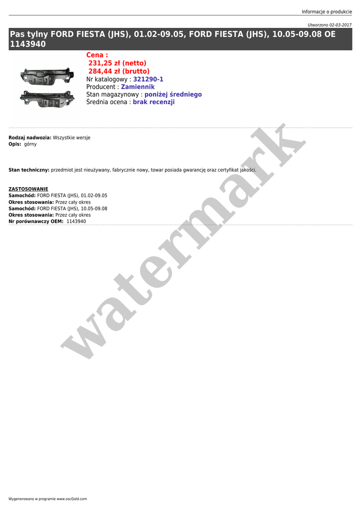 Informacje o produkcie Utworzono 02-03-2017 Pas tylny FORD FIESTA (JHS), 01.02-09.05, FORD FIESTA (JHS), 10.05-09.08 OE 1143940 Cena : 231,25 zł (netto) 284,44 zł (brutto) Rodzaj nadwozia: Wszystkie wersje Opis: górny er m ar k Nr katalogowy : 321290-1 Producent : Zamiennik Stan magazynowy : poniżej średniego Średnia ocena : brak recenzji Stan techniczny: przedmiot jest nieużywany, fabrycznie nowy, towar posiada gwarancję oraz certyfikat jakości. w at ZASTOSOWANIE Samochód: FORD FIESTA (JHS), 01.02-09.05 Okres stosowania: Przez cały okres Samochód: FORD FIESTA (JHS), 10.05-09.08 Okres stosowania: Przez cały okres Nr porównawczy OEM: 1143940 Wygenerowano w programie www.oscGold.com
