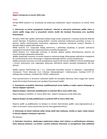 Temat: Raport miesięczny za marzec 2016 roku. Treść: Zarząd MGM Systems S.A. przekazuje do publicznej wiadomości raport miesięczny za marzec 2016 roku. 1. Informacje na temat wystąpienia tendencji i zdarzeń w otoczeniu rynkowym spółki, które w ocenie spółki mogą mieć w przyszłości istotne skutki dla kondycji finansowej oraz wyników finansowych. W marcu 2016 roku Spółka realizowała kolejne etapy umów związanych z budową systemów B2B dla swoich klientów. Prowadzono szereg działań i rozmów odnośnie zwiększania sprzedaży w kraju i za granicą. Spółka kontynuowała intensywne negocjacje odnośnie pozyskania nowych klientów w sprawie objęcia opieką informatyczną. MGM Systems S.A. rozpoczęło dialog techniczny z jednostką wojskową w sprawie wdrożenia rozwiązania tworzenia kopii zapasowej klastra wysokiej dostępności. MGM Systems S.A. rozpoczęła rozmowy w sprawie objęcia opieką informatyczną systemu do tworzenia kopii zapasowej środowiska. Spółka rozpoczęła rozmowy na temat wsparcia merytorycznego dotyczącego wdrożenia rozwiązania do monitorowania ruchu sieciowego u międzynarodowego klienta z branży projektowej. Spółka prowadzi rozmowy na temat przedłużenia wsparcia dla licencji LANDesk w firmie produkcyjnej z branży automotive oraz negocjacje dotyczące wdrożenia klastra wysokiej dostępności dla baz danych. Spółka zależna TeleTechnika Sp. z o.o. realizowała kontrakty zawarte w bieżącym i poprzednich miesiącach. Prace dotyczyły m.in. instalacji niskoprądowych i elektrycznych, instalacji CCTV IP, obsługa placu budowy, instalacji SSP, VESDA i oddymiania. Poza wymienionymi w otoczeniu rynkowym Spółki nie wystąpiły zdarzenia, które mogą mieć istotne skutki dla kondycji finansowej oraz wyników finansowych Spółki. 2. Zestawienie wszystkich informacji opublikowanych przez Spółkę w trybie raportu bieżącego w okresie objętym raportem. Raporty bieżące i okresowe opublikowane w systemie EBI w marcu 2016 roku: Raport bieżący nr 6/2016 z 11 marca 2016 roku - Raport miesięczny za luty 2016 roku. Raporty bieżące nie były publikowane w systemie ESPI w marcu 2016 roku. Raporty spółki są publikowane na bieżąco na stronie internetowej spółki: www.mgmsystems.pl, a także na stronach: www.newconnect.pl oraz www.gpwinfostrefa.pl 3. Informacje na temat realizacji celów emisji, jeżeli taka realizacja, choćby w części, miała miejsce w okresie objętym niniejszym raportem. Nie dotyczy. 4. Kalendarz inwestora, obejmujący wydarzenia mające mieć miejsce w nadchodzącym miesiącu, które dotyczą emitenta i są istotne z punktu widzenia interesów, w szczególności daty publikacji raportów okresowych, planowanych walnych zgromadzeń, otwarcia subskrypcji, spotkań z inwestorami lub analitykami oraz oczekiwany termin publikacji raportu analitycznego. W dniu 13 maja 2016 r. Spółka opublikuje raport kwartalny za I kw. 2016 r. Do 14 maja 2016 r. Spółka opublikuje raport miesięczny za kwiecień 2016 r. Podstawa prawna: Pkt. 16 Dobrych Praktyk Spółek Notowanych na NewConnect Osoby reprezentujące Spółkę: Andrzej Matuła - Członek Zarządu Grzegorz Sawicki - Członek Zarządu