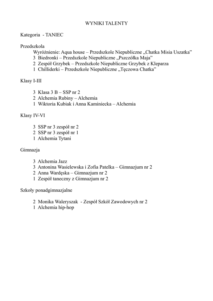 WYNIKI TALENTY Kategoria - TANIEC Przedszkola Wyróżnienie: Aqua house – Przedszkole Niepubliczne „Chatka Misia Uszatka” 3 Biedronki – Przedszkole Niepubliczne „Pszczółka Maja” 2 Zespół Grzybek – Przedszkole Niepubliczne Grzybek z Kleparza 1 Chilliderki – Przedszkole Niepubliczne „Tęczowa Chatka” Klasy I-III 3 Klasa 3 B – SSP nr 2 2 Alchemia Rubiny – Alchemia 1 Wiktoria Kubiak i Anna Kaminiecka – Alchemia Klasy IV-VI 3 SSP nr 3 zespół nr 2 2 SSP nr 3 zespół nr 1 1 Alchemia Tytani Gimnazja 3 3 2 1 Alchemia Jazz Antonina Wasielewska i Zofia Patelka – Gimnazjum nr 2 Anna Wardęska – Gimnazjum nr 2 Zespół taneczny z Gimnazjum nr 2 Szkoły ponadgimnazjalne 2 Monika Waleryszak - Zespół Szkół Zawodowych nr 2 1 Alchemia hip-hop