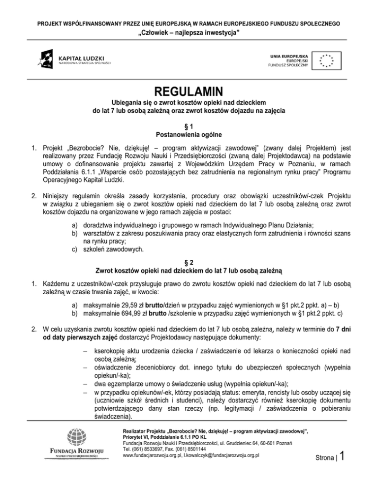 PROJEKT WSPÓŁFINANSOWANY PRZEZ UNIĘ EUROPEJSKĄ W RAMACH EUROPEJSKIEGO FUNDUSZU SPOŁECZNEGO „Człowiek – najlepsza inwestycja” REGULAMIN Ubiegania się o zwrot kosztów opieki nad dzieckiem do lat 7 lub osobą zależną oraz zwrot kosztów dojazdu na zajęcia §1 Postanowienia ogólne 1. Projekt „Bezrobocie? Nie, dziękuję! – program aktywizacji zawodowej” (zwany dalej Projektem) jest realizowany przez Fundację Rozwoju Nauki i Przedsiębiorczości (zwaną dalej Projektodawcą) na podstawie umowy o dofinansowanie projektu zawartej z Wojewódzkim Urzędem Pracy w Poznaniu, w ramach Poddziałania 6.1.1 „Wsparcie osób pozostających bez zatrudnienia na regionalnym rynku pracy” Programu Operacyjnego Kapitał Ludzki. 2. Niniejszy regulamin określa zasady korzystania, procedury oraz obowiązki uczestników/-czek Projektu w związku z ubieganiem się o zwrot kosztów opieki nad dzieckiem do lat 7 lub osobą zależną oraz zwrot kosztów dojazdu na organizowane w jego ramach zajęcia w postaci: a) doradztwa indywidualnego i grupowego w ramach Indywidualnego Planu Działania; b) warsztatów z zakresu poszukiwania pracy oraz elastycznych form zatrudnienia i równości szans na rynku pracy; c) szkoleń zawodowych. §2 Zwrot kosztów opieki nad dzieckiem do lat 7 lub osobą zależną 1. Każdemu z uczestników/-czek przysługuje prawo do zwrotu kosztów opieki nad dzieckiem do lat 7 lub osobą zależną w czasie trwania zajęć, w kwocie: a) maksymalnie 29,59 zł brutto/dzień w przypadku zajęć wymienionych w §1 pkt.2 ppkt. a) – b) b) maksymalnie 694,99 zł brutto /szkolenie w przypadku zajęć wymienionych w §1 pkt.2 ppkt. c) 2. W celu uzyskania zwrotu kosztów opieki nad dzieckiem do lat 7 lub osobą zależną, należy w terminie do 7 dni od daty pierwszych zajęć dostarczyć Projektodawcy następujące dokumenty: kserokopię aktu urodzenia dziecka / zaświadczenie od lekarza o konieczności opieki nad osobą zależną; oświadczenie zleceniobiorcy dot. innego tytułu do ubezpieczeń społecznych (wypełnia opiekun/-ka); dwa egzemplarze umowy o świadczenie usług (wypełnia opiekun/-ka); w przypadku opiekunów/-ek, którzy posiadają status: emeryta, rencisty lub osoby uczącej się (uczniowie szkół średnich i studenci), należy dostarczyć również kserokopię dokumentu potwierdzającego dany stan rzeczy (np. legitymacji / zaświadczenia o pobieraniu świadczenia). Realizator Projektu „Bezrobocie? Nie, dziękuję! – program aktywizacji zawodowej”, Priorytet VI, Poddziałanie 6.1.1 PO KL Fundacja Rozwoju Nauki i Przedsiębiorczości, ul. Grudzieniec 64, 60-601 Poznań Tel. (061) 8533697, Fax. (061) 8501144 www.fundacjarozwoju.org.pl, [email protected] Strona | 1 PROJEKT WSPÓŁFINANSOWANY PRZEZ UNIĘ EUROPEJSKĄ W RAMACH EUROPEJSKIEGO FUNDUSZU SPOŁECZNEGO „Człowiek – najlepsza inwestycja” §3 Zwrot kosztów dojazdu na zajęcia 1. Każdemu z uczestników/-czek przysługuje prawo do zwrotu kosztów dojazdu na zajęcia, w kwocie: a) maksymalnie 30,00 zł brutto/dzień w przypadku zajęć wymienionych w §1 pkt.2 ppkt. a) – b) b) maksymalnie 690,00 zł brutto/szkolenie w przypadku zajęć wymienionych w §1 pkt.2 ppkt. c) 2. W celu uzyskania zwrotu kosztów dojazdu na zajęcia należy w terminie do 14 dni od daty pierwszych zajęć dostarczyć Projektodawcy następujące dokumenty: a) w przypadku uczestników/-czek wnioskujących o zwrot kosztów dojazdu, korzystających z pojazdu prywatnego: wniosek o zwrot kosztów dojazdu (wypełnia uczestnik); oświadczenie o korzystaniu z pojazdu prywatnego (wypełnia uczestnik); kserokopię dowodu rejestracyjnego pojazdu; oświadczenie o użyczeniu pojazdu, w przypadku gdy nie jest on własnością uczestnika (wypełnia użyczający). b) w przypadku uczestników/-czek wnioskujących o zwrot kosztów dojazdu, korzystających z komunikacji publicznej: wniosek o zwrot kosztów dojazdu (wypełnia uczestnik); oświadczenie o korzystaniu z komunikacji publicznej (wypełnia uczestnik); bilety zaświadczające przejazd (w obie strony na każdy dzień). §4 Postanowienia końcowe 1. Regulamin wchodzi w życie z dniem 1 stycznia 2011r. 2. Regulamin oraz dokumenty wymienione w § 2 pkt. 2 i § 3 pkt. 2 są dostępne na stronie internetowej Projektu (pod adresem: www.bezrobocie.fundacjarozwoju.org.pl) oraz w Biurze Projektu. Oświadczam, że: 1. Zapoznałem/-am się z treścią niniejszego Regulaminu. 2. Zobowiązuję się do informowania Projektodawcy o wszelkich zmianach dot. jego przedmiotu. 3. Rozumiem, że niezastosowanie się do ujętych w nim regulacji, w tym w szczególności do terminów określonych w § 2 pkt. 2 i § 3 pkt. 2 skutkować może odmówieniem mi prawa do uzyskania zwrotu kosztów z tytułu opieki nad dzieckiem do lat 7 lub osobą zależną oraz zwrotu kosztów dojazdu na zajęcia. Data i podpis uczestnika/-czki Realizator Projektu „Bezrobocie? Nie, dziękuję! – program aktywizacji zawodowej”, Priorytet VI, Poddziałanie 6.1.1 PO KL Fundacja Rozwoju Nauki i Przedsiębiorczości, ul. Grudzieniec 64, 60-601 Poznań Tel. (061) 8533697, Fax. (061) 8501144 www.fundacjarozwoju.org.pl, [email protected] Strona | 2