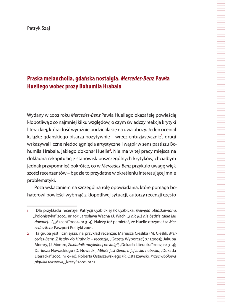Patryk Szaj Praska melancholia, gdańska nostalgia. Mercedes-Benz Pawła Huellego wobec prozy Bohumila Hrabala Wydany w 2002 roku Mercedes-Benz Pawła Huellego okazał się powieścią kłopotliwą z co najmniej kilku względów, o czym świadczy reakcja krytyki literackiej, która dość wyraźnie podzieliła się na dwa obozy. Jeden oceniał książkę gdańskiego pisarza pozytywnie – wręcz entuzjastycznie1, drugi wskazywał liczne niedociągnięcia artystyczne i wątpił w sens pastiszu Bohumila Hrabala, jakiego dokonał Huelle2. Nie ma w tej pracy miejsca na dokładną rekapitulację stanowisk poszczególnych krytyków, chciałbym jednak przypomnieć pokrótce, co w Mercedes-Benz przykuło uwagę większości recenzentów – będzie to przydatne w określeniu interesującej mnie problematyki. Poza wskazaniem na szczególną rolę opowiadania, które pomaga bohaterowi powieści wybrnąć z kłopotliwej sytuacji, autorzy recenzji często Dla przykładu recenzje: Patrycji Łyżbickiej (P. Łyżbicka, Gawęda obłaskawiona, „Polonistyka” 2002, nr 10); Jarosława Wacha (J. Wach, „I nic już nie będzie takie jak dawniej…”, „Akcent” 2004, nr 3–4). Należy też pamiętać, że Huelle otrzymał za Mercedes-Benz Paszport Polityki 2001. 2 Ta grupa jest liczniejsza, na przykład recenzje: Mariusza Cieślika (M. Cieślik, Mercedes-Benz. Z listów do Hrabala – recenzja, „Gazeta Wyborcza”, 7.11.2001); Jakuba Momry, (J. Momro, Zakładnik radykalnej nostalgii, „Dekada Literacka” 2002, nr 3–4); Dariusza Nowackiego (D. Nowacki, Miłość jest ślepa, a jej laska nebeska, „Dekada Literacka” 2002, nr 9–10); Roberta Ostaszewskiego (R. Ostaszewski, Przeciwbólowa pigułka tekstowa, „Kresy” 2002, nr 1). 1 110 | Patryk Szaj podnosili problem hołdu, jaki Huelle oddał Hrabalowi, nie tylko przez intertekstualne nawiązania do jego twórczości – szczególnie do opowiadania Wieczorna lekcja jazdy – lecz także przez naśladownictwo charakterystycznego stylu czeskiego pisarza. Okazuje się, że pastisz ten nie do końca się powiódł, wyczuwa się w nim fałszywą nutę, czego – dość przekornie, bo również naśladując tę stylistykę – nie omieszkał wytknąć Huellemu na przykład Robert Ostaszewski: „Mercedes… po dłuższych oględzinach okazuje się być «składakiem», w którym karoseria jest wprawdzie oryginalna i solidna, ale silnik nasz, polski, i do tego mocno zawodny”3, czy Mariusz Cieślik, nazywając książkę Huellego „pięknie wykonaną błyskotką”4. Z kolei Dariusz Nowacki akcentował niemalże aporetykę zabiegu imitacji Hrabala, wynikającą z powierzchowności paranteli nieprzekładających się na podobne doświadczenie egzystencjalne pisarzy polskich i czeskich5. Te głosy zastanawiają, wiadomo bowiem, że ambicją artystyczną Huellego nie od dziś jest prowadzenie dialogu z innymi twórcami6, w Mercedes-Benz jednak dialog ten ustępuje miejsca bezgranicznemu wręcz oddaniu. Podobnie ambiwalentny stosunek recenzenci mieli do humoru powieści, w zamyśle nawiązującego do Hrabalowskiej praskiej ironii. Według Łyżbickiej uratował on powieść przed nadmiarem nostalgicznego patosu7, co w moim przekonaniu nie odpowiada prawdzie. Nostalgii jest w książce Huellego bardzo dużo i to ona – choć być może usilnie przez bohatera wypierana – wysuwa się w toku lektury na pierwszy plan. Znamienny tytuł recenzji Jakuba Momry – Zakładnik radykalnej nostalgii8, oddaje meritum problemu, którym zamierzam się zająć. Chciałbym zatem zastanowić się, 3 4 5 6 7 8 R. Ostaszewski, Przeciwbólowa pigułka…, dz. cyt., s. 170. M. Cieślik, Mercedes-Benz…, dz. cyt., [online] http://wyborcza.pl/1,75517,527070.html [dostęp: 28.12.2011]. D. Nowacki, Miłość jest ślepa…, dz. cyt., s. 91. Por. wywiady z pisarzem: Prowadzę dialog z przeszłością, rozm. A. Siatecki, „Pro Libris” 2008, nr 2; A. Ubertowska, Literatura i miasto, „Przegląd Polityczny” 1997, nr 33–34, s. 107. P. Łyżbicka, Gawęda obłaskawiona, dz. cyt., s. 629. Recenzja Jakuba Momry wydaje się najwartościowsza ze wszystkich dotychczas przywołanych. Krytyk zwraca uwagę na bardzo ważne problemy Mercedes-Benz Praska melancholia, gdańska nostalgia… | 111 dlaczego Huelle, choć podobnie jak Hrabal stawia na kompensacyjną rolę opowiadania, nie osiąga zamierzonego celu. Inaczej rzecz ujmując, spróbuję odpowiedzieć na pytanie, czym różni się nostalgiczność Huellego od melancholijności Hrabala. Różnicę tę pobieżnie można zarysować w następujący sposób: choć pozornie melancholia i nostalgia wydają się uczuciami pokrewnymi, to bliższe spojrzenie na nie ujawnia, że podobieństwo pomiędzy nimi jest jedynie powierzchowne, zaś istotnie sytuują się one na odmiennych biegunach. Melancholia jest uczuciem rozpaczy albo też tęsknoty za czymś nieokreślonym. Można by nawet zaryzykować twierdzenie, że „obiekt” utraty-melancholii nigdy nie istniał: jest raczej zjawiskiem „metafizycznym” czy też „kosmicznym”, ujawniającym absurdalność świata. Dlatego melancholia powoduje swoiste rozproszenie podmiotu niepotrafiącego przepracować straty tak, jak dzieje się to w „zdrowym” procesie żałoby9. O ile jednak dla Freuda stanowi ona zjawisko patologiczne, o tyle nowsze opracowania akcentują raczej niezbywalność melancholii i niemożność wyjścia z niej. Melancholia nie tylko bowiem zubaża czy rozbija podmiot, ale także – może daleko bardziej – „dekonstruuje” porządek świata, sama okazując się zjawiskiem nierozstrzygalnym10. Jak twierdzi np. Marek Bieńczyk: Na długo przed Derridą melancholia opisała na swój niefilozoficzny sposób, że w jej świecie, który jest światem bez początku i bez końca, światem, w którym wszystko już było i wszystko zostało zapisane, i wszystko kręci się w kole powtórzenia […] nie ma imienia własnego. Jest tylko teatralne rozmnożenie masek,