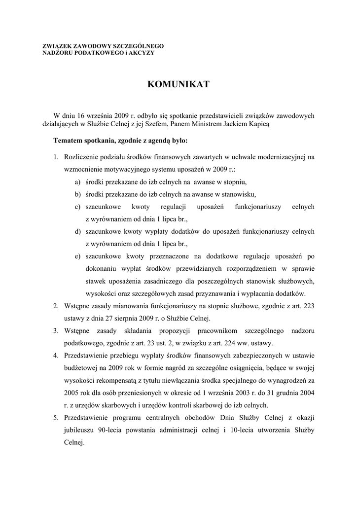 ZWIĄZEK ZAWODOWY SZCZEGÓLNEGO NADZORU PODATKOWEGO i AKCYZY KOMUNIKAT W dniu 16 września 2009 r. odbyło się spotkanie przedstawicieli związków zawodowych działających w Służbie Celnej z jej Szefem, Panem Ministrem Jackiem Kapicą Tematem spotkania, zgodnie z agendą było: 1. Rozliczenie podziału środków finansowych zawartych w uchwale modernizacyjnej na wzmocnienie motywacyjnego systemu uposażeń w 2009 r.: a) środki przekazane do izb celnych na awanse w stopniu, b) środki przekazane do izb celnych na awanse w stanowisku, c) szacunkowe kwoty regulacji uposażeń funkcjonariuszy celnych z wyrównaniem od dnia 1 lipca br., d) szacunkowe kwoty wypłaty dodatków do uposażeń funkcjonariuszy celnych z wyrównaniem od dnia 1 lipca br., e) szacunkowe kwoty przeznaczone na dodatkowe regulacje uposażeń po dokonaniu wypłat środków przewidzianych rozporządzeniem w sprawie stawek uposażenia zasadniczego dla poszczególnych stanowisk służbowych, wysokości oraz szczegółowych zasad przyznawania i wypłacania dodatków. 2. Wstępne zasady mianowania funkcjonariuszy na stopnie służbowe, zgodnie z art. 223 ustawy z dnia 27 sierpnia 2009 r. o Służbie Celnej. 3. Wstępne zasady składania propozycji pracownikom szczególnego nadzoru podatkowego, zgodnie z art. 23 ust. 2, w związku z art. 224 ww. ustawy. 4. Przedstawienie przebiegu wypłaty środków finansowych zabezpieczonych w ustawie budżetowej na 2009 rok w formie nagród za szczególne osiągnięcia, będące w swojej wysokości rekompensatą z tytułu niewłączania środka specjalnego do wynagrodzeń za 2005 rok dla osób przeniesionych w okresie od 1 września 2003 r. do 31 grudnia 2004 r. z urzędów skarbowych i urzędów kontroli skarbowej do izb celnych. 5. Przedstawienie programu centralnych obchodów Dnia Służby Celnej z okazji jubileuszu 90-lecia powstania administracji celnej i 10-lecia utworzenia Służby Celnej. Materiały, które otrzymaliśmy na spotkaniu (dot. pkt 2 i 3): Wstępne zasady mianowania funkcjonariuszy na stopnie służbowe zgodnie z art.223 ustawy. Kryteria punktowe mianowania na stopień służbowy w poszczególnych korpusach: 1. okres służby 1 – 5 lat – 1 pkt 6 – 10 lat – 2 pkt 11 – 15 lat – 3 pkt pow. 16 lat – 4 pkt 2. uprawnienie do prowadzenia szkoleń – 1 pkt za każde uprawnienie 3. wykształcenie - administracyjne, prawnicze, ekonomiczne - 1 pkt - studia podyplomowe związane z zakresem działania SC – 1 pkt 4. uczestnictwo w misjach zagranicznych lub zespołach organizowanych przez MF – 1 pkt za poszczególne udziały 5. zajmowane stanowisko – mkc, kc, stkc – 1 pkt inspektor celny, ekspert celny – 2 pkt stanowisko kierownicze – 3 pkt Ad. 1 W odpowiedzi na pytanie związkowców dlaczego środki finansowe nie zostały przewidziane dla członków korpusu służby cywilnej Minister odpowiedział, iż środki te w programie modernizacji zagwarantowano tylko dla funkcjonariuszy bowiem „cywile” w 2008 r. również otrzymali regulacje w takiej samej wysokości jak funkcjonariusze. Ponadto ze środka specjalnego służby cywilnej otrzymali dodatek specjalny. SSC zaproponował jednak, iż zaleci dyrektorom izb celnych, aby w ramach fluktuacji kadr, przewidzieli i przeznaczyli środki (pozostałe „po emerytach”) na awanse dla pracowników cywilnych i zaznaczył, że powyższe awanse mogą być przyznane nie tylko z okazji, np. Dnia Służby Celnej. Ad. 2 Wstępne zasady mianowania funkcjonariuszy na stopnie służbowe zgodnie z art. 223 ustawy – w wyniku rozmów zmieniono i dopisano! Kryteria punktowe mianowania na stopień służbowy w poszczególnych korpusach: 1. okres służby 1 – 5 lat – 1 pkt 6 – 10 lat – 2 pkt 11 – 15 lat – 3 pkt pow. 16 lat – 4 pkt 2. uprawnienie do prowadzenia szkoleń – 1 pkt za każde uprawnienie 3. wykształcenie: wyższe - 1 pkt wyższe specjalistyczne: administracyjne, prawnicze, ekonomiczne - 2 pkt 4. uczestnictwo w misjach zagranicznych lub zespołach organizowanych przez MF – 1 pkt za poszczególne udziały 5. zajmowane stanowisko – mkc, kc, stkc – 1 pkt inspektor celny, ekspert celny – 2 pkt stanowisko kierownicze – 3 pkt Ad. 3 Wstępne zasady składania propozycji pracownikom szczególnego nadzoru podatkowego 1. składanie propozycji zostanie poprzedzone spotkaniami pracowników z dyrektorami poszczególnych IC, w celu wyjaśnienia wszystkich wątpliwości, 2. deklaracje pracownikom szczególnego nadzoru podatkowego dotyczące zmiany korpusu powinny zostać złożone do 15 listopada 2009r. 3. propozycje składane będą na podstawie art. 99 ustawy, 4. w zakresie wszystkich elementów stosunku służbowego stosowane są przepisy nowej ustawy (np. zwiększony dodatek za długoletnią służbę), 5. propozycja dotycząca uposażenia zasadniczego wraz z dodatkami nie może być niższa niż otrzymywane dotychczas wynagrodzenie, 6. przy określaniu stopnia służbowego należy uwzględnić rodzaj wykonywanych zadań, 7. przy określaniu stopnia należy wziąć pod uwagę kryteria wskazane powyżej z uwzględnieniem specyfiki pracy, 8. okres stażu pracy w służbie cywilnej wlicza się do okresu służby w Służbie Celnej, w wyniku rozmów dopisano: 9. zajmowane dotychczasowe stanowisko Wymienione w pkt 2 wstępnych zasad, składanie przez pracowników sz.n.p. deklaracji do 15.11.2009 r. ma posłużyć zorientowaniu się w ilości osób i zabezpieczeniu odpowiednich środków finansowych i etatów na 2010 rok dla nowych funkcjonariuszy, którzy takie deklaracje złożą. Powyższe nie oznacza jednak, iż takie osoby automatycznie od 1 stycznia 2010 roku „założą” mundur. Zadania w sz.n.p., zgodnie z ustawą, mogą do dnia 30 czerwca 2010 wykonywać również pracownicy cywilni. Propozycje sposobu określenia i nadania stopnia służbowego dla cywili nie zostały przedstawione. Zasady składania propozycji pracownikom sz.n.p. zostaną ostatecznie opracowane po zasięgnięciu przez SSC o