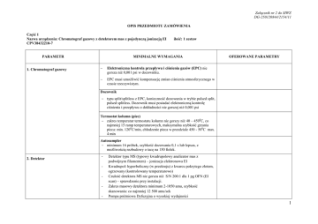 Załącznik nr 2 do SIWZ DG-250120844/2154/11 OPIS PRZEDMIOTU ZAMÓWIENIA Część 1 Nazwa urządzenia: Chromatograf gazowy z detektorem mas z pojedynczą jonizacją EI CPV38432210-7 PARAMETR 1. Chromatograf gazowy ilość: 1 zestaw MINIMALNE WYMAGANIA Elektroniczna kontrola przepływu i ciśnienia gazów (EPC) nie gorsza niż 0,001 psi w dozowniku. EPC musi umożliwić kompensację zmian ciśnienia atmosferycznego w czasie rzeczywistym. OFEROWANE PARAMETRY Dozownik typu split/splitless z EPC, konieczność dozowania w trybie pulsed split, pulsed splitless. Dozownik musi posiadać elektroniczną kontrolę ciśnienia i przepływu o dokładności nie gorszej niż 0,001 psi Termostat kolumn (piec) zakres temperatur termostatu kolumn nie gorszy niż 40 – 4500C, co najmniej 15 ramp temperaturowych, maksymalna szybkość grzania pieca: min. 1200C/min, chłodzenie pieca w przedziale 450 - 500C max. 4 min Autosampler minimum 16 próbek, szybkość dozowania 0,1 s lub lepsza, z możliwością rozbudowy o tacę na 150 fiolek. 2. Detektor - Detektor typu MS (typowy kwadrupolowy analizator mas z podwójnym filamentem) – jonizacja elektronowa EI Kwadrupol: hyperboliczny (w przekroju) z kwarcu pokrytego złotem, ogrzewany (kontrolowany temperaturowo) Czułość detektora MS nie gorsza niż S/N 200:1 dla 1 pg OFN (EI scan) – sprawdzenie przy instalacji. Zakres masowy detektora minimum 2-1050 amu, szybkość skanowania: co najmniej 12 500 amu/sek Pompa próżniowa Dyfuzyjna o wysokiej wydajności 1 3. Zestaw komputerowy z oprogramowaniem do akwizycji i obróbki danych 4. Zestaw startowy umożliwiający korzystanie z aparatu po jego uruchomieniu bez ponoszenia dodatkowych kosztów 5. Gwarancja i serwis - - Biblioteki widm: NIST 2008, min. 200000 widm - Konieczna współpraca GC MS z komputerem poprzez złącze Ethernet (LAN) dająca możliwość zdalnego dostępu do aparatu Zestaw startowy do zainstalowania aparatu i rozpoczęcia na nim pracy: strzykawki o poj. 10μL do autosamplera, zakręcane fiolki do autosamplera, membrany do dozownika, wkładki szklane do dozowników, ferrule, złączki, itp.), Kolumna HP-5MSUI 30 m x 0,25 mm x 0,25 μm lub odpowiednik Aparat instalowany przez autoryzowany serwis, który ma siedzibę w Polsce. Gwarancja na całe urządzenie, 12 miesięcy, przy czym czas przestoju powoduje przedłużenie okresu gwarancji Czas reakcji* serwisu gwarancyjnego nie dłuższy niż 3 dni robocze - - 6. Wymagania ogólne Możliwość rozbudowy o detektor emisji atomowej (AED) do analizy związków metaloorganicznych Zestaw posiadający procesor klasy x86 min dwurdzeniowy, dysk. 500GB, 2 GB RAM, 22’’ calowy monitor, Drukarka laserowa, Oprogramowanie do pełnego sterowania zestawem i obróbki danych, z systemem operacyjnym odpowiednim do zainstalowanego oprogramowania sterującego zestawem - Certyfikat zgodności CE świadczący o zgodności urządzenia z europejskimi warunkami bezpieczeństwa (dołączony do oferty) - Wykonawca ubiegający się o zamówienie jest ubezpieczony od odpowiedzialności cywilnej w zakresie prowadzonej działalności związanej z przedmiotem zamówienia na kwotę nie mniejszą niż 2 000 000 PLN - Instrukcja obsługi urządzenia, w języku polskim, dołączona do dostawy - Aparatura posiadająca wszelkie wymagane przez przepisy prawa świadectwa, certyfikaty, atesty, deklaracje zgodności, itp. oraz spełniająca wszelkie wymogi w zakresie norm bezpieczeństwa obsługi Minimum 1 dzień roboczy w siedzibie odbiorcy 7. Szkolenie *Przez „czas reakcji” należy rozumieć czas, w którym serwisant, po otrzymaniu zgłoszenia, stawi się w siedzibie końcowego użytkownika i przystąpi do niezwłocznego usunięcia usterek. 2 Część 2 Nazwa urządzenia: spektrometr absorpcji atomowej z przystawką do oznaczania wodorków CPV: 38433000-9 PARAMETR Spektrometr ilość: 1 zestaw MINIMALNE WYMAGANIA OFEROWANE PARAMETRY Automatyczny spektrometr absorpcji atomowej, przystosowany do analiz techniką płomieniową oraz w piecu grafitowym z możliwością podłączenia przystawki do generacji wodorków/zimnych par rtęci, całkowicie sterowany przez zewnętrzny komputer PC, Obie techniki atomizacji (płomień oraz piec grafitowy) dostępne w jednym aparacie (nie dopuszcza się możliwości zaoferowania dwóch odrębnych spektrometrów), Dwuwiązkowy układ optyczny (tzw, real-time double-beam), Monochromator z automatycznym wyborem długości fali, pracujący w zakresie nie mniejszym niż 190-900 nm, Siatka dyfrakcyjna zawierająca co najmniej 1800 linii/mm, optymalizowana dla 236 nm i 597 nm, Możliwość wyboru kilku szczelin w zakresie nie mniejszym niż od 0,2 nm do 2 nm, Szerokopasmowy detektor półprzewodnikowy z wbudowaną matrycą niskoszumową CMOS, Automatyczne ustawianie długości fali, szczeliny, prądu lampy oraz automatyczne ustawienie lampy względem drogi optycznej spektrometru, Minimum 8-pozycyjny zmieniacz lamp kodowanych zawierający 8 niezależnych zasilaczy, w tym co najmniej 2 zasilacze do lamp o podwyższonej wydajności świetlnej, Możliwość stosowania lamp o podwyższonej wydajności świetlnej, 3 Technika płomieniowa Piec grafitowy Przystawka do analiz techniką wodorków i zimnych par rtęci System sterowania Automatyczna optymalizacja ustawienia palnika względem drogi optycznej spektrometru, Korekcja tła wyładowczą lampą deuterową, Elektroniczna kontrola przepływów gazów, liczbowe wartości przepływów przechowywane wraz z metodą, Wszystkie parametry wpływające na bezpieczną pracę aparatu muszą być kontrolowane i zabezpieczone odpowiednimi czujnikami, Standardowy palnik do płomienia acetylen-powietrze wykonany z tytanu o długości szczeliny 100 mm, Opcjonalnie dostępne palniki tytanowe o długości szczeliny 50 mm: do płomienia acetylen-powietrze oraz do płomienia acetylen-podtlenek azotu, Komora mgielna oraz rozpylacz odporne na wszystkie rozpuszczalniki nieorganiczne i organiczne (włącznie z kwasem HF). Kuweta