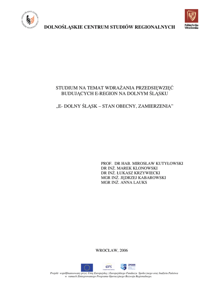 DOLNOŚLĄSKIE CENTRUM STUDIÓW REGIONALNYCH STUDIUM NA TEMAT WDRAŻANIA PRZEDSIĘWZIĘĆ BUDUJĄCYCH E-REGION NA DOLNYM ŚLĄSKU „E- DOLNY ŚLĄSK – STAN OBECNY, ZAMIERZENIA” PROF. DR HAB. MIROSŁAW KUTYŁOWSKI DR INŻ. MAREK KLONOWSKI DR INŻ. ŁUKASZ KRZYWIECKI MGR INŻ. JĘDRZEJ KABAROWSKI MGR INŻ. ANNA LAUKS WROCŁAW, 2006 Projekt współfinansowany przez Unię Europejską z Europejskiego Funduszu Społecznego oraz budżetu Państwa w ramach Zintegrowanego Programu Operacyjnego Rozwoju Regionalnego. SPIS TREŚCI • KONCEPCJA INTEROPERACYJNOŚCI PLATFORM ELEKTRONICZNYCH W RÓŻNYCH OBSZARACH AKTYWNOŚCI NA DOLNYM ŚLĄSKU (Mirosław Kutyłowski) • KONCEPCJA WYKORZYSTANIA TECHNIK TELEINFORMATYCZNYCH PRZEZ MIESZKAŃCÓW DOLNEGO ŚLĄSKA (Jędrzej Kabarowski, Mirosław Kutyłowski) • WYKORZYSTANIE TECHNIK TELEINFORMATYCZNYCH DLA ZWIĘKSZENIA EFEKTYWNOŚCI SŁUŻBY ZDROWIA NA DOLNYM ŚLĄSKU (Marek Klonowski) • KONCEPCJA ROZWOJU E-ADMINISTRACJI SAMORZĄDOWEJ (Anna Lauks) • KONCEPCJA PLATFORM TELEINFORMATYCZNYCH GOSPODARCZYM DOLNEGO ŚLĄSKA (Łukasz Krzywiecki) • KONCEPCJA OBROTU ELEKTRONICZNEGO W KONTAKTACH Z GRANICZĄCYMI REGIONAMI NIEMIEC (Mirosław Kutyłowski) W OBROCIE Elektronizacja obiegu informacji jest niezbędnym warunkiem zwiększenia efektywności działania współczesnego społeczeństwa. Informatyzacja jako sama w sobie nie powinna być celem działania, głównym wyznacznikiem powstania „e-regionu” jest stopień usprawnienia działania w wyniku zastosowania technik informatycznych. Obecny stan elektronizacji należy określić jako nadzwyczaj niski, w wyjątkowych jedynie sytuacjach mamy do czynienia z usprawnieniami za pomocą technik informatycznych. Docelowy poziom elektronizacji należy określić jako taki, w którym przenoszenie na drogę elektroniczną nie przynosi dalszych pozytywnych efektów. Jako zadowalający można by uznać taki stan, w którym: 1.respektowana byłaby zasada jednolitego miejsca przechowywania określonych danych, 2.wyeliminowane zostałoby zjawisko dublowania danych oraz przenoszenia danych między systemami publicznymi za pomocą obywateli, 3.obrót informacjami odbywałby się w przeważającej mierze na drodze elektronicznej, bez osobistego przenoszenia dokumentów. Możliwości rozwoju oparte na technologiach informatycznych na Dolnym Śląsku związane są z następującymi głównymi czynnikami: nieznaczny stopień zaawansowania prac tego typu stwarza pole projektowania takich rozwiązań, które nie muszą brać pod uwagę istniejących i sprawnie funkcjonujących systemów, znaczne skoncentrowanie, jak na warunki polskie, przemysłu informatycznego i obecność wysoko wykwalifikowanych kadr informatycznych stwarzają możliwości realizacji, otwartość władz lokalnych na nowoczesne technologie. Z kolei poważnymi hamulcami dla tego typu przedsięwzięć są: brak efektywnej i jasnej polityki Państwa w zakresie informatyzacji, obecność ułomnych uregulowań prawnych wprowadzonych w ostatnich latach a mających regulować sferę e-państwa. Obecnie Państwo nie jest motorem działań informatyzacyjnych. Z uwagi na to, iż skuteczność informatyzacji wymaga określonej skali niezbędne jest podjęcie takich działań, które umożliwiłyby włączenie się w proces (w fazie przedkonkurencyjnej) zarówno samorządom, podmiotom gospodarczym jak i organom państwowym. Preferowanym modelem działania jest rozproszone tworzenie systemów i koncepcji z zachowaniem następujących warunków: architektura warstwowa, neutralność technologiczna (dotycząca również sfery procedur, algorytmów, standardów), bezpieczeństwo ekonomiczne i prawne (np. w zakresie praw licencyjnych). Kluczowymi zagadnieniami pojawiającymi się w zasadzie każdym omawianym obszarze zastosowań jest uregulowanie kwestii koncepcji dokumentu elektronicznego. Rozwiązania wymagają następujące zagadnienia szczegółowe: sposób uwierzytelniania dokumentów (wystawca, moment czasu), tryb archiwizacji, niezaprzeczalne doręczanie dokumentu, „mobilność dokumentu” - konwersja pomiędzy różnymi systemami – ze względu na zawartość danych, format jak i charakterystykę nośnika. Dokument elektroniczny rozumiemy tu w zasięgu szerszym niż dla „papierowego” odpowiednika z doktryny prawnej. Chodzi nam również na przykład o dokumenty elektroniczne mające charakter „tokenów” umożliwiających wykonywanie określonych czynności. W przypadku „papierowym” bralibyśmy tu pod uwagę na przykład banknoty, bilety, legitymacje... Z punktu widzenia efektywności działania celowe jest podjęcie takich projektów, które rozwiązują określone, bardzo silne, zapotrzebowanie praktyczne, dostarczają rozwiązań mogących mieć zastosowanie ogólniejsze poprzez wypracowanie mechanizmów stanowiących podstawę techniczną dla innych obszarów zastosowań, nie wchodzą w kolizję z obecnie obowiązującymi polskimi przepisami, zaś odpowiadają zarówno prawu europejskiego jak i tendencjom w gospodarce UE. Istnieje kilka obszarów zastosowań, które mogłyby spełnić powyższe wymagania, oraz realizacja których może się oprzeć o istniejące w regionie zespoły o niezbędnym przygotowaniu merytorycznym: 1. budowa powszechnych systemów elektronicznego obrotu towarami i usługami, z wiarygodnym systemem rekomendacji, ułatwieniami dotyczącymi egzekwowania wierzytelności i obowiązków, 2. budowa systemu identyfikacji elektronicznej i uwierzytelniania dokumentów oraz ich obiegu będącego rozwinięciem systemu austriackiego, rozwiązanie zintegrowane w Karcie Mieszkańca z różnymi poziomami funkcjonalności, 3. drukowalne dokumenty elektroniczne na potrzeby m.in. biletów, upoważnień, zaświadczeń, 4. system informacyjny dla obywateli o procedurach administracyjnych w administracji samorządowej zbudowany przy pomocy metodologii analizy biznesowej, 5. stworzenie podstaw systemowych dla obrotu dokumentem elektronicznym 