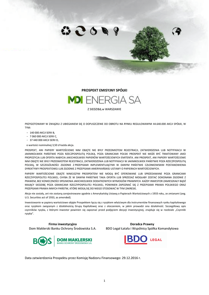 Prospekt emisyjny MDI Energia S.A. PROSPEKT EMISYJNY SPÓŁKI MDI ENERGIA SA Z SIEDZIBĄ w WARSZAWIE PRZYGOTOWANY W ZWIĄZKU Z UBIEGANIEM SIĘ O DOPUSZCZENIE DO OBROTU NA RYNKU REGULOWANYM 44.640.000 AKCJI SPÓŁKI, W TYM: - 140 000 AKCJI SERII B, - 7 060 000 AKCJI SERII C, - 37 440 000 AKCJI SERII D, o wartości nominalnej 3,50 zł każda akcja. PROSPEKT, ANI PAPIERY WARTOŚCIOWE NIM OBJĘTE NIE BYŁY PRZEDMIOTEM REJESTRACJI, ZATWIERDZENIA LUB NOTYFIKACJI W JAKIMKOLWIEK PAŃSTWIE POZA RZECZPOSPOLITĄ POLSKĄ. POZA GRANICAMI POLSKI PROSPEKT NIE MOŻE BYĆ TRAKTOWANY JAKO PROPOZYCJA LUB OFERTA NABYCIA JAKICHKOLWIEK PAPIERÓW WARTOŚCIOWYCH EMITENTA. ANI PROSPEKT, ANI PAPIERY WARTOŚCIOWE NIM OBJĘTE NIE BYŁY PRZEDMIOTEM REJESTRACJI, ZATWIERDZENIA LUB NOTYFIKACJI W JAKIMKOLWIEK PAŃSTWIE POZA RZECZPOSPOLITĄ POLSKĄ, W SZCZEGÓLNOŚCI ZGODNIE Z PRZEPISAMI IMPLEMENTUJĄCYMI W DANYM PAŃSTWIE CZŁONKOWSKIM POSTANOWIENIA DYREKTYWY PROSPEKTOWEJ LUB ZGODNIE Z PRZEPISAMI AMERYKAŃSKIEJ USTAWY O PAPIERACH WARTOŚCIOWYCH. PAPIERY WARTOŚCIOWE OBJĘTE NINIEJSZYM PROSPEKTEM NIE MOGĄ BYĆ OFEROWANE LUB SPRZEDAWANE POZA GRANICAMI RZECZYPOSPOLITEJ POLSKIEJ, CHYBA ŻE W DANYM PAŃSTWIE TAKA OFERTA LUB SPRZEDAŻ MOGŁABY ZOSTAĆ DOKONANA ZGODNIE Z PRAWEM, BEZ KONIECZNOŚCI SPEŁNIENIA JAKICHKOLWIEK DODATKOWYCH WYMOGÓW PRAWNYCH. KAŻDY INWESTOR ZAMIESZKAŁY BĄDŹ MAJĄCY SIEDZIBĘ POZA GRANICAMI RZECZYPOSPOLITEJ POLSKIEJ, POWINIEN ZAPOZNAĆ SIĘ Z PRZEPISAMI PRAWA POLSKIEGO ORAZ PRZEPISAMI PRAWA INNYCH PAŃSTW, KTÓRE MOGĄ SIĘ DO NIEGO STOSOWAĆ W TYM ZAKRESIE. Akcje nie zostały, ani nie zostaną zarejestrowane zgodnie z Amerykańską Ustawą o Papierach Wartościowych z 1933 roku, ze zmianami (ang. U.S. Securities act of 1933, as amended). Inwestowanie w papiery wartościowe objęte Prospektem łączy się z ryzykiem właściwym dla instrumentów finansowych rynku kapitałowego oraz ryzykiem związanym z działalnością Grupy Kapitałowej oraz z otoczeniem, w jakim prowadzi ona działalność. Szczegółowy opis czynników ryzyka, z którymi inwestor powinien się zapoznać przed podjęciem decyzji inwestycyjnej, znajduje się w rozdziale „Czynniki ryzyka”. Firma inwestycyjna Dom Maklerski Banku Ochrony Środowiska S.A. Doradca Prawny BDO Legal Łatała i Wspólnicy Spółka Komandytowa Data zatwierdzenia Prospektu przez Komisję Nadzoru Finansowego: 29.12.2016 r. 1 Prospekt emisyjny MDI Energia S.A. ZASTRZEŻNIE Prospekt został sporządzony zgodnie z przepisami prawa, w tym zgodnie z: Rozporządzeniem Komisji WE nr 809/2004 z dnia 29 kwietnia 2004 r. wdrażającym Dyrektywę 2003/71/WE Parlamentu Europejskiego i Rady w sprawie informacji zawartych w prospektach emisyjnych oraz formy, włączenia przez odniesienie i publikacji takich prospektów emisyjnych oraz rozpowszechniania reklam, w oparciu o następujące załączniki: - Podsumowanie (załącznik XXII) - Dokument Rejestracyjny (załącznik XXV) - Dokument Ofertowy (załącznik III) Dyrektywą 2003/71/WE Parlamentu Europejskiego i Rady z dnia 4 listopada 2003 r. w sprawie prospektu emisyjnego publikowanego w związku z publiczną ofertą lub dopuszczeniem do obrotu papierów wartościowych i zmieniającej dyrektywę 2001/34/WE, przepisami regulującymi rynek kapitałowy w Polsce, w szczególności Ustawą o Ofercie Publicznej. Niniejszy Prospekt został sporządzony zgodnie z najlepszą wiedzą i przy dołożeniu należytej staranności, a zawarte w nim informacje są zgodne ze stanem na dzień jego zatwierdzenia. Możliwe jest, że od chwili udostępnienia Prospektu do publicznej wiadomości zajdą zmiany dotyczące sytuacji Spółki, dlatego też informacje zawarte w niniejszym dokumencie powinny być traktowane jako aktualne na Dzień Zatwierdzenia Prospektu. Informacje o istotnych błędach w treści Prospektu oraz znaczących czynnikach, mogących wpłynąć na ocenę papieru wartościowego, zaistniałych po zatwierdzeniu Prospektu Emisyjnego lub o których pozyskano informację po zatwierdzeniu Prospektu, udostępniane będą do publicznej wiadomości w formie aneksów do Prospektu Emisyjnego. W przypadku wystąpienia okoliczności dotyczących dopuszczenia Akcji serii B, C, D do obrotu na GPW, które nie uzasadniają sporządzenia aneksu do Prospektu, ale powodują zmianę treści Prospektu, Spółka będzie mogła udostępnić informację o wystąpieniu powyższych okoliczności w formie komunikatu aktualizującego do Prospektu w trybie art. 52 Ustawy o Ofercie Publicznej. Udostępnienie komunikatu aktualizującego następuje w sposób, w jaki został udostępniony Prospekt, przy czym taki komunikat powinien zostać jednocześnie przekazany do KNF. Pozycja konkurencyjna Spółki oszacowana została wedle najlepszej wiedzy Zarządu. Przy szacunkach uwzględniono publicznie dostępne informacje oraz wewnętrzne analizy. W przypadkach, gdzie było to możliwe i uzasadnione, oparto się o dane podmiotów zewnętrznych. Pewne wielkości przedstawione w danych finansowych zostały zaokrąglone. Stąd poszczególne sumy w tabelach mogą nie być sumami arytmetycznymi w wyniku tych zaokrągleń. Dotyczy to również wielkości procentowych. Akcje Oferowane nie zostały ani nie zostaną zarejestrowane zgodnie z amerykańską ustawą o papierach wartościowych – U.S. Securities Act z 1933 r., z późn. zm. („Amerykańska Ustawa o Papierach Wartościowych”), ani w żadnej innej komisji papierów wartościowych jakiegokolwiek stanu lub obszaru podlegającego jurysdykcji Stanów Zjednoczonych Ameryki Północnej i, z zastrzeżeniem pewnych wyjątków, nie mogą być oferowane ani sprzedawane na terytorium Stanów Zjednoczonych Ameryki Północnej, ani na rzecz, rachunek lub korzyść podmiotów amerykańskich (w rozumieniu Regulacji S zawartej w Amerykańskiej Ustawie o Papierach Wartościowych „Regulacja S”), chyba że są oferowane lub sprzedawane w ramach pewnych transakcji zwolnionych z obowiązku dokonania rejestracji przewid