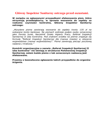 Główny Inspektor Sanitarny ostrzega przed oszustami. W związku ze zgłaszanymi przypadkami sfałszowania pism, które otrzymują przedsiębiorcy, w sprawie wezwania do zapłaty za rzekome czynności kontrolne, Główny Inspektor Sanitarny ostrzega: „Wysyłane pisma zawierają wezwanie do zapłaty kwoty 135 zł na wskazane konto bankowe. Na pismach widnieje podpis osoby oznaczonej jako Dorota Jurek, Naczelnik Działu Higieny Pracy, Referat Inspekcji Sanitarnej II izba kontrolna. Pod znakiem orzełka na piśmie znajduje się formuła "Referat Inspekcji Sanitarnej dla (nazwa miasta) w obszarze województwa (nazwa województwa)". Pisma zawierają pieczęć pocztową nadania z Krakowa.” Komórki organizacyjne o nazwie „Referat Inspekcji Sanitarnej II izba kontrolna” nie istnieją w strukturze Państwowej Inspekcji Sanitarnej, zatem każde pismo z tak oznaczonym nadawcą jest sfałszowane. Prosimy o bezzwłoczne zgłaszanie takich przypadków do organów ścigania.