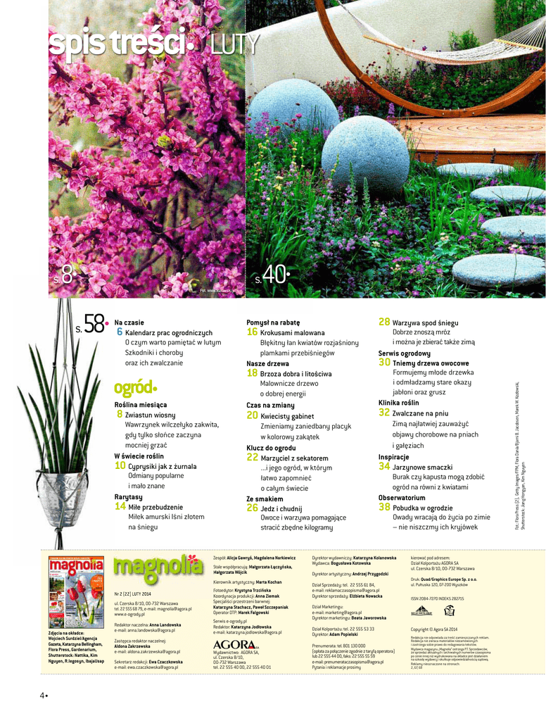 spis treści. LUTY s. 58. 6 Fot. www.kurowski.pl Na czasie Kalendarz prac ogrodniczych O czym warto pamiętać w lutym Szkodniki i choroby oraz ich zwalczanie ogród. Roślina miesiąca 8 Zwiastun wiosny Wawrzynek wilczełyko zakwita, gdy tylko słońce zaczyna mocniej grzać W świecie roślin 10 Cyprysiki jak z żurnala Odmiany popularne i mało znane Rarytasy 14 Miłe przebudzenie Miłek amurski lśni złotem na śniegu W ŚRODKU DODATEK SPECJALNY ZIOŁA Z PARAPETU +21 Kierownik artystyczny: Mar ta Kochan PRZEPISÓW KULINARNYCH Co można zrobić z betonu PORA CIĄĆ DRZEWA OWOCOWE WARZYWA ZBIERANE ZIMĄ OSŁANIAMY BALKON ZIELENIĄ OBUDŹ kwiaty cebulowe! Zdjęcia na okładce: Wojciech Surdziel/Agencja Gazeta, Katarzyna Bellingham, Flora Press, Gardenarium, Shutterstock: Nattika, Kim Nguyen, R.Iegosyn, IbajaUsap 4 . ul. Czerska 8/10, 00-732 Warszawa tel. 22 555 68 79, e-mail: [email protected] www.e-ogrody.pl Fotoedytor: Krystyna Trzcińska Koordynacja produkcji: Anna Ziemak Specjaliści przestrzeni barwnej: Katarzyna Stachacz, Paweł Szczepaniak Operator DTP: Marek Falgowski Redaktor naczelna: Anna Landowska e-mail: [email protected] Serwis e-ogrody.pl Redaktor: Katarzyna Jodłowska e-mail: [email protected] Nr 2 (22) LUTY 2014 Gdzie zimują owady? Jedz i chudnij ze smakiem Błękitny łan kwiatów rozjaśniony plamkami przebiśniegów Nasze drzewa 18 Brzoza dobra i litościwa Malownicze drzewo o dobrej energii Czas na zmiany 20 Kwiecisty gabinet Zmieniamy zaniedbany placyk w kolorowy zakątek Klucz do ogrodu 22 Marzyciel z sekatorem ...i jego ogród, w którym łatwo zapomnieć o całym świecie Ze smakiem 26 Jedz i chudnij Owoce i warzywa pomagające stracić zbędne kilogramy Stale współpracują: Małgorzata Łączyńska, Małgorzata Wójcik cena 4,99 zł (w tym 8% VAT) W ogrodzie jak na wakacjach Pomysł na rabatę 16 Krokusami malowana Zespół: Alicja Gawryś, Magdalena Narkiewicz PORADNIK DLA MIŁOŚNIKÓW ROŚLIN I OGRODÓW NR 2(22) LUTY 2014 40. s. Zastępca redaktor naczelnej: Aldona Zakrzewska e-mail: [email protected] Sekretarz redakcji: Ewa Czaczkowska e-mail: [email protected] Wydawnictwo: AGORA SA, ul. Czerska 8/10, 00-732 Warszawa tel. 22 555 40 00, 22 555 40 01 28 Warzywa spod śniegu Dobrze znoszą mróz i można je zbierać także zimą Serwis ogrodowy 30 Tniemy drzewa owocowe Formujemy młode drzewka i odmładzamy stare okazy jabłoni oraz grusz Klinika roślin 32 Zwalczane na pniu Zimą najłatwiej zauważyć objawy chorobowe na pniach i gałęziach Inspiracje 34 Jarzynowe smaczki Burak czy kapusta mogą zdobić ogród na równi z kwiatami Obserwatorium 38 Pobudka w ogrodzie Owady wracają do życia po zimie – nie niszczmy ich kryjówek Dyrektor wydawniczy: Katarzyna Kolanowska Wydawca: Bogusława Kotowska kierować pod adresem: Dział Kolportażu AGORA SA ul. Czerska 8/10, 00-732 Warszawa Dyrektor artystyczny: Andrzej Przygodzki Dział Sprzedaży: tel. 22 555 61 84, e-mail: [email protected] Dyrektor sprzedaży: Elżbieta Nowacka Druk: Quad/Graphics Europe Sp. z o.o. ul. Pułtuska 120, 07-200 Wyszków ISSN 2084-7270 INDEKS 282715 Dział Marketingu: e-mail: [email protected] Dyrektor marketingu: Beata Jaworowska Dział Kolportażu: tel. 22 555 53 33 Dyrektor: Adam Popielski Prenumerata: tel. 801 130 000 (opłata za połączenie zgodnie z taryfą operatora) lub 22 555 44 00, faks: 22 555 55 59 e-mail: [email protected] Pytania i reklamacje prosimy Copyright © Agora SA 2014 Redakcja nie odpowiada za treść zamieszczanych reklam. Redakcja nie zwraca materiałów niezamówionych i zastrzega sobie prawo do redagowania tekstów. Wydawca magazynu „Magnolia” ostrzega P.T. Sprzedawców, że sprzedaż aktualnych i archiwalnych numerów czasopisma po cenie innej niż wydrukowana na okładce jest działaniem na szkodę wydawcy i skutkuje odpowiedzialnością sądową. Reklamy nieoznaczone na stronach: 2, 67, 68 Fot.: Flora Press (2), Getty Images/FPM, Flora Dania/Bjarni B. Jacobsen, Marek W. Kozłowski, Shutterstock: Jiang Hongyan, Kim Nguyen 8. s. s. 54. To jest modne 40 Przyjazny beton Tani i efektowny materiał na ogrodowe budowle i ozdobne detale Eksperci radzą 44 Zielone pogotowie Krople na storczyku Pora na nawożenie Jak przechowywać owoce Ratujemy fatsjobluszcz Nielegalne odprowadzanie ścieków Kora do ściółkowania Przemarzanie barwinka Fikus w kąpieli balkon itaras. Na medal 48 Z widokiem na zieleń Jak stworzyć kameralną atmosferę na balkonie s. dom. Zrób to sam 52 Dwa sposoby na żarówkę Wazonik i szklany ogródek – krok po kroku Parapetówka 54 Wiosna w doniczce Kompozycje z pędzonych kwiatów cebulowych Serwis kwiatowy 56 Pora na wysiewy Przygotowujemy rozsadę warzyw i kwiatów Parapetówka 58 Żelazna dama Sansewieria – sukulent o niewielkich wymaganiach Rarytasy 60 Palma z orzechami Kariota – roślina o oryginalnych liściach i efektownych owocach 18. Rozrywka 61 Krzyżówka z nagrodami oraz fotozagadki Wasze sukcesy 62 Pochwalcie się swoim ogrodem, balkonem, rośliną! Co w trawie piszczy 64 Warto zobaczyć Ogród Botaniczny w Krakowie Ciekawostki, nowości rynkowe Kalendarium imprez 66 Za miesiąc w „Magnolii” s. s. 26. 38. Zaplanuj z nami ogród i taras w nowym sezonie. Zainspiruj się propozycjami naszych architektów. Mnóstwo ciekawych pomysłów i aranżacji znajdziesz w dziale Projektowanie. 5 .