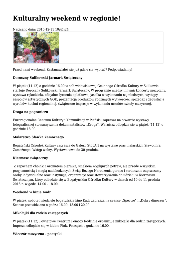 Kulturalny weekend w regionie! Napisano dnia: 2015-12-11 10:41:24 Przed nami weekend. Zastanawiałeś się już gdzie się wybrać? Podpowiadamy! Doroczny Sulikowski Jarmark Świąteczny W piątek (11.12) o godzinie 16.00 w sali widowiskowej Gminnego Ośrodka Kultury w Sulikowie startuje Doroczny Sulikowski Jarmark Świąteczny. W programie między innymi: koncerty muzyczny, wystawa rękodzieła, oficjalne życzenia opłatkowe, jasełka w wykonaniu najmłodszych, występy zespołów artystycznych GOK, prezentacja produktów rodzimych wytwórców, sprzedaż i degustacja wyrobów kuchni regionalnej, świąteczne impresje w wykonaniu uczniów szkoły muzycznej. Droga na pograniczu Euroregionalne Centrum Kultury i Komunikacji w Pieńsku zaprasza na otwarcie wystawy fotograficznej stowarzyszenia dokumentalistów „Droga”. Wernisaż odbędzie się w piątek (11.12) o godzinie 18.00. Malarstwo Sławka Zamożnego Bogatyński Ośrodek Kultury zaprasza do Galerii StopArt na wystawę prac malarskich Sławomira Zamożnego. Wstęp wolny. Wystawa trwa do 30 grudnia. Kiermasz świąteczny Z zapachem choinki i aromatem piernika, smakiem wigilijnych potraw, ale przede wszystkim przyjemnością i magią nadchodzących Świąt Bożego Narodzenia gorąco i serdecznie zapraszamy osoby indywidualne oraz instytucje, organizacje oraz stowarzyszenia do udziału w Kiermaszu Świątecznym, który odbędzie się w Bogatyńskim Ośrodku Kultury w dniach od 10 do 11 grudnia 2015 r. w godz. 14.00 - 18.00. Weekend w kinie Kadr W piątek, sobotę i niedzielę bogatyńskie kino Kadr zaprasza na seanse „Spectre” i „Dobry dinozaur”. Seanse przewidziano o godz.: 16.00, 18.00 i 20.00. Mikołajki dla rodzin zastępczych W piątek (11.12) Powiatowe Centrum Pomocy Rodzinie organizuje mikołajki dla rodzin zastępczych. Impreza odbędzie się w klubie Pink. Początek o godzinie 16.00. Wieczór muzyczno - poetycki W sobotę (12.12) o godzinie 17.00 Europejskie Centrum Edukacyjno – Kulturalne Meetingpoint Music Messiaen zaprasza na wieczór muzyczno – poetycki. Oprócz polsko-niemieckiego przeglądu piosenki i poezji, podczas którego uczniowie zaprezentują własne interpretacje znanych utworów, odbędzie się również podsumowanie wydarzeń roku 2015. Wyniki swojej pracy przedstawią między innymi uczestnicy Warsztatów Historycznych, warsztatów muzycznych „Lab Summer Class”, czy polsko-niemieckiego workcamp’u „Ceglane tabliczki”. Wieczór uzupełni występ młodego polskiego duetu Agnieszki Weryszko (wokal) oraz Adama Ostapiuka (gitara). Wstęp wolny! Gości oraz uczestników zachęcamy do skorzystania z bezpłatnego autobusu – odjazd ze Stacji Orlen (ul. Warszawska 30A, Zgorzelec) o godz. 16:30. Powrót około godz. 19:15. Mandoliny zagrają ze Stanisławem Soyką W sobotę (12.12) o godzinie 18.00 w Centrum Sportowo – Rekreacyjnym przy ul. Maratońskiej w Zgorzelcu odbędzie się niezwykły koncert Zgorzeleckiej Orkiestry Mandolinistów pt. „Melodie pod choinkę”. Z orkiestrą zagra i zaśpiewa Stanisław Soyka. W programie znajdą się nie tylko polskie i światowe przedświąteczne evergreeny, ale także kilka utworów Stanisława Soyki, specjalnie zaaranżowanych na mandolinową orkiestrę. Bilety są dostępne w cenie 20 zł. Organek w Bogatyni Jeden z najważniejszych i najciekawszych polskich artystów zagra w Bogatyni. Tomasz Organek wraz z zespołem 12 grudnia wystąpi w klubie Hoker w Bogatyni. Start o godz. 19.00. Bilety po 40 zł.