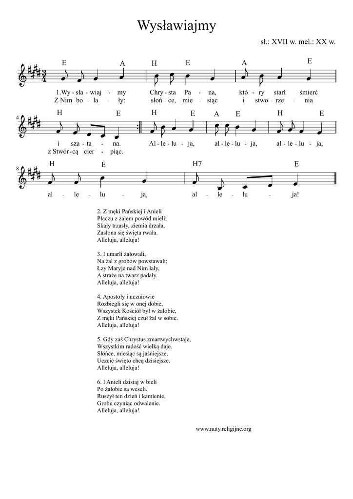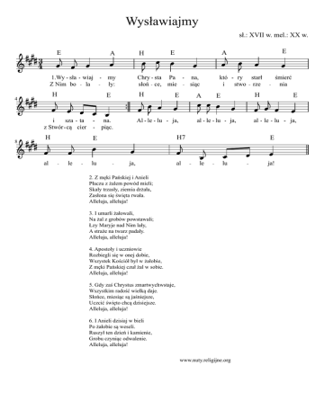 Wysławiajmy sł.: XVII w. mel.: XX w. 43 E A 1.Wy sła wiaj Z Nim bo la 4 H E i sza ta z Stwór cą cier 8 H al my ły: H E Chry sta Pa słoń ce, mie H na. piąc. Al le lu le lu na, siąc E A ja, E któ ry starł i stwo rze ja, al śmierć nia H E al le lu H7 E A ja, E al le lu E le lu 2. Z męki Pańskiej i Anieli Płaczu z żalem powód mieli; Skały trzasły, ziemia drżała, Zasłona się święta rwała. Alleluja, alleluja! 3. I umarli żałowali, Na żal z grobów powstawali; Łzy Maryje nad Nim lały, A straże na twarz padały. Alleluja, alleluja! 4. Apostoły i uczniowie Rozbiegli się w onej dobie, Wszystek Kościół był w żałobie, Z męki Pańskiej czuł żal w sobie. Alleluja, alleluja! 5. Gdy zaś Chrystus zmartwychwstaje, Wszystkim radość wielką daje. Słońce, miesiąc są jaśniejsze, Uczcić święto chcą dzisiejsze. Alleluja, alleluja! 6. I Anieli dzisiaj w bieli Po żałobie są weseli. Ruszył ten dzień i kamienie, Grobu czyniąc odwalenie. Alleluja, alleluja! www.nuty.religijne.org ja! ja,