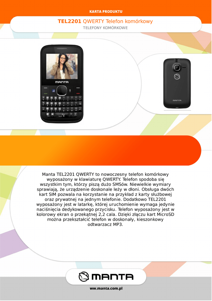 TEL2201QWERTYTelefonkomórkowy TELEFONYKOMÓRKOWE MantaTEL2201QWERTYtonowoczesnytelefonkomórkowy wyposażonywklawiaturęQWERTY.Telefonspodobasię wszystkimtym,którzypisządużoSMSów.Niewielkiewymiary sprawiają,żeurządzeniedoskonaleleżywdłoni.Obsługadwóch kartSIMpozwalanakorzystanienaprzykładzkartysłużbowej orazprywatnejnajednymtelefonie.DodatkowoTEL2201 wyposażonyjestwlatarkę,którejuruchomieniewymagajedynie naciśnięciadedykowanegoprzycisku.Telefonwyposażonyjestw kolorowyekranoprzekątnej2,2cala.DziękizłączukartMicroSD możnaprzekształcićtelefonwdoskonały,kieszonkowy odtwarzaczMP3. TEL2201QWERTYTelefonkomórkowy TELEFONYKOMÓRKOWE Specyfikacja Przekątnaekranu 2,2" Rozdzielczość 220x176 Wymiary(SxWxG) 112x61x13mm Waga 82g Dual-SIM Tak Bluetooth Tak Aparat Tak Gniazdokartpamięci MicroSD Pojemnośćakumulatora 800mAh ObsługiwanepasmaGSM 900/1800MHz RadioFM Tak Czaspracy(standby) 240h Czaspracy(rozmowa) 4h Dodatkowefunkcje klawiaturaQWERTY,latarka OdtwarzanieMP3 TAK Obsługamultimediów TAK http://www.manta.com.pl/pl/tel2201 EAN:5907377864851