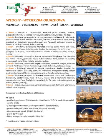 ITALIATOUR Biuro Podróży sp. z o.o. www.italiatour.travel Kraków, 31-144 Warszawa, 00-669 Gdańsk, 80-835 ul. Asnyka 10/1 ul. Emilii Plater 10/54 ul. Szeroka 64/66 lok.1 tel./fax: +48 12 633 06 63 tel./fax: +48 22 551 99 51 tel.: +48 791 140 793 [email protected] [email protected] [email protected] WŁOCHY - WYCIECZKA OBJAZDOWA WENECJA – FLORENCJA – RZYM – ASYŻ - SIENA - WERONA 1 dzień – wyjazd z Warszawy*. Przejazd przez Czechy, Austrie, przyjazd do hotelu w okolice Tarvisio, zakwaterowanie, kolacja, nocleg. 2 dzień – śniadanie, przepłyniecie promem do centrum Wenecji, zwiedzanie miasta: Ponte Rialto, Piazza San Marco, Basilica di San Marco, czas wolny, przejazd w godzinach popołudniowych do Florencji, zakwaterowanie w hotelu w okolicy Florencji, kolacja, nocleg. 3 dzień – śniadanie, zwiedzanie Florencji, Basilica Santa Maria del Fiore, Baptysterium, Piazza della Signoria, Basilica Santa Croce, Ponte Vecchio , przejazd do Rzymu, zakwaterowanie w hotelu w okolicy Rzymu, kolacja, nocleg 4 dzień – śniadanie, przejazd do Rzymu, zwiedzanie Watykanu; Plac i Bazylika św. Piotra i Pawła, grób Jana Pawła II, Kościoła św. Jana, Zamek św. Anioła( z zewnątrz), powrót do hotelu, kolacja, nocleg. 5 dzień – śniadanie, zwiedzanie Rzymu: Colosseo, Piazza di Spagna, Fontana di Trevi, Pantheon, Forum Romanum, powrót do hotelu, kolacja, nocleg. 6 dzień – śniadanie, wyjazd do Asyżu, zwiedzanie Asyżu- Bazyliki św. Franciszka, Kościół Św. Klary, domu św. Franciszka. Przejazd do Sieny, spacer po średniowiecznej Sienie, zakwaterowanie w hotelu, kolacja, nocleg. 7 dzień – śniadanie, przejazd do Werony, zwiedzanie Domu Julli ze słynnym balkonem, Castelvechio, Arco di Gavi, Piazza Bra z rzymskim teatrem, srednowieczny Pałac Scaligierich, przejazd do Tarvisio, zakwaterowanie w hotelu, kolacja, nocleg. 8 dzień – śniadanie, wykwaterowanie z hotelu, powrót do Polski - Warszawy, zakończenie imprezy. Cena oraz termin do ustalenia z Klientem. W cenie: - przejazd autokarem (klimatyzacja, video, barek, WC) na trasie jak powyżej - opieka pilota - 7 noclegów w hotelach 3*z HB (śniadanie i obiadokolacja) - przewodnik po Rzymie, Watykanie, Florencji, Wenecji - ubezpieczenie travel (NNW, KL, Bagaż) - prom do Wenecji - bilety wstępu do zwiedzanych obiektów * możliwość wyjazdu z innych miast. NIP: PL583-287-63-43 REGON 193092274 Bank PEKAO S.A. : 96 1240 1037 1111 0010 4253 5361; PKO BP : 33 1440 1345 0000 0000 0360 3474; Unicredit via Giulio Cesare 90 Roma Zaświadczenie 204 Woj. Pom. OC Gwarancja Ubezpieczeniowa AXA nr 02.408.926 Bank PEKAO S.A. (EUR): PL 93 1240 1037 1978 0010 4253 5521 SWIFT: PKOPPLPW PKO BP (EUR): PL43 1440 1101 0000 0000 0583 7103 SWIFT: BPKOPLPW Iban IT65J0200805007000400709275