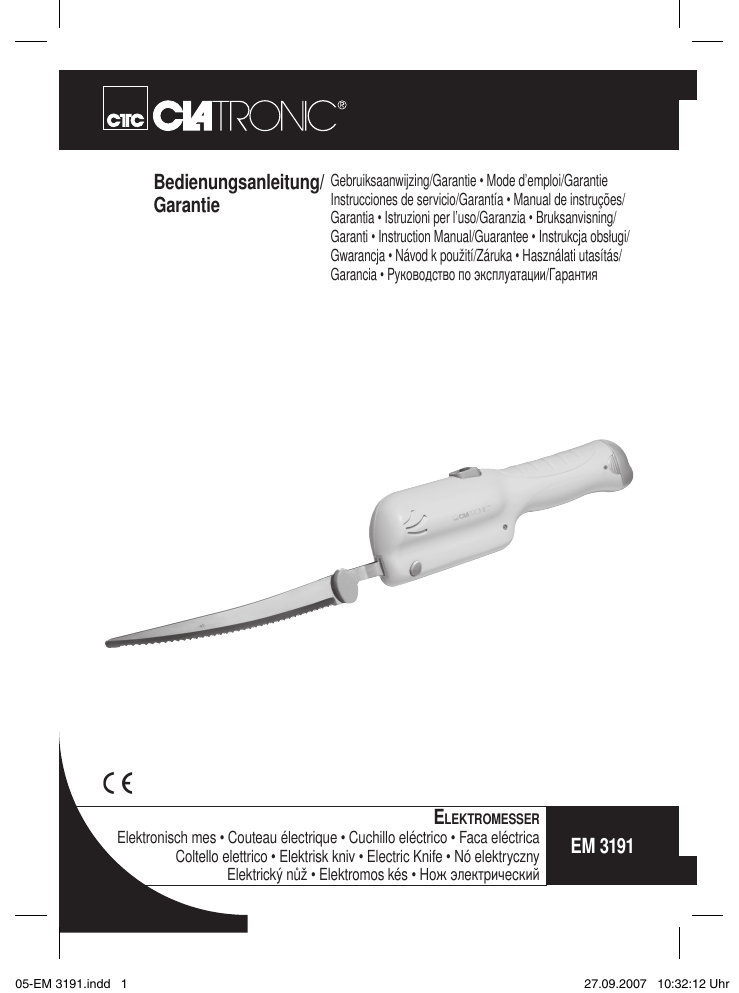 Bedienungsanleitung/ Gebruiksaanwijzing/Garantie • Mode d’emploi/Garantie Instrucciones de servicio/Garantía • Manual de instruções/ Garantie Garantia • Istruzioni per l’uso/Garanzia • Bruksanvisning/ Garanti • Instruction Manual/Guarantee • Instrukcja obsługi/ Gwarancja • Návod k použití/Záruka • Használati utasítás/ Garancia • Руководство по эксплуатации/Гарантия ELEKTROMESSER Elektronisch mes • Couteau électrique • Cuchillo eléctrico • Faca eléctrica Coltello elettrico • Elektrisk kniv • Electric Knife • Nó elektryczny Elektrický nůž • Elektromos kés • Нож электрический 05-EM 3191.indd 1 EM 3191 27.09.2007 10:32:12 Uhr D Inhalt D Seite Übersicht der Bedienelemente ................ 3 Bedienungsanleitung ................................4 Technische Daten .....................................7 Garantie.....................................................8 Inhoud NL Pagina Overzicht van de bedieningselementen....3 Gebruiksaanwijzing ................................. 10 Technische gegevens ............................. 13 Garantie................................................... 14 Sommaire F Page Liste des différents éléments de commande .....3 Mode d’emploi......................................... 16 Données techniques ............................... 19 Garantie...................................................20 Indice E Página Innhold N Side Oversikt over betjeningselementene ........3 Bruksanvisning ........................................40 Tekniske data..........................................43 Garanti.....................................................43 Contents GB PL Strona Przegląd elementów obłsugi .....................3 Instrukcja obsługi .................................... 51 Dane techniczne .....................................54 Gwarancja ...............................................55 Obsah CZ Přehled ovládacích prvků .........................3 Návod k použití .......................................58 Technické údaje ......................................61 Záruka .....................................................62 P H Página Descrição dos elementos .........................3 Manual de instruções..............................28 Características técnicas .........................31 Garantía ..................................................32 Indice I Pagina Elementi di comando ................................3 Istruzioni per l’uso ...................................34 Dati tecnici...............................................37 Garanzia ..................................................38 2 05-EM 3191.indd 2 Tartalom RUS P I N GB Oldal A kezelőelemek áttekintése ......................3 Használati utasítás..................................64 Műszaki adatok .......................................67 Garancia ..................................................68 Содержание E Strana Indicación de los elementos de manejo ...3 Instrucciones de servicio ........................22 Datos técnicos.........................................25 Garantia...................................................26 Índice F Page Overview of the Components ..................3 Instruction Manual...................................45 Technical Data ........................................49 Guarantee ...............................................49 Spis treści NL стр. Обзор деталей прибора..........................3 Руководство по эксплуатации..............70 Технические данные ............................73 Гарантия ................................................. 74 PL CZ H RUS 27.09.2007 10:32:13 Uhr Übersicht der Bedienelemente Overzicht van de bedieningselementen • Liste des différents éléments de commande Indicación de los elementos de manejo • Descrição dos elementos Elementi di comando • Oversikt over betjeningselementene Overview of the Components • Przegląd elementów obłsugi Přehled ovládacích prvků • A kezelőelemek áttekintése Обзор деталей прибора 3 05-EM 3191.indd 3 27.09.2007 10:32:13 Uhr D Allgemeine Sicherheitshinweise Lesen Sie vor Inbetriebnahme dieses Gerätes die Bedienungsanleitung sehr sorgfältig durch und bewahren Sie diese inkl. Garantieschein, Kassenbon und nach Möglichkeit den Karton mit Innenverpackung gut auf. Falls Sie das Gerät an Dritte weitergeben, geben Sie auch die Bedienungsanleitung mit. • • • • • • • Benutzen Sie das Gerät ausschließlich für den privaten und den dafür vorgesehenen Zweck. Dieses Gerät ist nicht für den gewerblichen Gebrauch bestimmt. Benutzen Sie es nicht im Freien (außer es ist für den bedingten Einsatz im Freien vorgesehen). Halten Sie es vor Hitze, direkter Sonneneinstrahlung, Feuchtigkeit (auf keinen Fall in Flüssigkeiten tauchen) und scharfen Kanten fern. Benutzen Sie das Gerät nicht mit feuchten Händen. Bei feucht oder nass gewordenem Gerät sofort den Netzstecker ziehen. Schalten Sie das Gerät aus und ziehen Sie immer den Stecker aus der Steckdose (ziehen Sie am Stecker, nicht am Kabel) wenn Sie das Gerät nicht benutzen, Zubehörteile anbringen, zur Reinigung oder bei Störung. Betreiben Sie das Gerät nicht unbeaufsichtigt. Sollten Sie den Arbeitsplatz verlassen, schalten Sie das Gerät bitte immer aus, bzw. ziehen Sie den Stecker aus der Steckdose (ziehen Sie am Stecker, nicht am Kabel). Prüfen Sie Gerät und Kabel regelmäßig auf Schäden. Ein beschädigtes Gerät bitte nicht in Betrieb nehmen. Reparieren Sie das Gerät nicht selbst, sondern suchen Sie bitte einen autorisierten Fachmann auf. Um Gefährdungen zu vermeiden, ein defektes Netzkabel bitte nur vom Hersteller, unserem Kundendienst oder einer ähnlich qualifizierten Person durch ein gleichwertiges Kabel ersetzen lassen. Verwenden Sie nur Original-Zubehör. Beachten