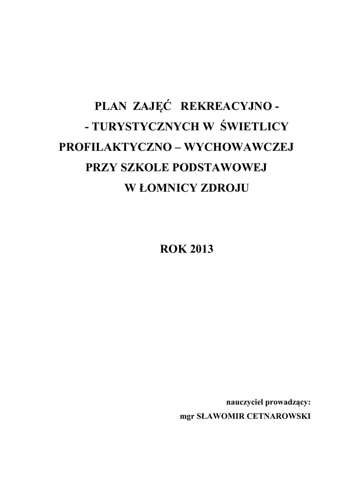 PLAN ZAJĘĆ REKREACYJNO - TURYSTYCZNYCH W ŚWIETLICY PROFILAKTYCZNO – WYCHOWAWCZEJ PRZY SZKOLE PODSTAWOWEJ W ŁOMNICY ZDROJU ROK 2013 nauczyciel prowadzący: mgr SŁAWOMIR CETNAROWSKI PLAN ZAJĘĆ REKREACYJNO - TURYSTYCZNYCH W ŚWIETLICY PROFILAKTYCZNO – WYCHOWAWCZEJ PRZY SZKOLE PODSTAWOWEJ W ŁOMNICY ZDROJU Główne cele programu: - kreowanie aktywnego trybu zycia - zaspokojenie biologicznej potrzeby zwiększonej aktywności ruchowej - rozwój ogólnej sprawności fizycznej - kształtowanie nawyku uczestnictwa w dowolnie wybranych formach rekreacyjnych - rozbudzanie zainteresowań dzieci i młodzieży różnymi formami aktywności ruchowej - kształtowanie umiejętności organizowania i aktywnego spędzania czasu wolnego, - rozwijanie aktywności twórczej dzieci - rozbudzanie zainteresowań sportowych - kształtowanie postaw warunkujących bezpieczeństwo ucznia w czasie zajęć sportowych, zachęcanie dzieci i młodzieży do przestrzegania zasad higieny i prowadzenia zdrowego stylu życia. Szkoła Podstawowa w Łomnicy Zdroju Marzec – Grudzień 2013r. Temat zajęć Zabawy i gry ruchowe. . 1. Gra w „dwa ognie” 2. Usportowione „dwa ognie” – liczenie zbić. 3. „Zbijak” 4. „Siatkonoga” Zdania wychowawcze Uczeń współdziała w grupie w celu doskonalenia umiejętności, angażuje się w zabawę, rozwija własne zainteresowania i umiejętności, doskonali swoja sprawność w gronie kolegów i koleżanek, Mini gry sportowe Mini koszykówka 1. Doskonalenie kozłowania ze zmianą ręki, tempa, kierunku. 2. Uczymy się rzutu z biegu do kosza po kozłowaniu. 3. Doskonalimy podania i chwyty piłki oburącz w ruchu. 4. Rzucamy do kosza z różnych pozycji. 5. Organizujemy różne konkursy z Uczeń przeżywa radość i satysfakcję ze stopnia opanowania umiejętności ruchowych, Uczeń rozwija swoje umiejętności wspólnego bawienia się i ćwiczenia, Uczeń współdziałania w małych zespole, rozwija swoje umiejętności podporządkowania się w celu osiągnięcia sukcesu przez zespół, piłkami i mecze w mini koszykówkę. Mini siatkówka 1. Doskonalimy zabawę ,,piłka siatkowa rzucana” 2. Nauka zagrywki sposobem górnym. 3. Nauka i doskonalenie odbić sposobem oburącz górnym 4. Doskonalenie poznanych elementów technicznych. 5. Uczymy się współpracy w zespole dwójkowym i trójkowym. Uczeń przestrzega reguł, Uczy się współpracy w zespole , Pełni role sędziego pomocniczego, Kulturalnie i sportowo zachowuje się podczas rywalizacji, uczeń wykazuje swoją pozytywna postawę do ćwiczeń ruchowych w czasie wolnym od zajęć szkolnych Mini piłka ręczna 1. Nauka podania i chwytów. 2. Kozłujemy piłkę ze zmianą kierunku i ręki kozłującej. 3. Uczymy się prowadzenia piłki w dwójkach zakończone rzutem. 4. Organizujemy zabawy doskonalące kozłowanie lewą i prawą ręką. 5. Nauka rzutu piłki jednorącz do bramki dowolnym sposobem Mini piłka nożna 1. Bawimy się piłką nogą lewą prawą i głową. 2. Przygotowujemy się do zadania ,,jak strzelić gola”. 3. Nauka przyjęcia i uderzenia piłką. 4. Doskonalimy strzały z różnych pozycji w określone miejsce. 5. Sami dla siebie organizujemy rozgrywki w mini piłkę nożną. Gimnastyka, ćwiczenia na przyrządach, zachowanie bezpieczeństwa. 1. Uczymy się i doskonalimy przewrót w przód. 2. Uczymy się umiejętności asekuracji i samoasekuracji przy staniu na rękach. 3. Pokonujemy zwinnościowy tor przeszkód. 4. Łączymy przewroty w przód i w tył w mały układ gimnastyczny. 5. Uczymy się przerzutu bokiem Uczeń samodzielnie prowadzi ćwiczenia kształtujące, przygotowujące go zadań lekcji, Uczeń współdziała w zespole ćwiczących ,uczeń kontroluje przyjmowanie prawidłowej postawy ciała podczas wykonywania ćwiczeń oraz pamięta o kontroli swojej postawy w innych sytuacjach, Uczeń współdziała ze współćwiczącym i pomaga mu w prawidłowym wykonaniu ćwiczeń, Dba o bezpieczeństwo swojego kolegi i koleżanki, Uczeń zwraca uwagę na dokładne i staranne wykonywanie ćwiczeń dba o bezpieczeństwo podczas wykonywania ćwiczeń, Uczeń czuje się bezpiecznie i pokonuje lęk przed ćwiczeniami na zmniejszonej podstawie podłoża Lekkoatletyka – biegi, skoki, rzuty . 1. Kształtowanie zdolności szybkościowych. 2. Rzucamy różnymi przyborami do celu i na odległość (piłka lekarska i inne). 3. Nauka przekazywania pałeczki sztafetowej. 4. Nauka rozbiegu oraz odbicia do skoku w dal. Ćwiczenia i gry terenowe ( przemarsz, podchody, tropienie). 1. Uczymy się bezpiecznie pokonywać naturalny tor przeszkód. 2. Nauka orientowania się terenie. 3. Sprawdzamy umiejętności przeprowadzania ćwiczeń w terenie. Tenis stołowy – gra indywidualna i deblowa. Uczeń angażuje się w organizacje oraz pokonanie toru przeszkód, Uczeń współdziała z partnerem w celu realizacji zadań (sztafeta), Uczeń przestrzega zasad bezpieczeństwa w trakcie ćwiczeń z piłkami lekarskimi, uczeń samodzielnie wykonuje rozgrzewkę przygotowującą do danego typu ćwiczeń, Uczeń potrafi dbać o higienę osobistą przed w trakcie i po wysiłku, Uczeń współuczestniczy w rozwijaniu swojej sprawności i dbaniu o bezpieczeństwo współćwiczącego. Uczeń wybiera bezpieczny sposób pokonywania przeszkody terenowej, poszukuje najlepszego rozwiązania określonego zadania, Uczeń wybiera właściwy sposób zachowania się w terenie naturalnym, wyraża szacunek do otaczającej przyrody, Uczeń wie jak należy przygotować się do ćwiczeń, chce hartować swój organizm, dba o siebie ,zmieniając strój do ćwiczeń i po ćwiczeniach, Uczeń pomaga słabym kolegom i koleżankom wykonywać zadania oraz angażuje się w organizację bezpiecznego miejsca do ćwiczeń. Uczeń zna zasady zdrowej rywalizacji, gra fair play, 1. Nauka i doskonalenie odbicia piłeczki Uczeń umiejętnie współpracuje z partnerem przez siatkę. w grze w deblowej, 2. Nauka i doskonalenie zagrywki Uczeń potrafi zorgan
