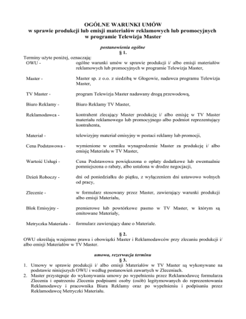 OGÓLNE WARUNKI UMÓW w sprawie produkcji lub emisji materiałów reklamowych lub promocyjnych w programie Telewizja Master postanowienia ogólne § 1. Terminy użyte poniżej, oznaczają: ogólne warunki umów w sprawie produkcji i/ albo emisji materiałów OWU reklamowych lub promocyjnych w programie Telewizja Master, Master - Master sp. z o.o. z siedzibą w Głogowie, nadawca programu Telewizja Master, TV Master - program Telewizja Master nadawany drogą przewodową, Biuro Reklamy - Biuro Reklamy TV Master, Reklamodawca - kontrahent zlecający Master produkcję i/ albo emisję w TV Master materiału reklamowego lub promocyjnego albo podmiot reprezentujący kontrahenta, Materiał - telewizyjny materiał emisyjny w postaci reklamy lub promocji, Cena Podstawowa - wymienione w cenniku wynagrodzenie Master za produkcję i/ albo emisję Materiału w TV Master, Wartość Usługi - Cena Podstawowa powiększona o opłaty dodatkowe lub ewentualnie pomniejszona o rabaty, albo ustalona w drodze negocjacji, Dzień Roboczy - dni od poniedziałku do piątku, z wyłączeniem dni ustawowo wolnych od pracy, Zlecenie - w formularz stosowany przez Master, zawierający warunki produkcji albo emisji Materiału, Blok Emisyjny - premierowe lub powtórkowe pasmo w TV Master, w którym są emitowane Materiały, Metryczka Materiału - formularz zawierający dane o Materiale. § 2. OWU określają wzajemne prawa i obowiązki Master i Reklamodawców przy zlecaniu produkcji i/ albo emisji Materiałów w TV Master. umowa, rezerwacja terminu § 3. 1. Umowy w sprawie produkcji i/ albo emisji Materiałów w TV Master są wykonywane na podstawie niniejszych OWU i według postanowień zawartych w Zleceniach. 2. Master przystępuje do wykonywania umowy po wypełnieniu przez Reklamodawcę formularza Zlecenia i opatrzeniu Zlecenia podpisami osoby (osób) legitymowanych do reprezentowania Reklamodawcy i pracownika Biura Reklamy oraz po wypełnieniu i podpisaniu przez Reklamodawcę Metryczki Materiału. 3. Metryczka Materiału stanowi integralną część Zlecenia. 4. Emisja Materiału jest dokonywana w terminie zarezerwowanym przez Reklamodawcę i w Bloku Emisyjnym. 5. W przypadku, gdy przedmiotem emisji ma być Materiał pochodzący od Reklamodawcy uznaje się, że termin emisji został zarezerwowany, jeżeli: a) formularz Zlecenia został wypełniony i opatrzony podpisami Reklamodawcy i pracownika Biura Reklamy, b) Reklamodawca wypełnił i podpisał Metryczkę Materiału, c) data emisji Materiału została wpisana do harmonogramu emisji prowadzonego przez Biuro Reklamy, d) Zlecenie, Metryczka Materiału, w postaci opisanej pod lit. a) i b) oraz Materiał, zostały złożone w Biurze Reklamy co najmniej na 10 Dni Roboczych przed datą emisji Materiału wpisaną do harmonogramu emisji. 6. W przypadku, gdy przedmiotem emisji ma być Materiał wyprodukowany przez Master na zamówienie Reklamodawcy, Reklamodawca zawiera odrębną umowę na wyprodukowanie Materiału i odrębną na emisję Materiału, a do rezerwacji terminu emisji stosuje się odpowiednio postanowienia ust. 5. 7. Reklamodawca może złożyć rezygnację z emisji Materiału. 8. Rezygnację, pod rygorem bezskuteczności, składa się na piśmie opatrzonym podpisami osoby (osób) legitymowanych do reprezentowania Reklamodawcy, w Biurze Reklamy, co najmniej na 5 Dni Roboczych przed datą wymienioną w ust. 5 lit. c). 9. W razie uchybienia terminowi do złożenia rezygnacji z emisji Materiału, wówczas według wyboru Master: a) Materiał zostanie wyemitowany i Master zachowuje prawo do wynagrodzenia w wysokości Wartości Usługi, albo b) Master wyrazi zgodę na rezygnację z emisji Materiału, zachowując prawo do: (i) 30 % Wartości Usługi, gdy Reklamodawca rezygnuje z emisji na 4 lub 3 Dni Robocze przed datą wymienioną w ust. 5 lit. c), (ii) 50 % Wartości Usługi, gdy Reklamodawca rezygnuje z emisji na 2 lub 1 Dzień Roboczy przed datą wymienioną w ust. 5 lit. c), przy czym na pisemne żądanie Reklamodawcy, Master odstąpi od emisji Materiału, a wówczas Reklamodawca będzie zobowiązany do zapłaty Master odszkodowania umownego w wysokości 1,5 krotności Wartości Usługi. 1. a) b) c) 2. 3. 4. odmowa emisji lub produkcji § 4. Master może odmówić emisji Materiału pochodzącego od Reklamodawcy, jeżeli: Materiał zawiera treści sprzeczne z linią programową TV Master, lub emisja Materiału byłaby sprzeczna z obowiązującym porządkiem prawnym, lub stan techniczny Materiału nie pozwala na jego emisję. Master może odmówić wyprodukowania Materiału, jeżeli: a) Reklamodawca domaga się pomieszczenia w nim treści sprzecznych z linią programową TV Master lub obowiązującym porządkiem prawnym, b) z przyczyn organizacyjnych lub technicznych wyprodukowanie Materiału nie jest możliwe. Odmowy emisji lub wyprodukowania Materiału dokonuje Biuro Reklamy: a) jeżeli Materiał pochodzi od Reklamodawcy - niezwłocznie po stwierdzeniu co najmniej jednej z okoliczności wymienionych w ust. 1, b) jeżeli Reklamodawca zamawia produkcję Materiału - przy składaniu zamówienia, gdy z informacji powziętych od Reklamodawcy wynika, że wystąpi co najmniej jedna z okoliczności wymienionych w ust. 2. Jeżeli odmowa emisji Materiału pochodzącego od Reklamodawcy jest dokonywana po przyjęciu wpłaty od Reklamodawcy, wpłata ta jest zwracana w terminie 14 dni od daty odmowy z potrąceniem opłaty za dokonanie oceny Materiału w wysokości 20 % uiszczonej wpłaty. 5. W przypadku, gdy Reklamodawca przed emisją Materiału jest zobowiązany do uiszczenia całości lub części wynagrodzenia za emisję Materiału, uznaje się że umowa została zawarta z zastrzeżeniem ziszczenia się warunku w postaci dokonania wpłaty. 6. Poza przyczynami wymienionymi w ust. 1 Master może omówić emisji Materiału, jeżeli Reklamodawca zamówił cykliczne emisje, był zobowiązany do zapłaty wynagrodzenia za poszczególne emisje i jest w zwłoce w uiszczeniu wynagrodzen