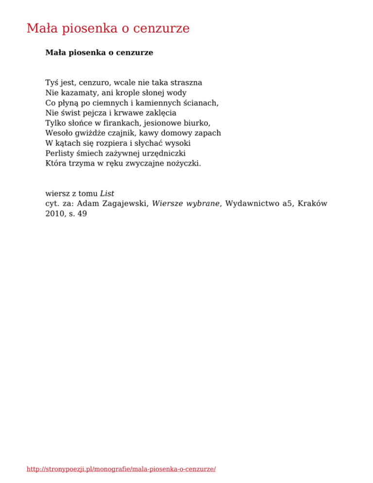 Mała piosenka o cenzurze Mała piosenka o cenzurze Tyś jest, cenzuro, wcale nie taka straszna Nie kazamaty, ani krople słonej wody Co płyną po ciemnych i kamiennych ścianach, Nie świst pejcza i krwawe zaklęcia Tylko słońce w firankach, jesionowe biurko, Wesoło gwiżdże czajnik, kawy domowy zapach W kątach się rozpiera i słychać wysoki Perlisty śmiech zażywnej urzędniczki Która trzyma w ręku zwyczajne nożyczki. wiersz z tomu List cyt. za: Adam Zagajewski, Wiersze wybrane, Wydawnictwo a5, Kraków 2010, s. 49 http://stronypoezji.pl/monografie/mala-piosenka-o-cenzurze/