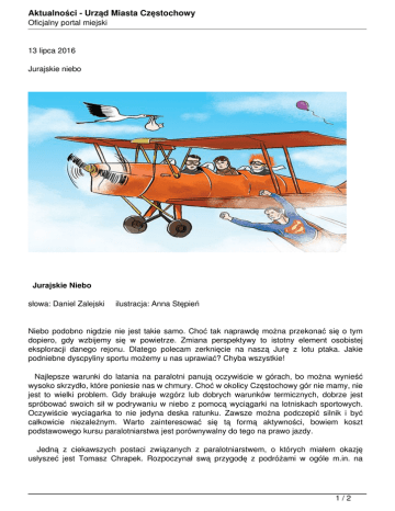 Aktualności - Urząd Miasta Częstochowy Oficjalny portal miejski 13 lipca 2016 Jurajskie niebo Jurajskie Niebo słowa: Daniel Zalejski ilustracja: Anna Stępień Niebo podobno nigdzie nie jest takie samo. Choć tak naprawdę można przekonać się o tym dopiero, gdy wzbijemy się w powietrze. Zmiana perspektywy to istotny element osobistej eksploracji danego rejonu. Dlatego polecam zerknięcie na naszą Jurę z lotu ptaka. Jakie podniebne dyscpyliny sportu możemy u nas uprawiać? Chyba wszystkie! Najlepsze warunki do latania na paralotni panują oczywiście w górach, bo można wynieść wysoko skrzydło, które poniesie nas w chmury. Choć w okolicy Częstochowy gór nie mamy, nie jest to wielki problem. Gdy brakuje wzgórz lub dobrych warunków termicznych, dobrze jest spróbować swoich sił w podrywaniu w niebo z pomocą wyciągarki na lotniskach sportowych. Oczywiście wyciagarka to nie jedyna deska ratunku. Zawsze można podczepić silnik i być całkowicie niezależnym. Warto zainteresować się tą formą aktywności, bowiem koszt podstawowego kursu paralotniarstwa jest porównywalny do tego na prawo jazdy. Jedną z ciekawszych postaci związanych z paralotniarstwem, o których miałem okazję usłyszeć jest Tomasz Chrapek. Rozpoczynał swą przygodę z podróżami w ogóle m.in. na 1/2 Aktualności - Urząd Miasta Częstochowy Oficjalny portal miejski Jurze. Z czasem zaczął latać. Zaganiał na skrzydle nawet renifery na Grenlandii. Jego bajeczne zdjęcia można obejrzeć w sieci, do czego gorąco zachęcam. Większości z nas latanie kojarzy się po prostu z samolotami. Choć współcześnie latamy często z Katowic, Krakowa czy Warszawy to warto przypomnieć, że w Częstochowie też mieliśmy swoje pasy startowe. W 1928 r. na Kucelinie, dzięki Lidze Obrony Powietrznej i Przeciwgazowej, powstało nasze pierwsze lotnisko. W latach pięćdziesiątych jego tereny przejęła ówczesna Huta im. Bieruta. Miejsce to odwiedził nawet legendarny polski duet lotniczy Franciszek Żwirko i Stanisław Wigura, którzy w 1932 r. zdystansowali konkurencję na Międzynarodowych Zawodach Samolotów Turystycznych znanych jako „Challenge”. Ku ich pamięci – jak wiemy – nazwano jedną z ulic w Częstochowie, boczną od Jasnogórskiej. O naszym historycznym lotnisku przypomina obelisk pośrodku ronda, a właściwie Skweru Lotników przy ulicy Korfantego. Mija go wielu rowerzystów udających się do Olsztyna. Zachęcam, aby przystanąć przy nim przy najbliższej okazji. Będąc ostatnio na lotnisku w Rudnikach, w jednym z budynków, miałem okazję przeczytać piękny cytat z Janusza Meissnera: „Latanie na szybowcach jest nie tylko sportem: jest sztuką, która kryje w sobie wiele doznań estetycznych i daje pilotowi o wiele więcej zadowolenia niż lot samolotem. Dopiero latanie na szybowcach jest prawdziwym lataniem, bo opiera się na znajomości powietrza…”. Trudno się nie zgodzić z tak trafną sentencją, która w moim odczuciu mówi wszystko o tej subtelnej dyscyplinie. Warto wiedzieć, że lot zapoznawczy szybowcem jest dostępny dla wszystkich. Jeżeli tylko macie ochotę wzbić się w powietrze, czy to w formie jednorazowej, niezapomnianej rozrywki, czy też pełnego szkolenia, zachęcam do rozpoczęcia przygody z powietrzem od kontaktu z Aeroklubem Częstochowskim #℣佐⌡⌀眀眀眀⸀愀攀爀漀欀氀甀戀ⴀ挀稀攀猀琀漀挀栀漀眀愀⸀漀爀最⸀瀀氀⌡⍃倣℣, który z pewnością pomoże sięgnąć nieba. Do zobaczenia na szlaku! Pozostałe aktualności 2/2 Powered by TCPDF (www.tcpdf.org)
