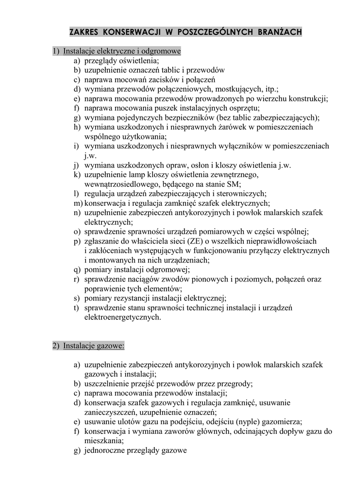 ZAKRES KONSERWACJI W POSZCZEGÓLNYCH BRANŻACH 1) Instalacje elektryczne i odgromowe a) przeglądy oświetlenia; b) uzupełnienie oznaczeń tablic i przewodów c) naprawa mocowań zacisków i połączeń d) wymiana przewodów połączeniowych, mostkujących, itp.; e) naprawa mocowania przewodów prowadzonych po wierzchu konstrukcji; f) naprawa mocowania puszek instalacyjnych osprzętu; g) wymiana pojedynczych bezpieczników (bez tablic zabezpieczających); h) wymiana uszkodzonych i niesprawnych żarówek w pomieszczeniach wspólnego użytkowania; i) wymiana uszkodzonych i niesprawnych wyłączników w pomieszczeniach j.w. j) wymiana uszkodzonych opraw, osłon i kloszy oświetlenia j.w. k) uzupełnienie lamp kloszy oświetlenia zewnętrznego, wewnątrzosiedlowego, będącego na stanie SM; l) regulacja urządzeń zabezpieczających i sterowniczych; m) konserwacja i regulacja zamknięć szafek elektrycznych; n) uzupełnienie zabezpieczeń antykorozyjnych i powłok malarskich szafek elektrycznych; o) sprawdzenie sprawności urządzeń pomiarowych w części wspólnej; p) zgłaszanie do właściciela sieci (ZE) o wszelkich nieprawidłowościach i zakłóceniach występujących w funkcjonowaniu przyłączy elektrycznych i montowanych na nich urządzeniach; q) pomiary instalacji odgromowej; r) sprawdzenie naciągów zwodów pionowych i poziomych, połączeń oraz poprawienie tych elementów; s) pomiary rezystancji instalacji elektrycznej; t) sprawdzenie stanu sprawności technicznej instalacji i urządzeń elektroenergetycznych. 2) Instalacje gazowe: a) uzupełnienie zabezpieczeń antykorozyjnych i powłok malarskich szafek gazowych i instalacji; b) uszczelnienie przejść przewodów przez przegrody; c) naprawa mocowania przewodów instalacji; d) konserwacja szafek gazowych i regulacja zamknięć, usuwanie zanieczyszczeń, uzupełnienie oznaczeń; e) usuwanie ulotów gazu na podejściu, odejściu (nyple) gazomierza; f) konserwacja i wymiana zaworów głównych, odcinających dopływ gazu do mieszkania; g) jednoroczne przeglądy gazowe h) zgłaszanie do właściciela sieci (ZG) o wszelkich nieprawidłowościach i zakłóceniach występujących w funkcjonowaniu przyłączy gazowych i montowanych na nich urządzeniach i osprzęcie i) przeglądy kominiarskie. 3) Instalacje wodno- kanalizacyjne i centralnego ogrzewania, oraz CCW a) likwidacja nieszczelności połączeń i przewodów oraz przejść przewodów przez przegrody; b) konserwacja, regulacja i uszczelnianie zaworów głównych; c) naprawa lub wymiana uszkodzonych części przewodów instalacyjnych; d) usuwanie miejscowych przecieków w pionach i poziomach kanalizacyjnych, łącznie z wymiana poszczególnych elementów; e) uzupełnienie oznaczeń, zabezpieczeń antykorozyjnych i powłok malarskich; f) instalacja i wymiana wodomierzy, usuwanie zanieczyszczeń; g) uzupełnienie ubytków uszczelnień połączeń instalacji kanalizacji sanitarnej, deszczowej; h) odłączanie nieczynnych urządzeń i osprzętu, montaż nowych urządzeń; i) czyszczenie i udrażnianie przyłączeniowych studzienek kanalizacji sanitarnych; j) naprawa i czyszczenie wywiewek dachowych; k) udrażnianie pionów i poziomów kanalizacyjnych; l) uszczelnienie bądź wymiana zaworów grzejnikowych; m) usunięcie przecieku na grzejniku, łącznie z wymianą poszczególnych wadliwych „żeberek” n) założenie bądź wymiana kryzy przy poszczególnych grzejnikach; o) konserwacja zaworów i zabezpieczenie przed korozją urządzeń w rozdzielaczach CO; p) konserwacja, zabezpieczenia antykorozyjne poziomów CO i CCW w piwnicach; q) uzupełnienie izolacji rur CO i CCW w piwnicach; r) zgłaszanie do właściciela sieci (MPWiK) o wszelkich nieprawidłowościach i zakłóceniach w funkcjonowaniu sieci sanitarnych, przyłączy wodociągowych i montowanych na nich urządzeniach i osprzęcie. 4) Dachy : a) czyszczenie rynien i rur spustowych; b) naprawa uszkodzonych elementów obróbek blacharskich: ogniomurów, kominów pasów pod i nad rynnowych i balkonów, rynien i rur spustowych lub częściowa wymiana; c) naprawa mocowania rynien i rur spustowych; d) likwidacja w pokryciu dachowym papowym nieszczelności i pęcherzy zakwalifikowanych do częściowej naprawy o łącznej pow. 10m2; e) mocowanie , nadanie spadków i doszczelnienie obróbek blacharskich; f) uszczelnienie miejsc łączenia obróbek z papą oraz obróbek parapetów zewnętrznych i balkonów; g) usuwanie śniegu oraz sopli lodu w okresie zimowym; h) uzupełnienie zabezpieczeń antykorozyjnych i powłok malarskich elementów odwodnienia i obróbek blacharskich. 5) Stolarka okienna i drzwiowa : a) regulacja i dopasowanie stolarki okiennej i drzwiowej w częściach wspólnych: klatkach schodowych, korytarzach i w piwnicach; b) regulacja lub wymiana uszkodzonych zamków w pomieszczeniach j.w.; c) uzupełnienie okuć, szyldów, osłon w pomieszczeniach j.w.; d) regulacja samozamykaczy; e) naprawa , wymiana lub wykonanie parapetów zewnętrznych f) szklenie drzwi wejściowych do klatek, okienek piwnicznych i na klatkach oraz pomieszczeniach wspólnego użytku; 6) Elementy budynku ( mieszkania wewnątrz, elewacja, tynki, posadzki, klatki schodowe) oraz otoczenie budynków. a) uzupełnienie i naprawa tynków wewnętrznych; b) uzupełnienie i naprawa tynków zewnętrznych o łącznej powierzchni do 5m2; c) likwidacja miejscowych rys i spękań tynków; d) naprawa uszkodzonych powłok malarskich ścian i sufitów; e) uzupełnienie miejscowych ubytków i wymiana posadzek, okładzin schodów i okładzin ceramicznych; f) uzupełnienie miejscowych ubytków lub wymiana (o powierzchni do 10m2) opasek chodników i dojść do budynków; g) naprawa elementów i wymiana terenowych elementów odwadniających; h) naprawa mocowania i uzupełnienie brakujących prętów balustrad schodowych i balkonowych; i) uzupełnienie szyb zbrojonych w balustradach balkonowych; j) mocowanie i wymiana pochwytów; k) naprawa mocowania wycieraczek; l) nap