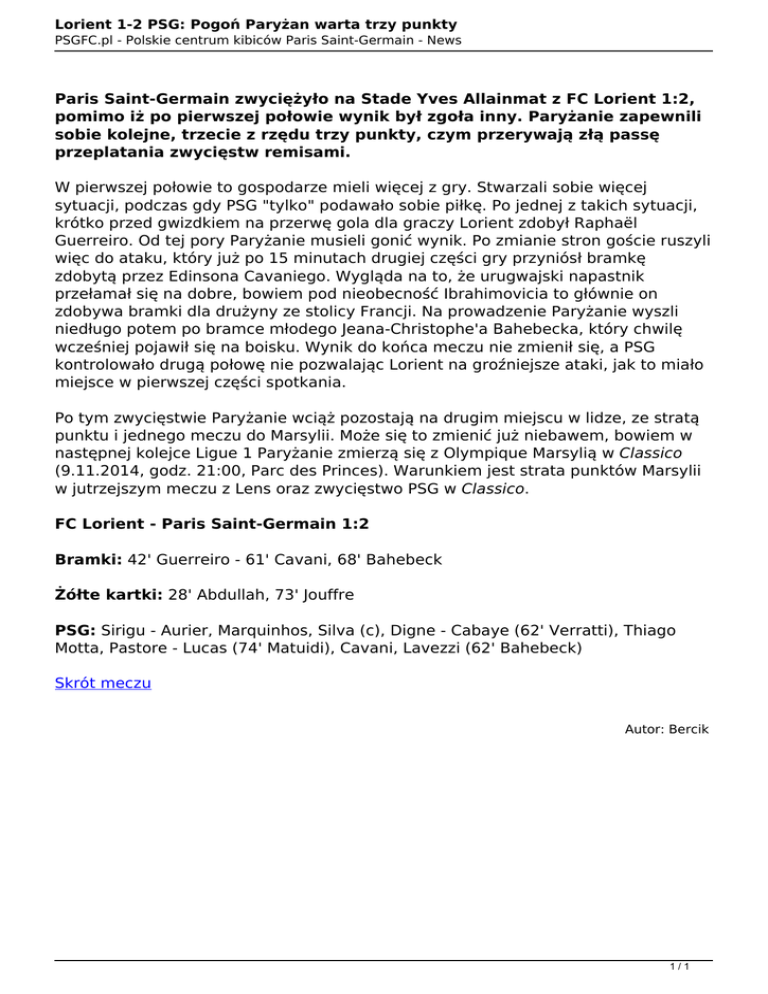 Lorient 1-2 PSG: Pogoń Paryżan warta trzy punkty PSGFC.pl - Polskie centrum kibiców Paris Saint-Germain - News Paris Saint-Germain zwyciężyło na Stade Yves Allainmat z FC Lorient 1:2, pomimo iż po pierwszej połowie wynik był zgoła inny. Paryżanie zapewnili sobie kolejne, trzecie z rzędu trzy punkty, czym przerywają złą passę przeplatania zwycięstw remisami. W pierwszej połowie to gospodarze mieli więcej z gry. Stwarzali sobie więcej sytuacji, podczas gdy PSG "tylko" podawało sobie piłkę. Po jednej z takich sytuacji, krótko przed gwizdkiem na przerwę gola dla graczy Lorient zdobył Raphaël Guerreiro. Od tej pory Paryżanie musieli gonić wynik. Po zmianie stron goście ruszyli więc do ataku, który już po 15 minutach drugiej części gry przyniósł bramkę zdobytą przez Edinsona Cavaniego. Wygląda na to, że urugwajski napastnik przełamał się na dobre, bowiem pod nieobecność Ibrahimovicia to głównie on zdobywa bramki dla drużyny ze stolicy Francji. Na prowadzenie Paryżanie wyszli niedługo potem po bramce młodego Jeana-Christophe'a Bahebecka, który chwilę wcześniej pojawił się na boisku. Wynik do końca meczu nie zmienił się, a PSG kontrolowało drugą połowę nie pozwalając Lorient na groźniejsze ataki, jak to miało miejsce w pierwszej części spotkania. Po tym zwycięstwie Paryżanie wciąż pozostają na drugim miejscu w lidze, ze stratą punktu i jednego meczu do Marsylii. Może się to zmienić już niebawem, bowiem w następnej kolejce Ligue 1 Paryżanie zmierzą się z Olympique Marsylią w Classico (9.11.2014, godz. 21:00, Parc des Princes). Warunkiem jest strata punktów Marsylii w jutrzejszym meczu z Lens oraz zwycięstwo PSG w Classico. FC Lorient - Paris Saint-Germain 1:2 Bramki: 42' Guerreiro - 61' Cavani, 68' Bahebeck Żółte kartki: 28' Abdullah, 73' Jouffre PSG: Sirigu - Aurier, Marquinhos, Silva (c), Digne - Cabaye (62' Verratti), Thiago Motta, Pastore - Lucas (74' Matuidi), Cavani, Lavezzi (62' Bahebeck) Skrót meczu Autor: Bercik 1/1 Powered by TCPDF (www.tcpdf.org)