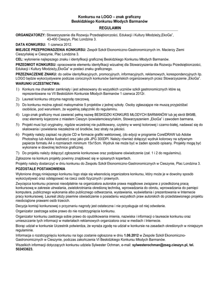 Konkursu na LOGO – znak graficzny Beskidzkiego Konkursu Młodych Barmanów REGULAMIN ORGANIZATORZY: Stowarzyszenie dla Rozwoju Przedsiębiorczości, Edukacji i Kultury Młodzieży„EkoGa”, 43-400 Cieszyn, Plac Londzina 3. DATA KONKURSU: 1 czerwca 2012. MIEJSCE PRZEPROWADZENIA KONKURSU: Zespół Szkół Ekonomiczno-Gastronomicznych im. Macierzy Ziemi Cieszyńskiej w Cieszynie, Plac Londzina 3. CEL: wyłonienie najlepszego znaku i identyfikacji graficznej Beskidzkiego Konkursu Młodych Barmanów. PRZEDMIOT KONKURSU: opracowanie elementu identyfikacji wizualnej dla Stowarzyszenia dla Rozwoju Przedsiębiorczości, Edukacji i Kultury Młodzieży„EkoGa” w postaci znaku graficznego. PRZEZNACZENIE ZNAKU: do celów identyfikacyjnych, promocyjnych, informacyjnych, reklamowych, korespondencyjnych itp. LOGO będzie wykorzystywane podczas corocznych konkursów barmańskich organizowanych przez Stowarzyszenie „EkoGa”. WARUNKI UCZESTNICTWA: 1) Konkurs ma charakter zamknięty i jest adresowany do wszystkich uczniów szkół gastronomicznych które są reprezentowane na VII Beskidzkim Konkursie Młodych Barmanów 1 czerwca 2012r. 2) Laureat konkursu otrzyma nagrodę rzeczową. 3) Do konkursu można zgłosić maksymalnie 5 projektów z jednej szkoły. Osoby zgłaszające nie muszą przyjeżdżać osobiście, pod warunkiem, że wypełnią załączniki do regulaminu. 4) Logo-znak graficzny musi zawierać pełną nazwę BESKIDZKI KONKURS MŁODYCH BARMANÓW lub jej skrót BKMB, oraz elementy kojarzone z miastem Cieszyn /powiatemcieszyńskim, Stowarzyszeniem „EkoGa” i zawodem barmana. 5) Projekt musi być oryginalny, nigdzie wcześniej nie publikowany, czytelny w wersji kolorowej i czarno-białej, nadawać się do skalowania i powielania niezależnie od środków, bez straty na jakości. 6) Projekty należy zapisać na płycie CD w formacie grafiki wektorowej, (do edycji w programie CorelDRAW lub Adobe Photoshop lub Adobe Ilustrator) oraz jako plik JPG 300DPI. Należy również dołączyć wydruk kolorowy na sztywnym papierze formatu A4 o rozmiarach minimum 15x15cm. Wydruk nie może być w żaden sposób opisany. Projekty mogą być wykonane w dowolnej technice graficznej. 7) Do projektu należy dołączyć zgłoszenie konkursowe oraz podpisane oświadczenie (zał. 1 i 2 do regulaminu). Zgłoszone na konkurs projekty powinny znajdować się w opisanych kopertach. Projekty należy dostarczyć w dniu konkursu do Zespołu Szkół Ekonomiczno-Gastronomicznych w Cieszynie, Plac Londzina 3. POZOSTAŁE POSTANOWIENIA Wyłonione drogą niniejszego konkursu logo staje się własnością organizatora konkursu, który może je w dowolny sposób wykorzystywać oraz odstępować na rzecz osób fizycznych i prawnych. Zwycięzca konkursu przenosi nieodpłatnie na organizatora autorskie prawa majątkowe związane z przedłożoną pracą konkursową w zakresie utrwalania, zwielokrotniania określoną techniką, wprowadzania do obrotu, wprowadzania do pamięci komputera, publicznego wykonania albo publicznego odtwarzania, wystawiania, wyświetlania i prezentowania w Internecie pracy konkursowej. Laureat złoży pisemne oświadczenie o posiadaniu wszystkich praw autorskich do przedstawionego projektu nieobciążone prawami osób trzecich. Decyzja komisji konkursowej o przyznaniu nagrody jest ostateczna i nie przysługuje od niej odwołanie. Organizator zastrzega sobie prawo do nie rozstrzygnięcia konkursu. Organizator konkursu zastrzega sobie prawo do opublikowania imienia, nazwiska i informacji o laureacie konkursu oraz umieszczanie tych informacji w materiałach reklamowych organizatora oraz w mediach i Internecie. Biorąc udział w konkursie Uczestnik potwierdza, że wyraża zgodę na udział w konkursie na zasadach określonych w niniejszym regulaminie. Informacja o rozstrzygnięciu konkursu na logo zostanie ogłoszona w dniu 1.06.2012 w Zespole Szkół EkonomicznoGastronomicznych w Cieszynie, podczas zakończenia VI Beskidzkiego Konkursu Młodych Barmanów. Wszelkich informacji dotyczących konkursu udziela Sylwester Ochman, e-mail: [email protected], tel. 502453623.