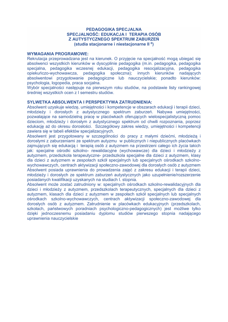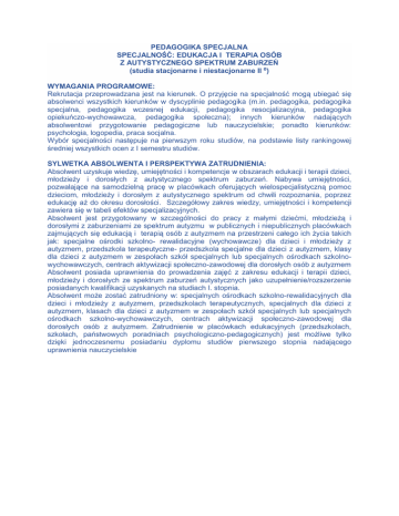 PEDAGOGIKA SPECJALNA SPECJALNOŚĆ: EDUKACJA I TERAPIA OSÓB Z AUTYSTYCZNEGO SPEKTRUM ZABURZEŃ (studia stacjonarne i niestacjonarne II ⁰) WYMAGANIA PROGRAMOWE: Rekrutacja przeprowadzana jest na kierunek. O przyjęcie na specjalność mogą ubiegać się absolwenci wszystkich kierunków w dyscyplinie pedagogika (m.in. pedagogika, pedagogika specjalna, pedagogika wczesnej edukacji, pedagogika resocjalizacyjna, pedagogika opiekuńczo-wychowawcza, pedagogika społeczna); innych kierunków nadających absolwentowi przygotowanie pedagogiczne lub nauczycielskie; ponadto kierunków: psychologia, logopedia, praca socjalna. Wybór specjalności następuje na pierwszym roku studiów, na podstawie listy rankingowej średniej wszystkich ocen z I semestru studiów. SYLWETKA ABSOLWENTA I PERSPEKTYWA ZATRUDNIENIA: Absolwent uzyskuje wiedzę, umiejętności i kompetencje w obszarach edukacji i terapii dzieci, młodzieży i dorosłych z autystycznego spektrum zaburzeń. Nabywa umiejętności, pozwalające na samodzielną pracę w placówkach oferujących wielospecjalistyczną pomoc dzieciom, młodzieży i dorosłym z autystycznego spektrum od chwili rozpoznania, poprzez edukację aż do okresu dorosłości. Szczegółowy zakres wiedzy, umiejętności i kompetencji zawiera się w tabeli efektów specjalizacyjnych. Absolwent jest przygotowany w szczególności do pracy z małymi dziećmi, młodzieżą i dorosłymi z zaburzeniami ze spektrum autyzmu w publicznych i niepublicznych placówkach zajmujących się edukacją i terapią osób z autyzmem na przestrzeni całego ich życia takich jak: specjalne ośrodki szkolno- rewalidacyjne (wychowawcze) dla dzieci i młodzieży z autyzmem, przedszkola terapeutyczne- przedszkola specjalne dla dzieci z autyzmem, klasy dla dzieci z autyzmem w zespołach szkół specjalnych lub specjalnych ośrodkach szkolnowychowawczych, centrach aktywizacji społeczno-zawodowej dla dorosłych osób z autyzmem Absolwent posiada uprawnienia do prowadzenia zajęć z zakresu edukacji i terapii dzieci, młodzieży i dorosłych ze spektrum zaburzeń autystycznych jako uzupełnienie/rozszerzenie posiadanych kwalifikacji uzyskanych na studiach I. stopnia. Absolwent może zostać zatrudniony w: specjalnych ośrodkach szkolno-rewalidacyjnych dla dzieci i młodzieży z autyzmem, przedszkolach terapeutycznych, specjalnych dla dzieci z autyzmem, klasach dla dzieci z autyzmem w zespołach szkół specjalnych lub specjalnych ośrodkach szkolno-wychowawczych, centrach aktywizacji społeczno-zawodowej dla dorosłych osób z autyzmem. Zatrudnienie w placówkach edukacyjnych (przedszkolach, szkołach, państwowych poradniach psychologiczno-pedagogicznych) jest możliwe tylko dzięki jednoczesnemu posiadaniu dyplomu studiów pierwszego stopnia nadającego uprawnienia nauczycielskie