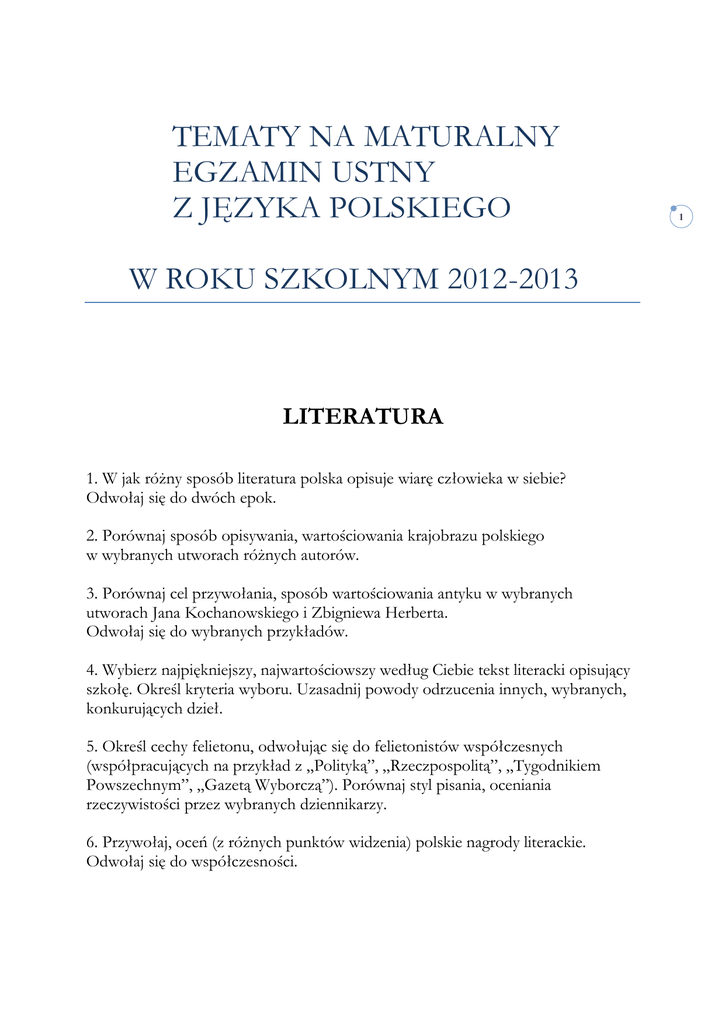 TEMATY NA MATURALNY EGZAMIN USTNY Z JĘZYKA POLSKIEGO W ROKU SZKOLNYM 2012-2013 LITERATURA 1. W jak różny sposób literatura polska opisuje wiarę człowieka w siebie? Odwołaj się do dwóch epok. 2. Porównaj sposób opisywania, wartościowania krajobrazu polskiego w wybranych utworach różnych autorów. 3. Porównaj cel przywołania, sposób wartościowania antyku w wybranych utworach Jana Kochanowskiego i Zbigniewa Herberta. Odwołaj się do wybranych przykładów. 4. Wybierz najpiękniejszy, najwartościowszy według Ciebie tekst literacki opisujący szkołę. Określ kryteria wyboru. Uzasadnij powody odrzucenia innych, wybranych, konkurujących dzieł. 5. Określ cechy felietonu, odwołując się do felietonistów współczesnych (współpracujących na przykład z „Polityką”, „Rzeczpospolitą”, „Tygodnikiem Powszechnym”, „Gazetą Wyborczą”). Porównaj styl pisania, oceniania rzeczywistości przez wybranych dziennikarzy. 6. Przywołaj, oceń (z różnych punktów widzenia) polskie nagrody literackie. Odwołaj się do współczesności. 1 7. Umieść polskie nagrody literackie na tle innych europejskich. Określ, oceń kryteria nagradzania twórców. Oceń wybrane, nagrodzone dzieła (na przykład z lat ostatnich). 8. Sposób, cel opisywania, wartościowania polityków w wybranych dziełach literackich. Odwołaj się do różnych przykładów. 9. Realistyczne zainteresowanie szczegółem. Przywołaj wybrane dzieła literackie europejskich realistów (zwracając uwagę na znaczenie realizmu i jego związek z dążeniami epoki). 10. Przemiany psalmu. Odwołując się do Jana Kochanowskiego, Tadeusza Nowaka (i ewentualnie innego twórcy), określ cel innowacji. 11. Co było egzotyczne w wybranej epoce dawnej Polski? Co egzotyczne bywa dzisiaj? Odwołaj się do światopoglądu epoki i jej sposobu definiowania egzotyczności w wybranych dziełach literackich. 12. Tytuł, motto, scena końcowa jako klucze do odczytywania sensu utworu. Odwołaj się do wybranych przykładów z różnych epok (pomiń utwory z podstawy programowej z poziomu podstawowego). 13. Bohater literatury greckiej i rzymskiej - co ich łączy, co dzieli? Odwołaj się do wybranych przykładów. 14. Człowiek w drodze - omów różne realizacje motywu, odwołując się do wybranych dzieł wieku XIX i XX. 15. Ewolucja ballady od Mickiewicza do Leśmiana - zaprezentuj zagadnienie, odwołując się do wybranych utworów. 16. Jak poeci opowiadają o sobie? Odwołaj się do wybranych przykładów z różnych epok. 17. Mój głos w sprawie czytania całych dzieł lub fragmentów arcydzieł literatury. Odwołaj się do wybranych utworów. 18. Czy spór między klasykami i romantykami jest dla mnie interesujący? Odpowiedz, eksponując zalety polemiki literackiej. 2 19. Zdrajcy wśród pisarzy - prawda czy fikcja? Odpowiedz, przywołując wybrane, konkretne przykłady (na przykład słynna sprawa Mochnackiego, Żeromskiego, twórców z „Hańby domowej” Trznadla, bohaterów „Zniewolonego umysłu” Miłosza). 20. Sposób, cel opisywania Węgrów lub Ukraińców w literaturze polskiej. Odwołaj się do wybranych dzieł. 21. Czy literatura polska utrwala stereotypy? Odpowiedz, odwołując się do argumentów zaczerpniętych z wybranych utworów literackich. 22. Jednakowo czy radykalnie różnie pojmowane jest szczęście w wybranych dziełach, pochodzących z dwóch niesąsiadujących ze sobą epok? Odwołaj się do wybranych przykładów. 23. Poświęcanie szczęścia osobistego dla kraju jest literackim ideałem czy życiową, potwierdzoną prawdą? Odwołaj się do wybranych dzieł literackich z różnych epok. 24. Jak na problemy mojego pokolenia zareagowałby Mickiewicz lub Sienkiewicz? Odpowiedz, odwołując się do dzieł wybranego twórcy (ewentualnie do wybranych utworów obu pisarzy). 25. W jakim celu literatura eksponuje wady, błędy człowieka? Określ, odwołując się do wybranych dzieł, ideałów epok, w których powstawały. 26. Smutek i melancholia jako motywy literackie. Przedstaw ich funkcjonowanie w wybranych utworach literatury rodzimej i obcej. 27. „Słowacki wielkim poetą był”. Odwołując się do wybranych dzieł wieszcza narodowego, podaj przyczyny, dla których Twoje pokolenie odrzuca lub aprobuje wielkość Słowackiego. 28. Profesor Pimko i jego zachwyty. Które dzieła literackie nie są przez Ciebie akceptowane (na przykład ze względu na przesłanie, dydaktyzm)? Uzasadnij swoje poglądy. 29. Przywołując wybrane przykłady komizmu (odwołując się do różnych epok), określ przemiany, jakim podlega poczucie humoru. 3 30. Odwołując się do pisarzy-mieszkańców wielkich miast i pisarzy z małych miejscowości, zbadaj czy miejsce tworzenia arcydzieł ma ścisły związek z miejscem zamieszkania. Przywołaj konkretne przykłady, analizy. 31. Jak dzisiaj ustosunkować się do „Chłopów” Reymonta jako epopei chłopskiej? Zachwycać się, dystansować czy ignorować? Jak dzisiaj oceniać fabułę, narrację dzieła noblisty? Przywołaj konkretne argumenty, umieść dzieło Reymonta w kontekście epoki, w której powstało. 32. Mój dialog z programem szkolnym. Określ wartość wybranych dzieł, których nie obejmuje program szkolny (odwołaj się do literatury Europy Środkowej, na dzieł wydanych przez „Czarne” czy „Pogranicze”). 33. Kariera Nikodema Dyzmy zawsze aktualna. Odwołaj się do wybranych dzieł eksponujących motyw nieoczekiwanej kariery i oceń jego walory artystyczne. 34. Moja ocena barokowych konceptów. Odwołaj się do wybranych liryków kilku twórców barokowych. Wyeksponuj cele literatury barokowej. 35. Jakie trudności trzeba pokonać, by sprostać zadaniu, które zapisał Mickiewicz w słynnym zdaniu o zbłądzeniu „Pana Tadeusza” pod strzechy? Jakiej kultury potrzebuje dzisiejsza wieś i prowincja? Odpowiedz, odwołując się do wybranych przykładów literackich, ankiet przeprowadzonych przez siebie w wybranym, innym niż d