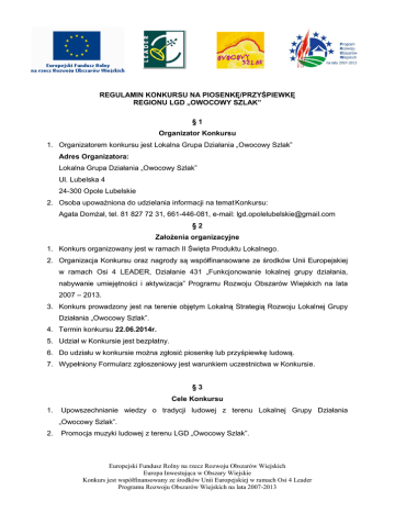 REGULAMIN KONKURSU NA PIOSENKĘ/PRZYŚPIEWKĘ REGIONU LGD „OWOCOWY SZLAK” §1 Organizator Konkursu 1. Organizatorem konkursu jest Lokalna Grupa Działania „Owocowy Szlak” Adres Organizatora: Lokalna Grupa Działania „Owocowy Szlak” Ul. Lubelska 4 24-300 Opole Lubelskie 2. Osoba upoważniona do udzielania informacji na temat Konkursu: Agata Domżał, tel. 81 827 72 31, 661-446-081, e-mail: [email protected] §2 Założenia organizacyjne 1. Konkurs organizowany jest w ramach II Święta Produktu Lokalnego. 2. Organizacja Konkursu oraz nagrody są współfinansowane ze środków Unii Europejskiej w ramach Osi 4 LEADER, Działanie 431 „Funkcjonowanie lokalnej grupy działania, nabywanie umiejętności i aktywizacja” Programu Rozwoju Obszarów Wiejskich na lata 2007 – 2013. 3. Konkurs prowadzony jest na terenie objętym Lokalną Strategią Rozwoju Lokalnej Grupy Działania „Owocowy Szlak”. 4. Termin konkursu 22.06.2014r. 5. Udział w Konkursie jest bezpłatny. 6. Do udziału w konkursie można zgłosić piosenkę lub przyśpiewkę ludową. 7. Wypełniony Formularz zgłoszeniowy jest warunkiem uczestnictwa w Konkursie. §3 Cele Konkursu 1. Upowszechnianie wiedzy o tradycji ludowej z terenu Lokalnej Grupy Działania „Owocowy Szlak”. 2. Promocja muzyki ludowej z terenu LGD „Owocowy Szlak”. Europejski Fundusz Rolny na rzecz Rozwoju Obszarów Wiejskich Europa Inwestująca w Obszary Wiejskie Konkurs jest współfinansowany ze środków Unii Europejskiej w ramach Osi 4 Leader Programu Rozwoju Obszarów Wiejskich na lata 2007-2013 3. Promocja obszaru objętego Lokalną Strategią Rozwoju tj. obszaru gmin Opole Lubelskie, Poniatowa, Chodel, Józefów nad Wisłą, Karczmiska, Wilków i Łaziska. 4. Aktywizacja mieszkańców obszaru objętego Lokalną Strategią Rozwoju. 5. Rozwój turystyki opartej na kulturze ludowej i dziedzictwie. §4 Warunki uczestnictwa 1. Konkurs kierowany jest do kapeli i zespołów działających na terenie Lokalnej Grupy Działania „Owocowy Szlak”. 2. Uczestnikami konkursu mogą być kapele i zespoły ludowe. 3. Każda kapela/zespół może zgłosić jedną piosenkę/przyśpiewkę. 4. Piosenka/przyśpiewka, która może zostać zgłoszona w konkursie powinna kojarzyć się z obszarem i miejscem LGD „Owocowy Szlak”. 5. Warunkiem uczestnictwa w konkursie jest złożenie karty zgłoszeniowej. Kartę należy złożyć w biurze LGD „Owocowy Szlak” lub przesłać mailem na adres [email protected]. 8. Zgłoszenia należy nadsyłać/składać w terminie do 06.06.2014 r. do godziny 15.00. 9. Zgłoszenia uczestników, które wpłyną do Biura LGD po terminie określonym w § 4 pkt. 9, nie będą mogły brać udziału w konkursie. §5 Przebieg konkursu 1. Konkurs zostanie przeprowadzony w dniu 22 czerwca 2013r. w Opolu Lubelskim w Parku Miejskim w amfiteatrze. 2. Konkurs będzie polegał na: przedstawieniu piosenki/przyśpiewki podczas odbywającego się II Święta Produktu Lokalnego w czasie ustalonym przez organizatora 3. Każdy wykonawca będzie mógł zaprezentować również inne utwory poza konkursem w celu promocji swojego zespołu. 4. Rozstrzygnięcie konkursu i wręczenie nagród przewidziane jest w przeprowadzanego konkursu po podsumowaniu przez Komisję wyników konkursu. §6 Kryteria oceny 1. Nad oceną konkursu będzie czuwała komisja powołane przez LGD. Europejski Fundusz Rolny na rzecz Rozwoju Obszarów Wiejskich Europa Inwestująca w Obszary Wiejskie Konkurs jest współfinansowany ze środków Unii Europejskiej w ramach Osi 4 Leader Programu Rozwoju Obszarów Wiejskich na lata 2007-2013 dniu 2. Skład komisji zostanie ogłoszony w dniu, w którym będą oceniane konkursy. 3. Oceniając piosenkę/przyśpiewkę komisja będzie brała pod uwagę: dobór repertuaru zachowanie ludowego charakteru i związek z regionem czystość gwary i poprawna dykcja interpretacja i wyraz artystyczny wygląd zewnętrzny – występ w stroju regionalnym zachowanie stylu wykonawczego zgodnego z obyczajem czystość brzmienia §7 Nagrody w konkursie 1. Dla uczestników konkursu przewidziane są dyplomy. Nagrody rzeczowe przewidziane są za zajecie trzech pierwszych miejsc. Dodatkowo zwycięzcy otrzymają statuetki LGD. 2. Informacja o zwycięzcach konkursu zostanie zamieszczona na stronie internetowej Lokalnej Grupy Działania „Owocowy Szlak” www.lgdowocowyszlak.pl. §8 Dodatkowe regulacje 1. Zgłoszenie do konkursu jest jednoznaczne z przyjęciem warunków niniejszego regulaminu. 2. Decyzje komisji są ostateczne i wiążące dla Uczestników. 3. Uczestnicy zgadzają się na wykorzystanie wizerunku oraz danych osobowych w materiałach promocyjnych. Europejski Fundusz Rolny na rzecz Rozwoju Obszarów Wiejskich Europa Inwestująca w Obszary Wiejskie Konkurs jest współfinansowany ze środków Unii Europejskiej w ramach Osi 4 Leader Programu Rozwoju Obszarów Wiejskich na lata 2007-2013