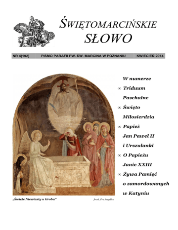 ŚWIĘTOMARCIŃSKIE SŁOWO NR 4(192) PISMO PARAFII PW. ŚW. MARCINA W POZNANIU KWIECIEŃ 2014 W numerze • Triduum Paschalne • Święto Miłosierdzia • Papież Jan Paweł II i Urszulanki • O Papieżu Janie XXIII • Żywa Pamięć o zamordowanych w Katyniu „Święte Niewiasty u Grobu” fresk, Fra Angelico 2 ŚWIĘTOMARCIŃSKIE SŁOWO „Zmartwychwstał już Chrystus, Pan mój i nadzieja” Gdy wielkanocne dzwony obwieszczają nam Zmartwychwstanie Chrystusa Pana, w przededniu kanonizacji naszego Umiłowanego Papieża Jana Pawła II przywołajmy tak zawsze drogie nam Jego ojcowskie słowa, które niech będą naszymi wyjątkowymi tegorocznymi życzeniami świątecznymi. „Ty, Odkupicielu człowieka, powstajesz dziś z grobu zwycięski, aby, niepokojonym przez mroki licznych zagrożeń, ofiarować Twoje życzenie radości i pokoju. Do Ciebie, o Chryste, nasze Życie i nasz Przewodniku, niech się zwróci każdy, kogo dręczy lęk i zniechęcenie, aby usłyszeć przesłanie nadziei, która nie zawodzi. W tym dniu Twego zwycięstwa nad śmiercią pomóż nam, Panie, odnaleźć w Tobie odwagę, aby solidarnie stawić czoło tylu przejawom zła, które nam zagraża”. Niech te słowa Świętego Jana Pawła II zachęcają nas do kontemplacji Zmartwychwstałego Pana, „żeby w głębi naszych serc zabrzmiał Jego głos i abyśmy stali się naprawdę świadkami Jego wiecznotrwałego orędzia Miłosierdzia, miłości i pokoju - poprzez naszą silną wiarę i szlachetne zaangażowanie w autentyczne przeżywanie chrześcijaństwa”. Duszpasterze Z okazji Wielkiego Czwartku, Ustanowienia Eucharystii i Kapłaństwa, które jest największym darem i szczególnym powołaniem do uczestniczenia w tajemnicy Chrystusa, pragniemy wyrazić wdzięczność za posługę naszym duszpasterzom i złożyć najszczersze życzenia słowami bł. Jana Pawła II: „Przeżywajcie w pełni swoje poświęcenie się Bogu, aby nie zabrakło w świecie tego promienia Bożego piękna, który rozjaśnia drogę ludzkiej egzystencji. Chrześcijanie, pogrążeni w trudach i troskach tego świata, ale tak jak wy powołani do świętości, pragną dostrzegać w Was serce oczyszczone, które oczyma wiary «widzą» Boga ludzi poddających się ulegle działaniu Ducha Świętego, dochowujących wierności charyzmatowi swego powołania i misji. (…) Nie zapominajcie, że to Wy właśnie w bardzo szczególny sposób możecie i powinniście głosić, iż nie tylko należycie do Chrystusa, ale «staliście się Chrystusem»! Parafianie ŚWIĘTOMARCIŃSKIE SŁOWO 3 ŚWIĘTE TRIDUUM PASCHALNE WIELKI CZWARTEK - Msza Wieczerzy Pańskiej W ten wieczór gromadzimy się w naszym parafialnym wieczerniku wokół Chrystusa Pana, jak uczniowie na Ostatniej Wieczerzy. Uczestniczymy w tych samych wydarzeniach. Ten sam Jezus zaprasza nas do wspólnego stołu. Chrystus bierze chleb i wino, i przemienia je w swoje Ciało i Krew, aby nas wszystkich nakarmić. Czyni to wszystko z miłości ku nam. Zanim odejdzie do Ojca zostawia nam Testament miłości, mimo nocy zdrady i niewierności, mimo bliskiej męki i śmierci krzyżowej. Tym Testamentem jest On sam. Pozostał z nami pod osłoną znaków sakramentalnych, zwłaszcza Eucharystii i Kapłaństwa, których ustanowienie tego dnia wspominamy, dlatego szczególnie pamiętamy w tym dniu o naszych duszpasterzach i o przygotowujących się do kapłańskiej posługi. Odchodząc, Chrystus zobowiązał nas jednak do wzajemnej miłości. Zostawił nam wymowny przykład: umywając nogi swoim uczniom, kazał nam kierować się w życiu tą samą zasadą miłości „To jest moje przykazanie, abyście się wzajemnie miłowali, tak jak ja was umiłowałem” (J 15,12) W czasie liturgii podczas uroczystej procesji przenosimy Najświętszy Sakrament do Ołtarza Adoracji tzw. „ciemnicy”, która w naszej świątyni ma wyraz więzienia, w którym przebywa Pan, aż do Liturgii Wielkiego Piątku. Trwamy tam na adoracji Chrystusa ukrytego w tajemnicy Miłości. Rozważamy modlitwę i konanie w Ogrójcu. WIELKI PIĄTEK - Liturgia na cześć Męki Pańskiej W skupieniu i ciszy gromadzimy się w Wielki Piątek na sprawowaniu pamiątki męki i śmierci Pana naszego Jezusa Chrystusa, jest to dzień, w którym na całym świecie nie odprawia się Mszy Świętej, lecz przeżywa liturgię Męki Pańskiej, która zaprasza przede wszystkim do rozważenia biblijnego opisu męki Pana Jezusa, a następnie do adoracji i uczczenia Krzyża świętego. Na początku po dojściu procesji do ołtarza kapłan, który przewodniczy liturgii, na znak uniżenia leży krzyżem na posadzce prezbiterium. Nabożeństwo wielkopiątkowe rozpoczyna się liturgią słowa, w której naczelne miejsce zajmuje opis Męki Pańskiej według Św. Jana, który w naszej parafii wykonuje kapłan wraz z lektorami. Po homilii następuje wyjątkowo uroczysta modlitwa powszechna, w której staramy się nie zapomnieć o nikim, bo wszystkich obmyła Krew Chrystusa przelana na krzyżu. Punktem szczytowym całej liturgii jest adoracja Krzyża i wspólna Komunia Święta. Nasz stary drewniany krzyż, który podawany jest do ucałowania pociąga wielkie rzesze parafian do kontemplacji ran Chrystusowych. Zgodnie ze zwyczajem na zakończenie nabożeństwa, eucharystyczne Ciało Chrystusa, które na zawsze pozostanie gwarancją naszego zmartwychwstania, a tym samym naszego wyzwolenia z niewoli grzechu i śmierci, zostaje uroczyście przeniesione do tzw. Grobu Pańskiego, który szczególnie w naszej świątyni zatrzymuje wiernych na chwile cichej modlitwy. WIGILIA PASCHALNA W WIELKĄ NOC W tę najświętszą noc Kościół wzywa swoje dzieci rozproszone po całym świecie, aby zgromadziły się na czuwaniu i modlitwie w oczekiwaniu tego, co przyniesie ta noc „Błogosławiona noc, w której się łączy niebo z ziemią, sprawy boskie ze sprawami ludzkimi”. Noc paschalną rozjaśnia zmartwychwstały Chrystus. Tajemnica Paschy Chrystusa, przejścia ze śmierci d