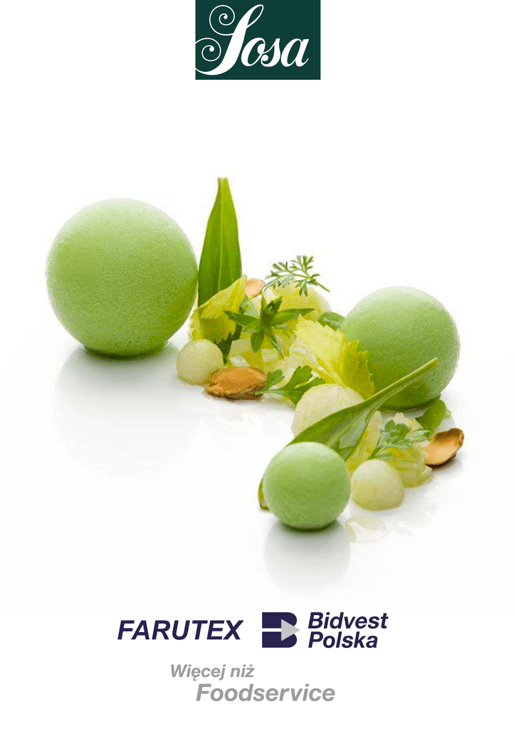 CZYM JEST LIOFILIZACJA? Liofilizacja to proces suszenia produktu po wcześniejszym jego zamrożeniu. Dzięki tej metodzie, nawet do 96 %, usuwana jest woda z produktu. Liofilizaty to najbardziej naturalne oraz aromatyczne produkty. Liofilizowane warzywa Nr indeksu Nazwa polska Nazwa angielska Waga T144:18711 Pomidory dojrzałe (plastry) Freeze dried ripe tomato 25 g T144:18722 Pomidory cherry (połówki) Freeze dried cherry tomato 50 g T144:18724 Cebulki (całe) Pearl onion freeze dried 60 g T144:18723 Groszek (cały) Freeze dried peas 150 g T144:18525 Burak (plastry) Freeze dried red beet 30 g T144:18509 Burak (puder) Freeze dried beet root 300 g CZYM SĄ PASTY? Pasty to wysokiej jakości naturalnie przetworzone produkty spożywcze o płynnej konsystencji i bogatym aromacie. Wykorzystywane przede wszystkim w cukiernictwie. Pasty T144:18719 Pistacje z ciasteczkami Pralicroc pistachio 2,3 kg Instangel animal gelatine 500 g Stabilizator musów T144:18720 Instangel (zwierzęcy) 2 CZYM JEST AIR BAG? Air bag to zarówno dodatek do panierek jak i samodzielny produkt. Air bag T144:19253 Pszeniczna (gruba) Air bag wheat ground 750 g T144:19254 Wieprzowa (drobna) Air bag flour 600 g T144:18716 Wieprzowa (gruba) Air bag pork granet 750 g T144:19808 Ziemniaczana (ziarnista) Air bag potato ground 750 g CZYM JEST PETA CRISPY? Peta crispy to cukry strzelające występujące w wielosmakowych powłokach. Doskonały dodatek do deserów i koktajli. Peta crispy 400 g T144:18098 Crispy malinowe (wodoodporne) T144:18510 Crispy truskawkowe (jogurtowa) Yoghurt-strawberry crispy 150 g T144:18526 Crispy truskawkowe (wodoodporne) Strawberry crispy wet proof 400 g T144:18727 Crispy marakuja (wodoodporne) Passion crispy wet proof 400 g T144:18739 Crispy jogurtowe (wodoodporne) Yogurt crispy wet proof 400 g Elastic 750 g Żelifikacja T144:18721 Elastic (puder) Pektyny T144:18706 Pektyna owocowa (NH) Fruit pectin nh 500 g T144:18707 Pektyna xoco nappage X58 Pectina xoco nappage X58 500 g 3 Barwniki spożywcze w pudrze T144:18740 Kolorant w pudrze - czarny Black powder 20 g T144:18741 Kolorant w pudrze - purpurowy Purple powder 50 g T144:18742 Kolorant w pudrze - niebieski Blue powder 50 g T144:18743 Kolorant w pudrze - turkusowy Turquesa powder 50 g T144:18744 Kolorant w pudrze - brązowy Brown powder 50 g T144:18745 Kolorant w pudrze - burgund Burgundy powder 50 g T144:18746 Kolorant w pudrze - czerwony Red powder 50 g T144:18747 Kolorant w pudrze - matowy pomarańczowy Mate orange powder 50 g T144:18748 Kolorant w pudrze - lśniący pomarańczowy Shiny orange powder 50 g T144:18749 Kolorant w pudrze - żółty jajeczny Egg yolk yellow powder 50 g T144:18750 Kolorant w pudrze - żółty Yellow lemon powder 50 g T144:18751 Kolorant w pudrze - miętowy Mint green powder 50 g T144:18752 Kolorant w pudrze - zielone kiwi Kiwi green powder 50 g T144:18753 Kolorant w pudrze - oliwkowy Olive green powder 50 g T144:18754 Kolorant w pudrze - miedziany Cooper powder 20 g T144:18755 Kolorant w pudrze - złoty Gold powder colouring 30 g T144:18756 Kolorant w pudrze - srebrny Silver powder colouring 20 g T144:18757 Kolorant w pudrze - srebrno-niebieski Silver blue powder 40 g T144:20085 Kolorant do tłuszczu w pudrze - zielony Oil soluble green lace powder 30 g T144:20084 Kolorant do tłuszczu w pudrze - czerwony Oil soluble red lace powder 30 g Napowietrzanie T144:17974 Albumina (puder) Albumina 500 g T144:18436 Proespuma cold (puder) Proespuma cold 700 g T144:18437 Proespuma hot (puder) Proespuma hot 500 g T144:18798 Bubble (puder) Bubble 500 g 4 Aromaty T144:18704 Aromat - mech Moss aroma 7g T144:18715 Aromat - ziemia Humit soil aroma 7g T144:18758 Aromat - fasola tonka Tonka bean nat.(35)aroma 7g T144:18759 Aromat - kasztan Chestnut (14)aroma 7g T144:18760 Aromat - cynamon Cinnamon nat.(18)aroma 7g T144:18761 Aromat - borowik King bolete (76)aroma 7g T144:18762 Aromat - biała trufla White truffle (79)aroma 7g T144:18763 Aromat - siano Hay natural (94)aroma 7g T144:18764 Aromat - wata cukrowa Cotton candy (175)aroma 7g T144:18765 Aromat - owoce leśne Wild strawberry (127)aroma 7g T144:18766 Aromat - energy drink Energy drink (170)aroma 7g T144:18915 Alfabet 192 aromatów Alphabet of flavours box Emulsyfikacja T144:18799 Natural emul (puder) Natur emul 500 g Xanthana gum 500 g Zagęszczacze T144:20083 Guma Xantana 6 Cukry T144:18709 Cukier marakuja Sugar passion fruit 500 g T144:18717 Cukier truskawkowy Sugar strawbeery 500 g T144:18725 Cukier ananasowy Sugar pineapple 500 g T144:18726 Cukier zielona herbata Sugar tea 500 g CZYM SĄ CUKRY TECHNOLOGICZNE Podstawowym zadaniem cukrów technologicznych są ich właściwości słodzące. Odgrywają rolę w nadawaniu objętości i tekstury produktom żywnościowym Cukry technologiczne T144:17975 Isomalt Isomalt Refined 1 kg T144:18708 Laktoza Lactosa in powder 750 g T144:18710 Dekstroza Dextrose 750 g T144:18712 Fresh (Xilitol) Fresh xilitol 750 g T144:18713 Inwertowany cukier (w płynie) Invert sugar 1,4 kg T144:18714 Glukoza (w płynie) Liquid glucose 1,7 kg T144:18718 Fruktoza Fructose powder 1 kg 5