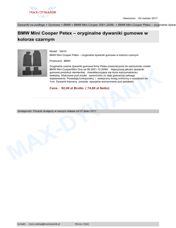 Utworzono : 02 marzec 2017 Dywaniki na podłoge > Gumowe > BMW > BMW Mini Cooper 2001-2006r. > BMW Mini Cooper Petex – oryginalne dywan BMW Mini Cooper Petex – oryginalne dywaniki gumowe w kolorze czarnym Model : 16410 BMW Mini Cooper Petex – oryginalne dywaniki gumowe w kolorze czarnym Producent : BMW Oryginalne czarne dywaniki gumowe firmy Petex przeznaczone do samochodu model BMW Mini Cooper/Mini One od 08.2001-10.2006r. Najwyższej jakości dywaniki gumowe produkcji niemieckiej charakteryzujące się duża wytrzymałością i estetyką. Wykonane pod model samochodu co daje gwarancje pełnego dopasowania. Posiadają funkcjonalny i estetyczny brzeg ochronny o wysokości do 1cm. Dywanik kierowcy posiada specjalne wzmocnienie pod pedałami. Cena : 92,00 zł Brutto ( 74,80 zł Netto) A W K I N Y D X A M Dostępność: Produkt dostępny w naszym sklepie od 07 lipiec 2011 kontakt : - [email protected] Strona 1/{nb}