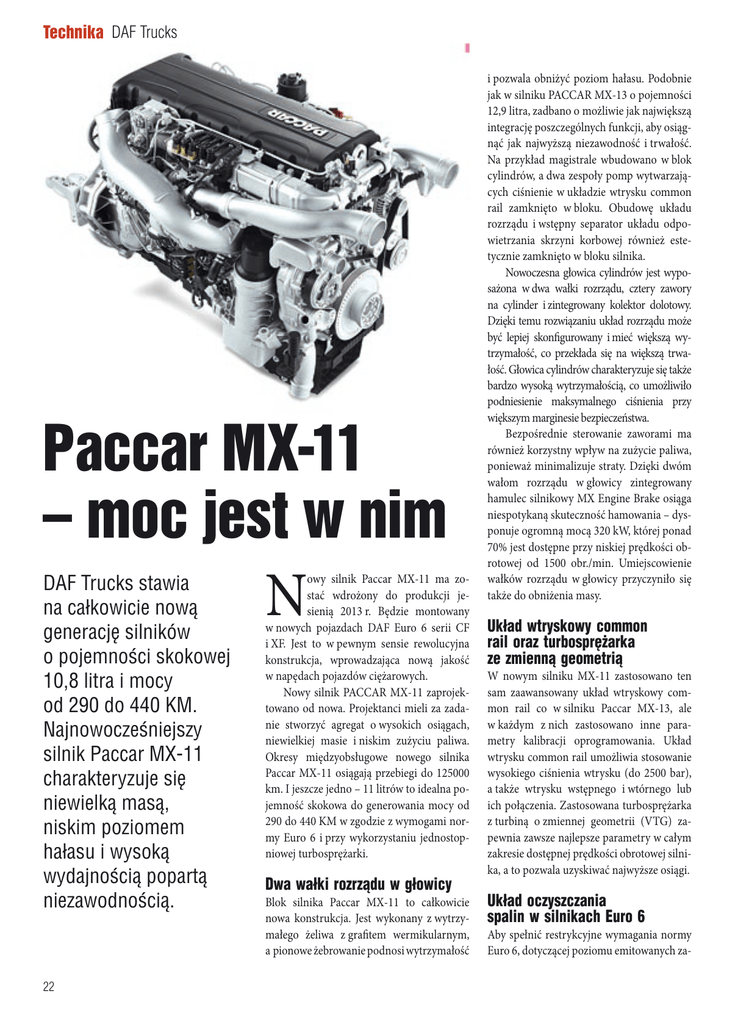 Technika DAF Trucks Paccar MX-11 – moc jest w nim DAF Trucks stawia na całkowicie nową generację silników o pojemności skokowej 10,8 litra i mocy od 290 do 440 KM. Najnowocześniejszy silnik Paccar MX-11 charakteryzuje się niewielką masą, niskim poziomem hałasu i wysoką wydajnością popartą niezawodnością. 22 N owy silnik Paccar MX-11 ma zostać wdrożony do produkcji jesienią 2013 r. Będzie montowany w nowych pojazdach DAF Euro 6 serii CF i XF. Jest to w pewnym sensie rewolucyjna konstrukcja, wprowadzająca nową jakość w napędach pojazdów ciężarowych. Nowy silnik PACCAR MX-11 zaprojektowano od nowa. Projektanci mieli za zadanie stworzyć agregat o wysokich osiągach, niewielkiej masie i niskim zużyciu paliwa. Okresy międzyobsługowe nowego silnika Paccar MX-11 osiągają przebiegi do 125000 km. I jeszcze jedno – 11 litrów to idealna pojemność skokowa do generowania mocy od 290 do 440 KM w zgodzie z wymogami normy Euro 6 i przy wykorzystaniu jednostopniowej turbosprężarki. Dwa wałki rozrządu w głowicy Blok silnika Paccar MX-11 to całkowicie nowa konstrukcja. Jest wykonany z wytrzymałego żeliwa z grafitem wermikularnym, a pionowe żebrowanie podnosi wytrzymałość i pozwala obniżyć poziom hałasu. Podobnie jak w silniku PACCAR MX-13 o pojemności 12,9 litra, zadbano o możliwie jak największą integrację poszczególnych funkcji, aby osiągnąć jak najwyższą niezawodność i trwałość. Na przykład magistrale wbudowano w blok cylindrów, a dwa zespoły pomp wytwarzających ciśnienie w układzie wtrysku common rail zamknięto w bloku. Obudowę układu rozrządu i wstępny separator układu odpowietrzania skrzyni korbowej również estetycznie zamknięto w bloku silnika. Nowoczesna głowica cylindrów jest wyposażona w dwa wałki rozrządu, cztery zawory na cylinder i zintegrowany kolektor dolotowy. Dzięki temu rozwiązaniu układ rozrządu może być lepiej skonfigurowany i mieć większą wytrzymałość, co przekłada się na większą trwałość. Głowica cylindrów charakteryzuje się także bardzo wysoką wytrzymałością, co umożliwiło podniesienie maksymalnego ciśnienia przy większym marginesie bezpieczeństwa. Bezpośrednie sterowanie zaworami ma również korzystny wpływ na zużycie paliwa, ponieważ minimalizuje straty. Dzięki dwóm wałom rozrządu w głowicy zintegrowany hamulec silnikowy MX Engine Brake osiąga niespotykaną skuteczność hamowania – dysponuje ogromną mocą 320 kW, której ponad 70% jest dostępne przy niskiej prędkości obrotowej od 1500 obr./min. Umiejscowienie wałków rozrządu w głowicy przyczyniło się także do obniżenia masy. Układ wtryskowy common rail oraz turbosprężarka ze zmienną geometrią W nowym silniku MX-11 zastosowano ten sam zaawansowany układ wtryskowy common rail co w silniku Paccar MX-13, ale w każdym z nich zastosowano inne parametry kalibracji oprogramowania. Układ wtrysku common rail umożliwia stosowanie wysokiego ciśnienia wtrysku (do 2500 bar), a także wtrysku wstępnego i wtórnego lub ich połączenia. Zastosowana turbosprężarka z turbiną o zmiennej geometrii (VTG) zapewnia zawsze najlepsze parametry w całym zakresie dostępnej prędkości obrotowej silnika, a to pozwala uzyskiwać najwyższe osiągi. Układ oczyszczania spalin w silnikach Euro 6 Aby spełnić restrykcyjne wymagania normy Euro 6, dotyczącej poziomu emitowanych za- nieczyszczeń, firma DAF stosuje różne technologie oczyszczania gazów spalinowych, takie jak katalizator SCR i aktywny filtr cząstek stałych. Kolektor wydechowy oraz najważniejsze elementy układu wydechowego zostały zamknięte w obudowie. Jeśli mimo to temperatura spalin będzie zbyt niska ze względu na sposób użytkowania pojazdu, silnik zostanie przełączony do trybu aktywnej regeneracji. W tym celu za turbosprężarką, a przed filtrem cząstek stałych, umieszczono siódmy wtryskiwacz. Może on wtryskiwać paliwo do katalizatora utleniającego w układzie wydechowym, aby wytworzyć odpowiednią ilość ciepła. Również katalizator SCR został zaprojektowany w taki sposób, aby utrzymywać optymalną temperaturę. Dzięki odpowiednio dobranej powłoce może on osiągać maksymalną skuteczność w różnych zakresach temperatur, co przekłada się na optymalną wydajność pracy silnika. Ponieważ zużycie oleju w silniku PACCAR MX-11 jest niewielkie i równomierne, filtr cząstek stałych może nie wymagać czyszczenia nawet przez 500000 kilometrów, jeżeli sprzyja temu sposób eksploatacji pojazdu. Innym wyjątkowym rozwiązaniem jest możliwość niezależnego zamontowania katalizatora SCR i filtra cząstek stałych po przeciwnych stronach podwozia. Jest to przydatne, jeżeli samochód ma być wyposażony w podpory żurawia lub zamki kontenerów wymiennych. warów na obszarze miasta, regionu lub kraju. Do ciężkich zastosowań dostępne są silniki o mocach 291 kW/400 KM i 320 kW/440 KM, dysponujące maksymalnym momentem obrotowym odpowiednio 1900 i 2100 Nm (w zakresie 1000–1450 obr./min). Duże momenty przy niskiej prędkości obrotowej, bardzo niskie zużycie paliwa, wiodąca na rynku niezawodność i jeszcze więcej opcji przystawek PTO powodują, że silnik PACCAR MX-11 będzie jedną z najważniejszych jednostek napędowych uniwersalnej wersji CF, której nowy model Euro 6 zostanie wprowadzony do sprzedaży w kwietniu. Silnik PACCAR MX-11 jest również cennym dodatkiem do serii DAF Euro 6 XF. Zużycie paliwa silnika PACCAR MX-11 o pojemności 10,8 litra jest średnio nawet do 3% niższe od znanego z oszczędności silnika PACCAR MX-13 o pojemności 12,9 litra, a obniżenie masy o ponad 180 kilogramów daje jeszcze większe możliwości podnoszenia wydajności, szczególnie przy transporcie materiałów sypkich oraz płynnych. Zbigniew Witamborski Liczne innowacje Liczne innowacje wprowadzone w nowym silniku PACCAR MX-11, takie jak pojedynczy pasek wieloklinowy i wentylator zamontowany bezpośred