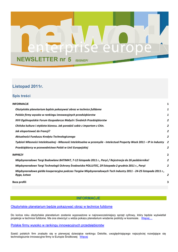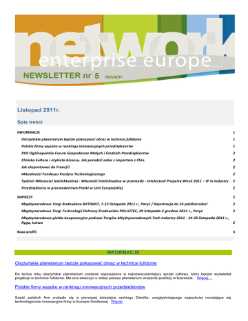 Listopad 2011r. Spis treści INFORMACJE 1 Olsztyoskie planetarium będzie pokazywad obraz w technice fulldome 1 Polskie firmy wysoko w rankingu innowacyjnych przedsiębiorstw 1 XVII Ogólnopolskie Forum Gospodarcze Małych i Średnich Przedsiębiorstw 2 Chioska kultura i etykieta biznesu. Jak poradzid sobie z importem z Chin. 2 Jak eksportowad do Francji? 2 Aktualności Funduszu Kredytu Technologicznego 2 Tydzieo Własności Intelektualnej - Własnośd Intelektualna w przemyśle - Intelectual Property Week 2011 – IP in Industry 2 Przedsiębiorcy w przewodnictwo Polski w Unii Europejskiej 2 IMPREZY 2 Międzynarodowe Targi Budowlane BATIMAT, 7-12 listopada 2011 r., Paryż / Rejestracja do 26 października! 2 Międzynarodowe Targi Technologii Ochrony Środowiska POLLUTEC, 29 listopada-2 grudnia 2011 r., Paryż 2 Międzynarodowa giełda kooperacyjna podczas Targów Międzynarodowych Tech Industry 2011 - 24-25 listopada 2011 r., Ryga, Łotwa 2 Baza profili 3 INFORMACJE Olsztyńskie planetarium będzie pokazywać obraz w technice fulldome Do końca roku olsztyńskie planetarium zostanie wyposażone w najnowocześniejszy sprzęt cyfrowy, który będzie wyświetlał projekcje w technice fulldome. Ma ona stworzyć u widza pokazu planetarium wrażenie podróży w kosmosie. Więcej ... Polskie firmy wysoko w rankingu innowacyjnych przedsiębiorstw Sześć polskich firm znalazło się w pierwszej dziesiątce rankingu Deloitte, uwzględniającego najszybciej rozwijające się technologicznie innowacyjne firmy w Europie Środkowej Więcej XVII Ogólnopolskie Forum Gospodarcze Małych i Średnich Przedsiębiorstw XVII Ogólnopolskie Forum Gospodarcze Małych i Średnich Przedsiębiorstw „Finanse i innowacyjność w rozwoju MSP” Potrzeby inwestycyjne małych i średnich przedsiębiorstw oraz źródła ich finansowania. Więcej Chińska kultura i etykieta biznesu. Jak poradzić sobie z importem z Chin. Zaproszenie na bezpłatne szkolenie - 14 listopada 2011r., Olsztyn, Plac Gen. J. Bema 3 Warsztat poprowadzi Pan Darren Chong, reprezentujący firmę ConnectAsia, trener posiadający międzykulturową wiedzę oraz wieloletnie doświadczenie w zakresie relacji biznesowych pomiędzy Europą i Azją. Współpracuje z wieloma polskimi firmami, szukającymi swej drogi do azjatyckich rynków. Do tej pory Pan Darren Chong poprowadził już ponad 200 seminariów! Więcej … Jak eksportować do Francji? Zapraszamy do uczestnictwa w ostatnim z cyklu internetowych seminariów skierowanych do przedstawicieli przedsiębiorstw zainteresowanych eksportem dóbr i usług do Francji. Więcej… Aktualności Funduszu Kredytu Technologicznego Komunikat w sprawie naboru wniosków - Kredyt Technologiczny. Bank Gospodarstwa Krajowego jako Instytucja Wdrażająca działanie 4.3 Kredyt technologiczny PO IG informuje, że Minister Gospodarki - dysponent Funduszu Kredytu Technologicznego dokonał zmiany planu finansowego funduszu na rok 2011. Więcej… Tydzień Własności Intelektualnej - Własność Intelektualna w przemyśle - Intelectual Property Week 2011 – IP in Industry W dniu 7 grudnia w Brukseli odbędzie się Konferencja poświęcona innowacji, transferowi technologii i patentowi jednolitemu w UE. Konferencja odbędzie się w czasie Tygodnia Własności Intelektualnej - IP Week. Więcej … Przedsiębiorcy w przewodnictwo Polski w Unii Europejskiej Polityka unijna prowadzona na rzecz przedsiębiorców ma na celu zwiększenia konkurencyjności europejskich małych i średnich przedsiębiorstw na rynku. Więcej… IMPREZY Międzynarodowe Targi Budowlane BATIMAT, 7-12 listopada 2011 r., Paryż / Rejestracja do 26 października! Polska Agencja Rozwoju Przedsiębiorczości oraz Wydział Promocji Handlu i Inwestycji Ambasady RP w Paryżu mają przyjemność zaprosić Państwa do udziału w Międzynarodowych Targach Budowlanych BATIMAT 2011, które odbędą się w dniach 7-12 listopada 2011 r. w Paryżu. Więcej … Międzynarodowe Targi Technologii Ochrony Środowiska POLLUTEC, 29 listopada-2 grudnia 2011 r., Paryż Polska Agencja Rozwoju Przedsiębiorczości ma przyjemność zaprosić Państwa do udziału w Międzynarodowych Targach Technologii Ochrony Środowiska Pollutec Horizons, które odbędą się w dniach 29 listopada - 2 grudnia 2011 r. w Paryżu .. Więcej… Międzynarodowa giełda kooperacyjna podczas Targów Międzynarodowych Tech Industry 2011 - 24-25 listopada 2011 r., Ryga, Łotwa Międzynarodowej giełdzie kooperacyjnej organizowanej podczas Międzynarodowych Targów Tech Industry 2011. Giełda odbędzie się w dniach 24-25 listopada 2011 r. w Rydze (Łotwa). Więcej … Baza profili 20110901012 Belgijska firma działająca w przemyśle samochodowym, transportowym i przemysłowym poszukuje agentów sprzedażowych/dystrybutorów i partnerów biznesowych do wspólnego przedsięwzięcia (joint venture) w różnych krajach europejskich. 20110902011 Belgijska firma specjalizująca się w produkcji produktów czekoladowych takich jak muszelki, pralinki, trufle itp. poszukuje dystrybutorów/importerów . 20110902034 Belgijska firma przewoźnicza poszukuje agentów/firm transportowych, które mogą rozwiązać problemy logistyczne z rozwiązaniami lokalnymi. 20110908007 Belgijska firma specjalizująca się w taśmociągach poszukuje podwykonawcy/dostawcy gumowych taśmociągów standardowej jakości. 20110908018 20110908024 Belgijska firma specjalizująca się w handlu produktami dla rynku budowlanego oferuje usługi pośrednictwa na rynku dla producentów lub bezpośrednich dostawców materiałów budowlanych dla dużych projektów. Belgijska firma specjalizująca się w tworzeniu i implementacji oceny talentu przez internet i rozwiązań zarządzania poszukuje organizacji aktywnej i doświadczonej na polu doradztwa na temat zasobów ludzkich w celu ustanowienia porozumień o dystrybucji. 20110908006 Duńska firma produkuje i sprzedaje przenośniki kubełkowe poszukuje partnerów, pośrednictwa handlowego (age